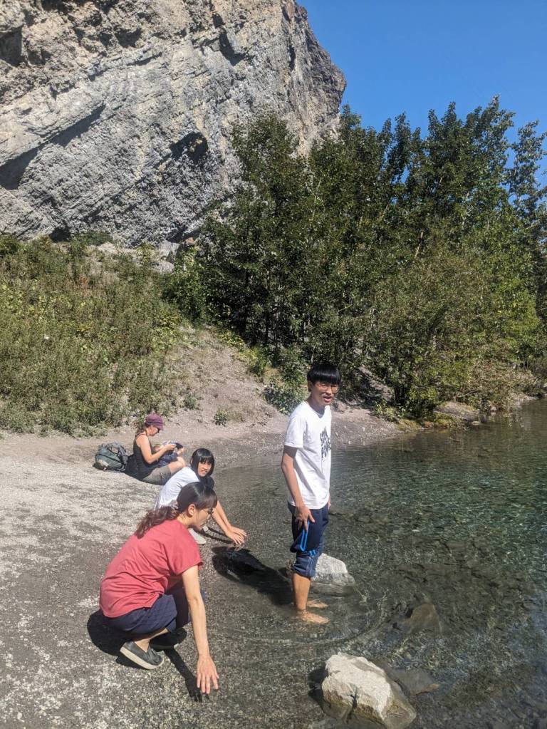 湖旁有很多人在游泳、玩水,但看到幾個跳下水游泳的人都馬上上岸,因為湖水太冰冷了。。。庭睿及采凝也都有脫鞋下水踏踏,但也馬上回岸,腳一下水很快就沒知覺了。