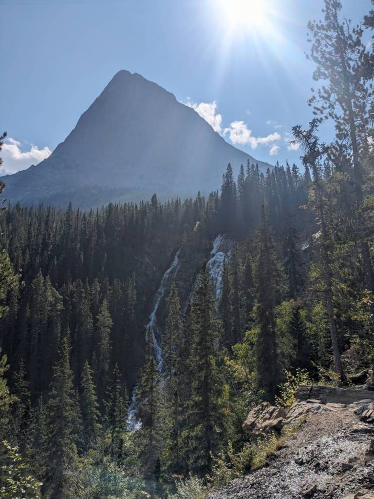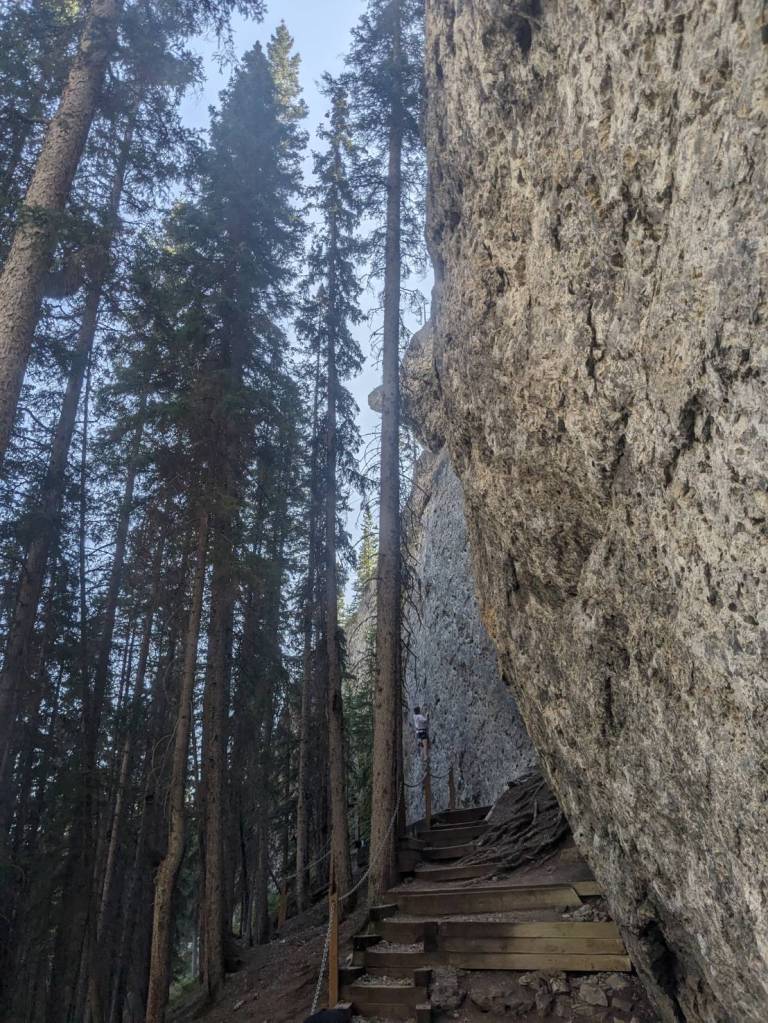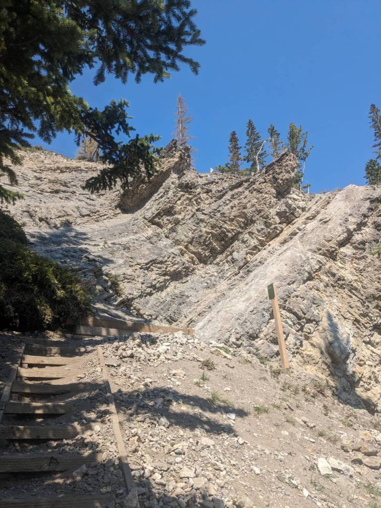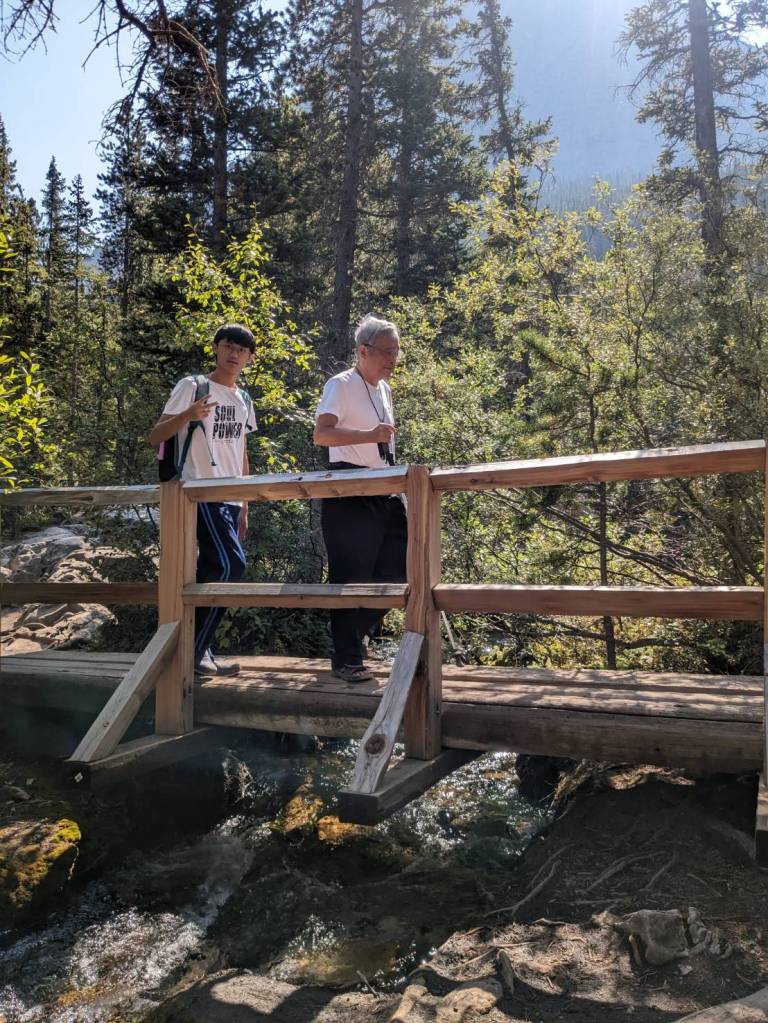 回程是走下方的「Grassi Lakes Interpretive Trail」,路程也約1.7公里,景色看得比較多又美,可看到壯觀的瀑布、湖景與山景,但是有急遽下坡、木梯及山溪氾濫的路段,相對著難走許多。