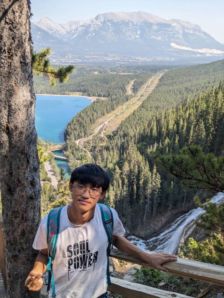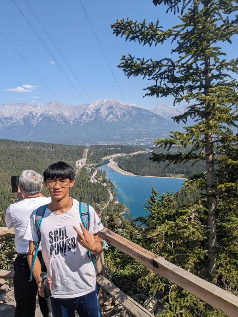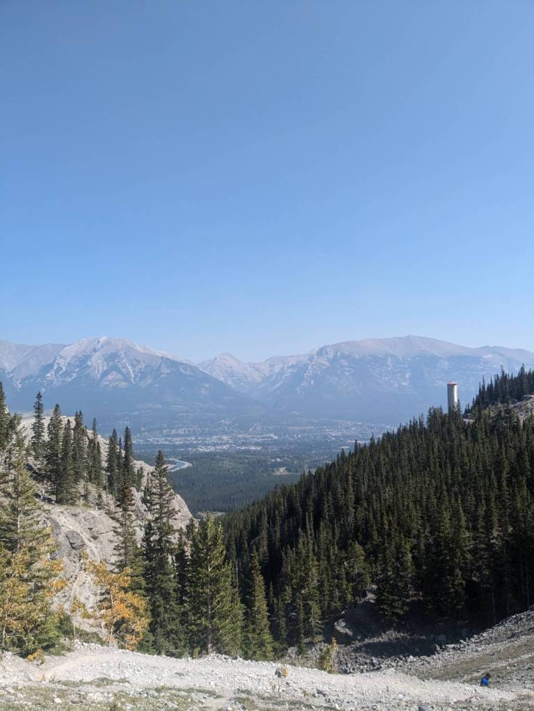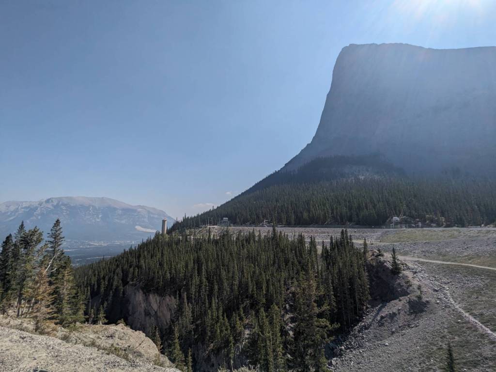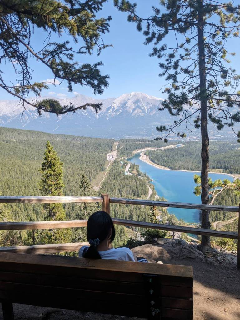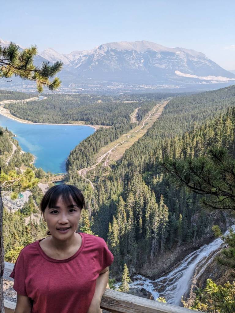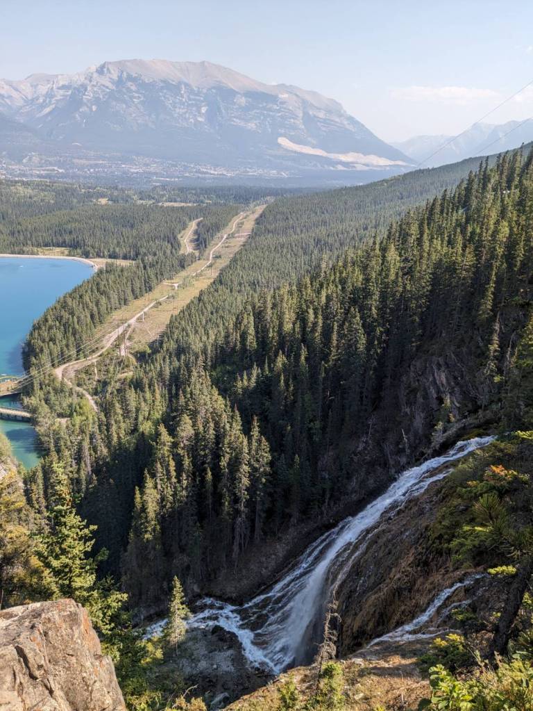 從瀑布上方的觀景台可看到水庫湖Rundle Forebay及Mount Townsend與Mount Fable等山峰,景色十分優美。