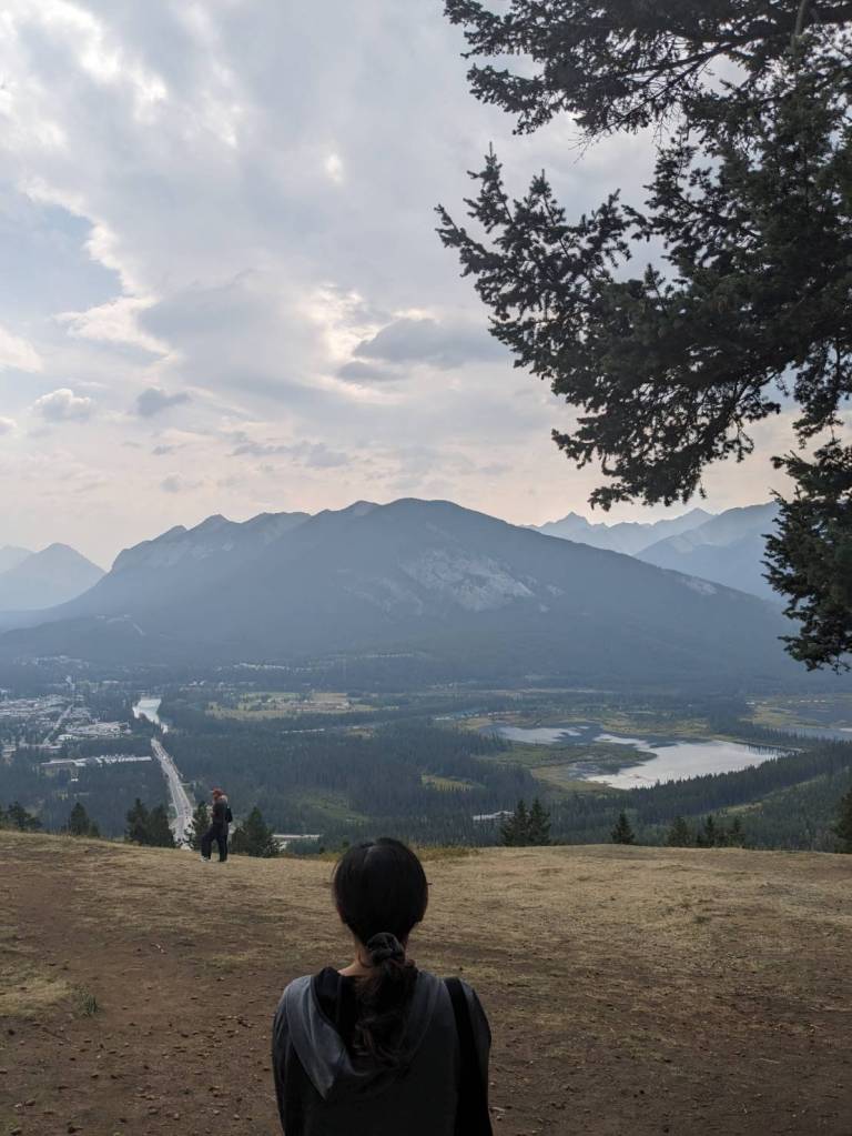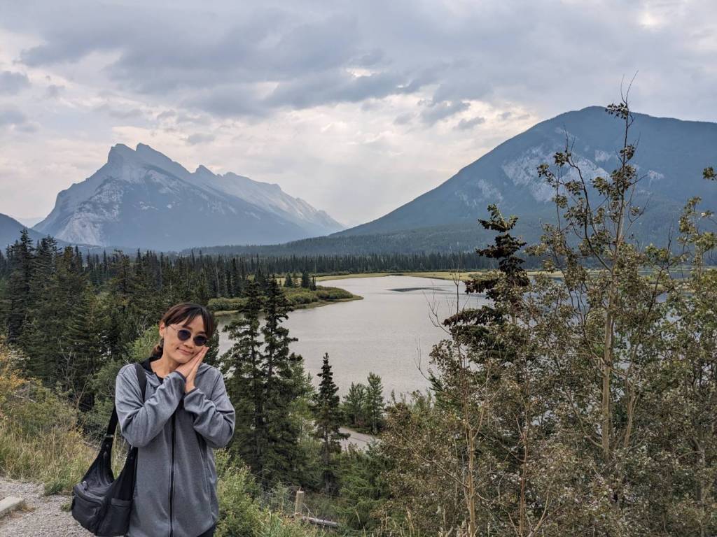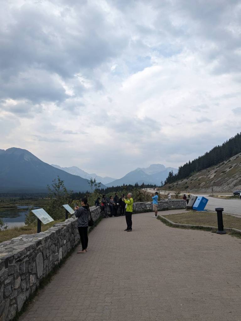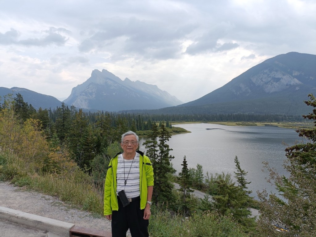 在「朱砂湖觀景點」(Vermilion Lakes Viewpoint)欣賞山湖美景,前方左邊為「藍道山」(Mount Rundle)群山,右邊則是「硫磺山」(Sulphur Mountain)。