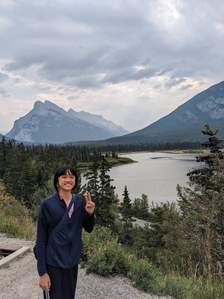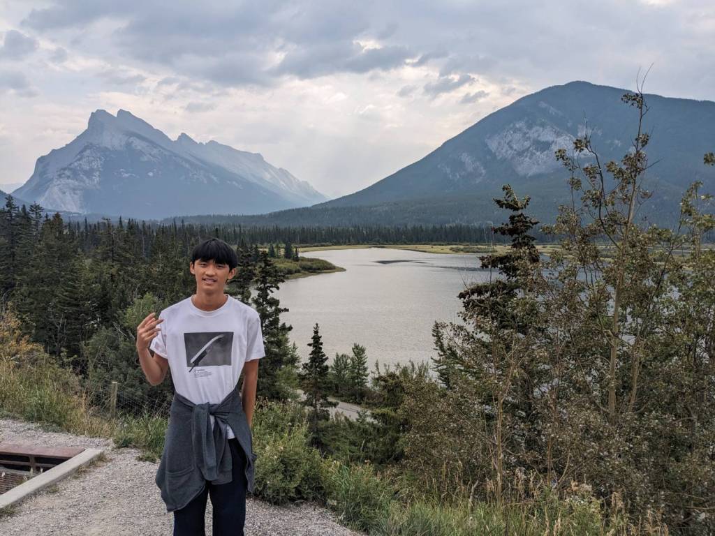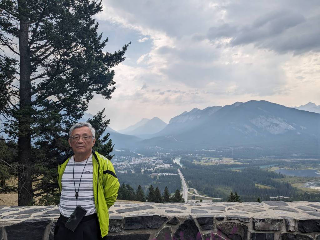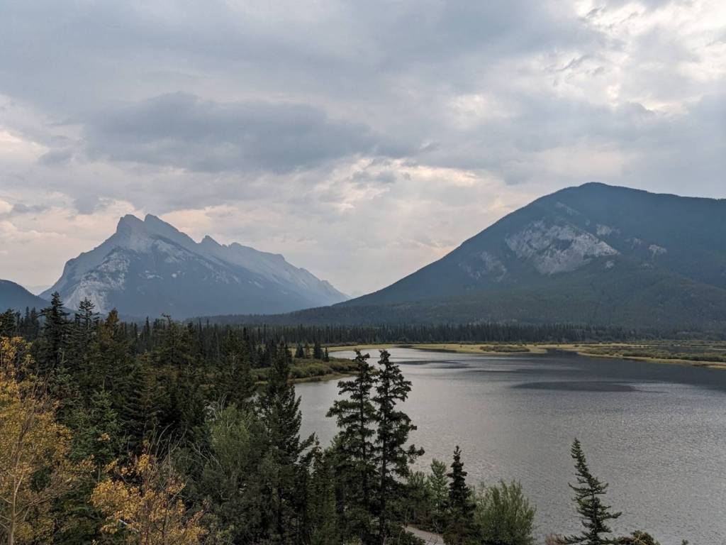 在「朱砂湖觀景點」(Vermilion Lakes Viewpoint)欣賞山湖美景,前方左邊為「藍道山」(Mount Rundle)群山,右邊則是「硫磺山」(Sulphur Mountain)。