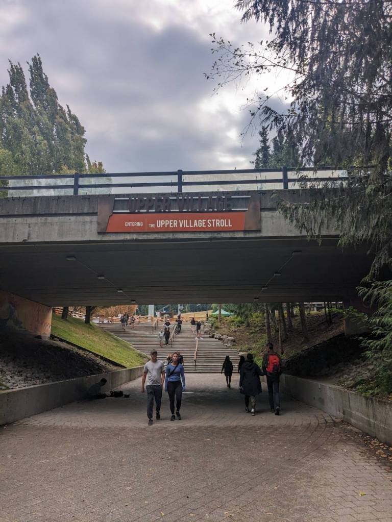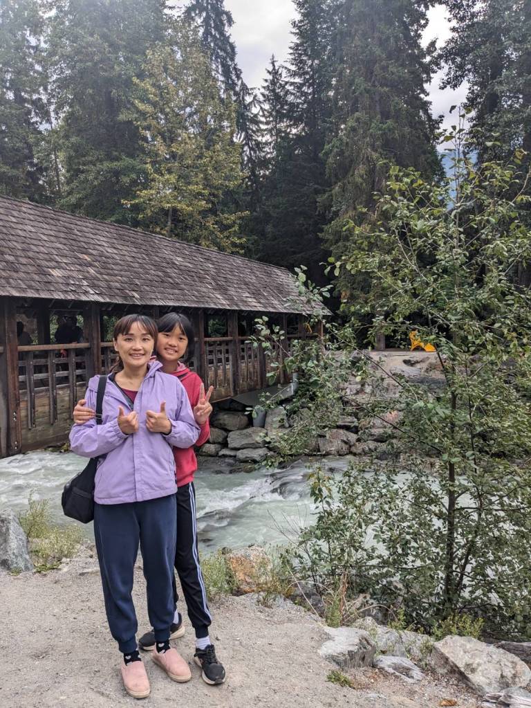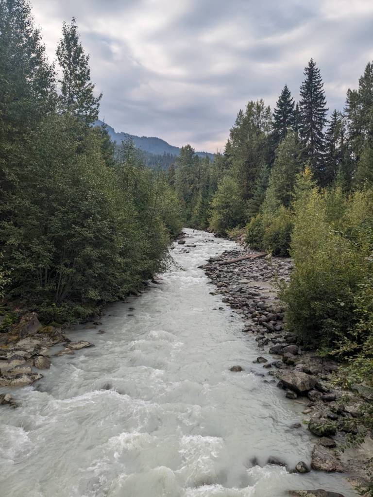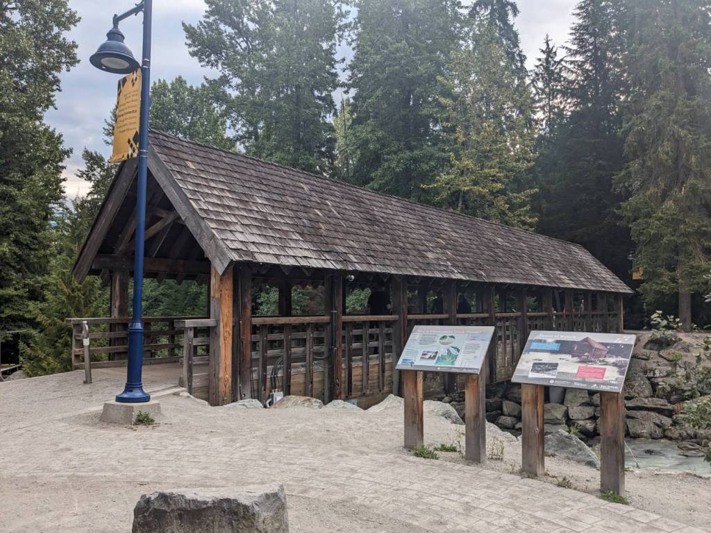 在沒熊可看之下,我們繼續前進到「廊橋」(Covered Bridge),它跨越「菲茨西蒙斯溪」(Fitzsimmons Creek),連結起「惠斯勒」的「上村」與「下村」(the upper and lower villages),從此處可以輕鬆地步行往返,兩邊都能看到漂亮的景點,而流淌的河流顏色長久以來都是呈現乳白色,另外河水對於來自亞熱帶的我們可說是冰冷刺骨的,即使是夏季期間。