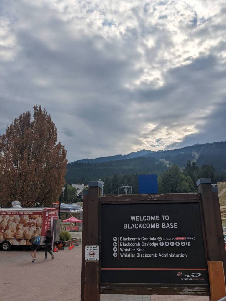 上午9:20分,我們從民宿走到「黑梳山下纜車站」(Blackcomb Gondola)大約15分鐘,左前方可以望見「黑梳山」的景色,右邊則是「惠斯勒山」,這區域可說是西「加拿大」最大的滑雪度假勝地,從沿路經過的5座大型平面停車場可以知道雪季時停車的龐大需求,而夏季的今天仍停了6、7成停車位。