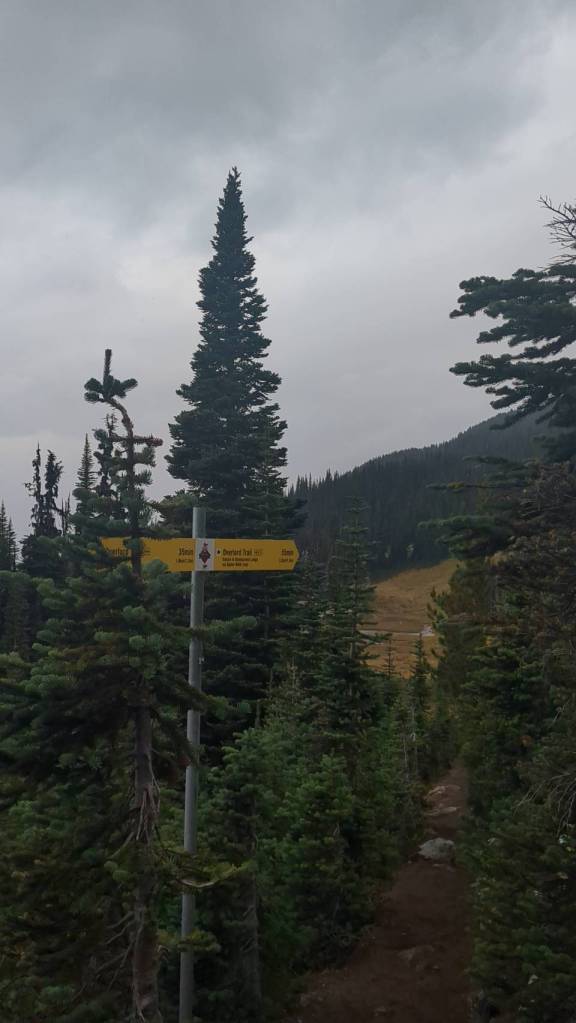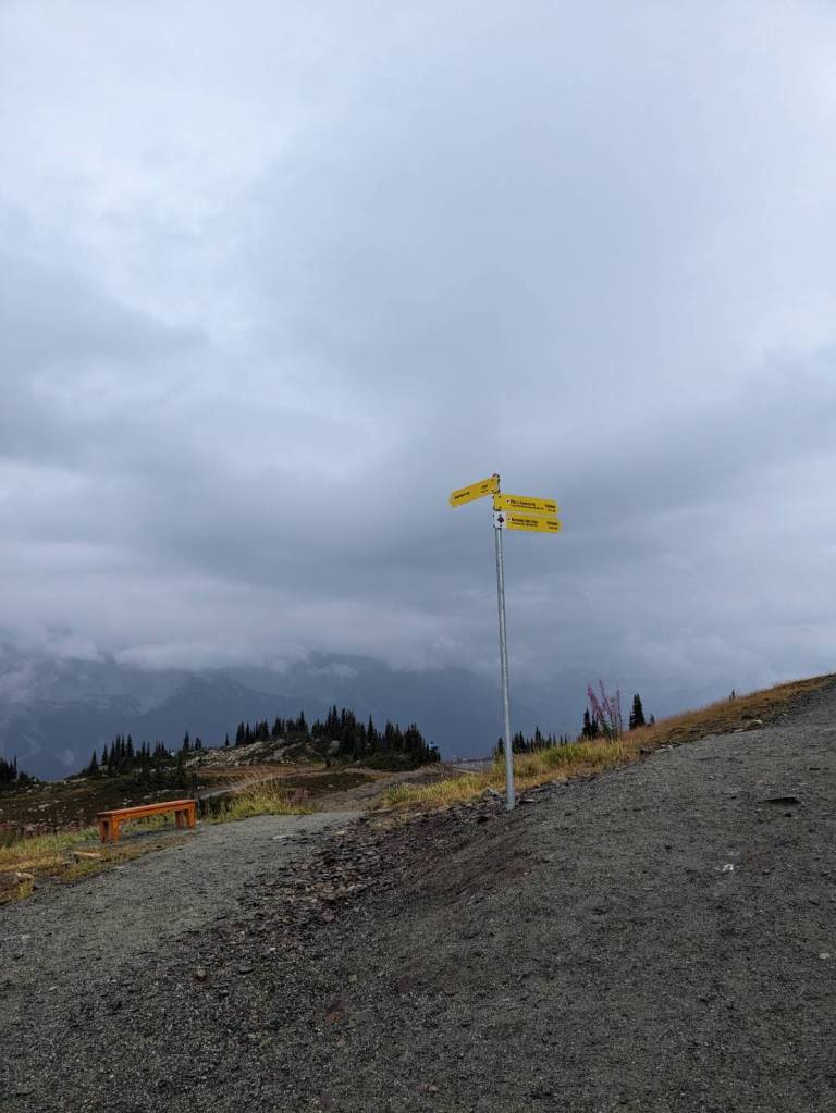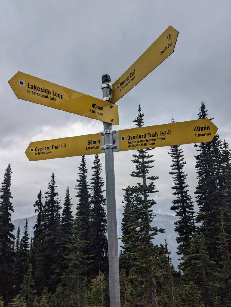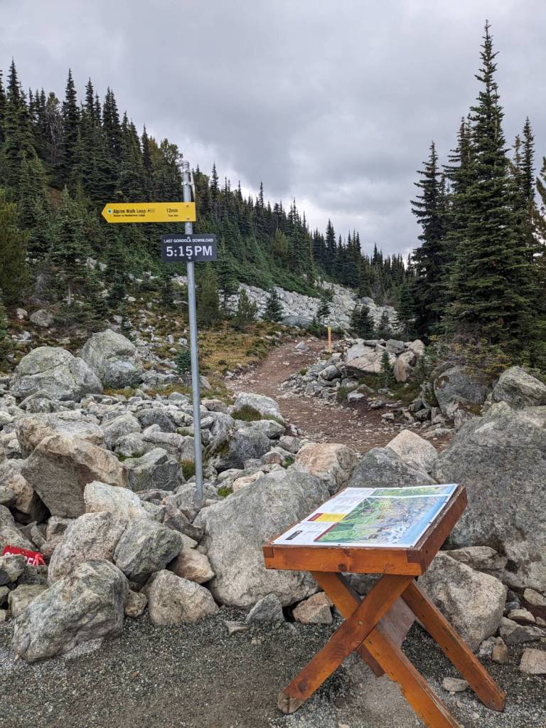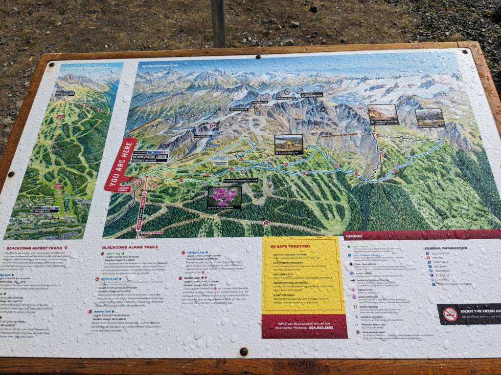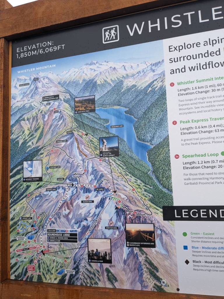 這張「黑梳山健行圖」顯示綠色路線為簡單行走路線、藍色為中等難行路線以及黑色為最難行路線,今日的目的地為「黑梳湖」(Blackcomb Lake),估計路程為1小時左右抵達。