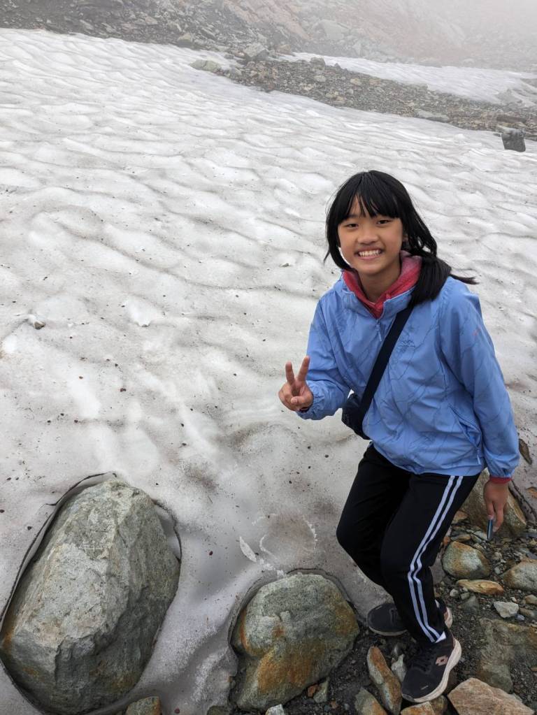 我又重新往上爬到破碎冰川處,帶他們摸一下結凍的冰雪。