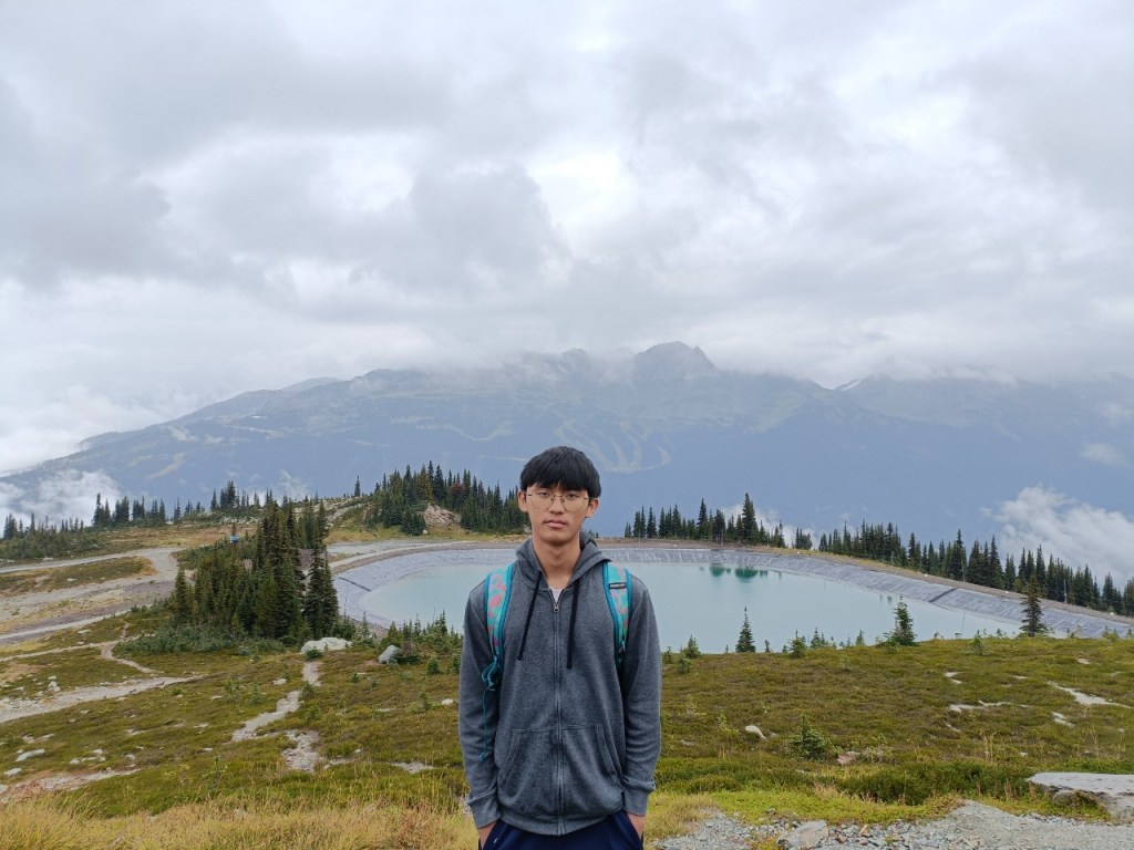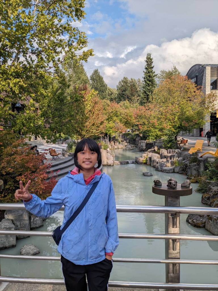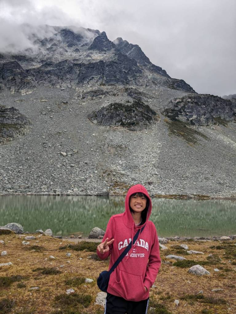 采凝的背後是「哈米尼湖」(Harmony Lake)。