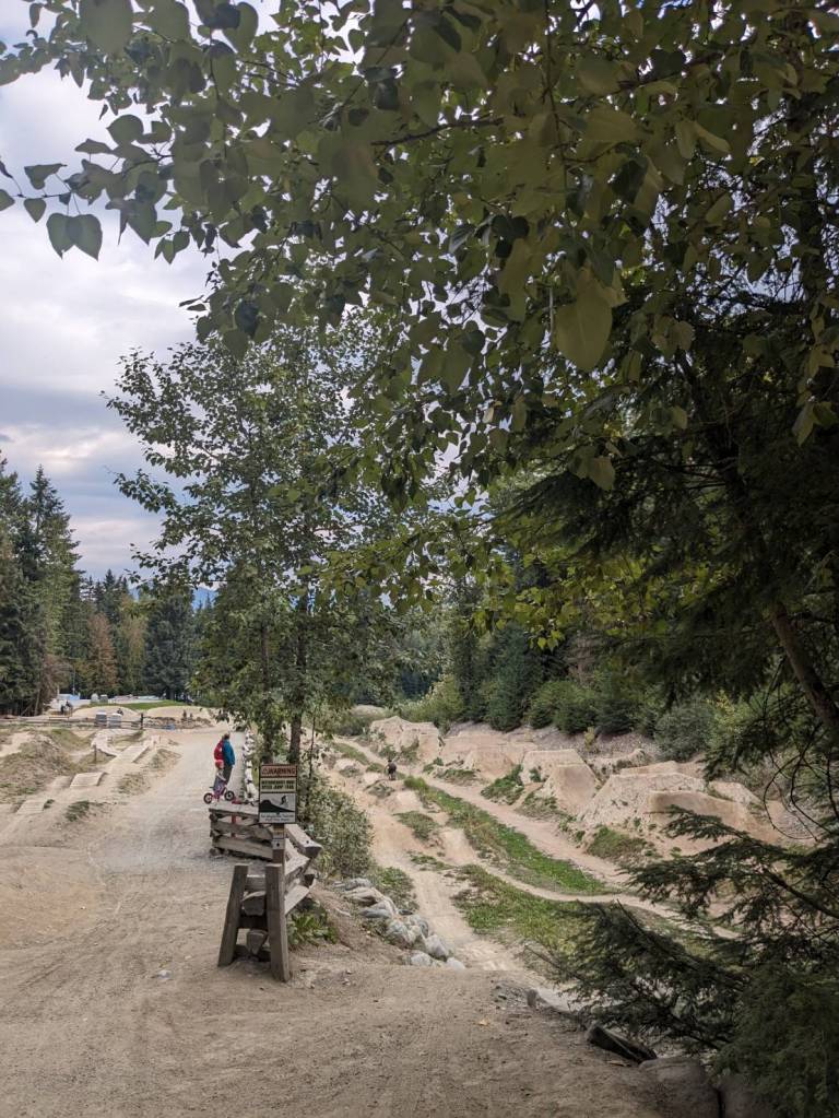走在這公園沒1分鐘,老婆眼尖發現有一隻黑熊「默默地」穿越行人及越野單車手的身旁,很自然地走在距離我們不到10公尺的平行小徑上,越野單車手轉身俯視牠低頭走過,看體型牠應該是一頭成年黑熊,走起路來穩重且自然,彷彿已融入人類這群體生活之中。雖然我們盡量快步要跟上他的腳步,但牠很快地鑽入「越野特技單車公園」(BMX Park)的樹林內消失無蹤了。