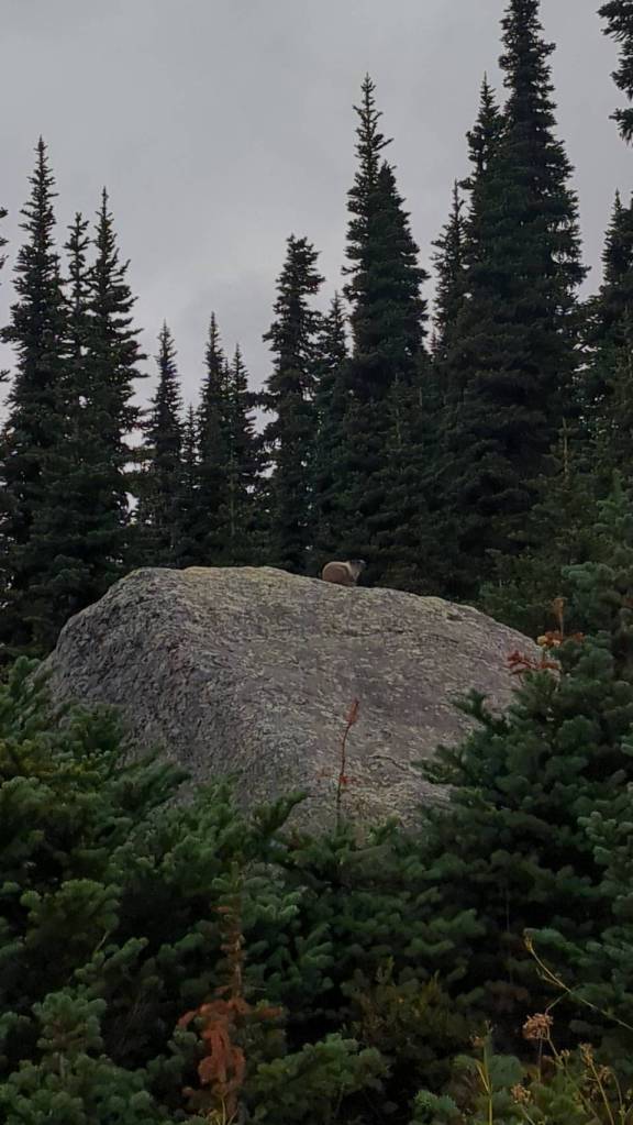 在看山下景色時,又看見一隻土撥鼠在懸崖邊看著山下的「綠湖」(Green Lake),邊思考「鼠生大事」。