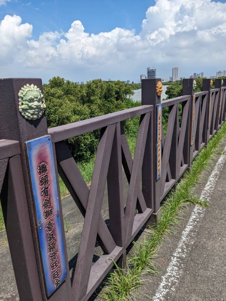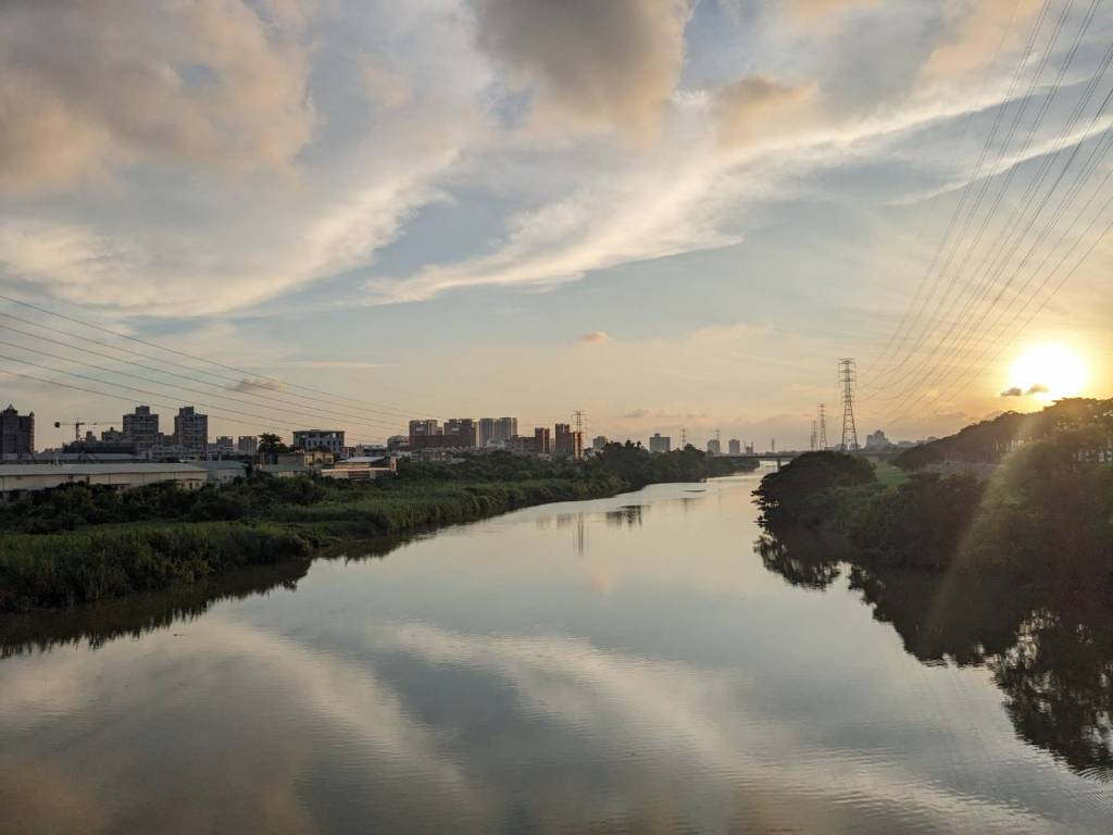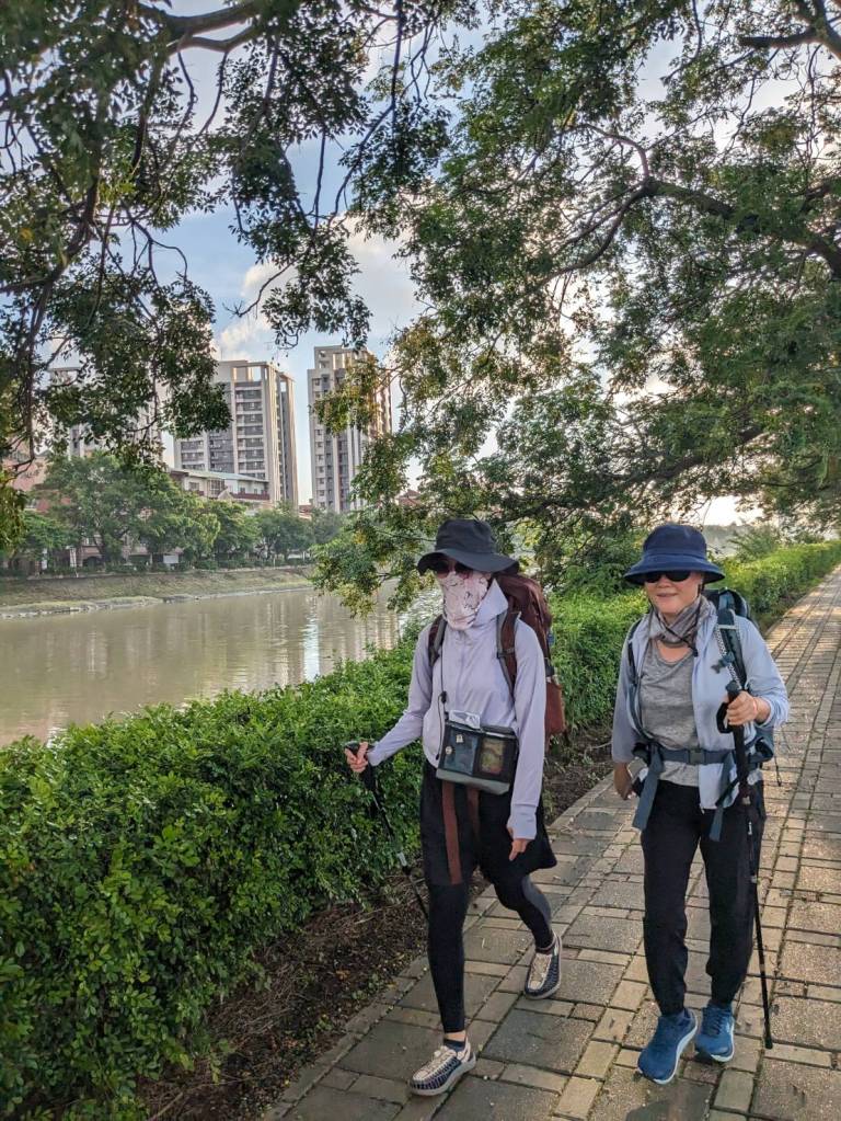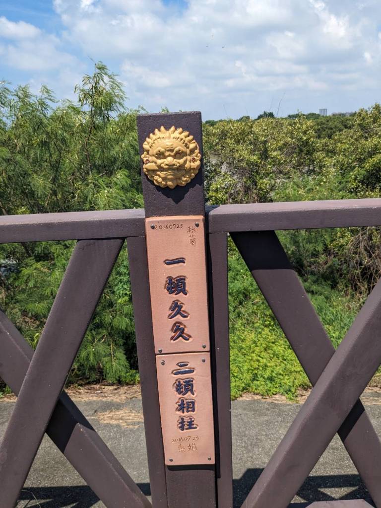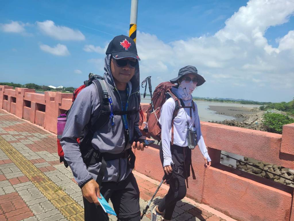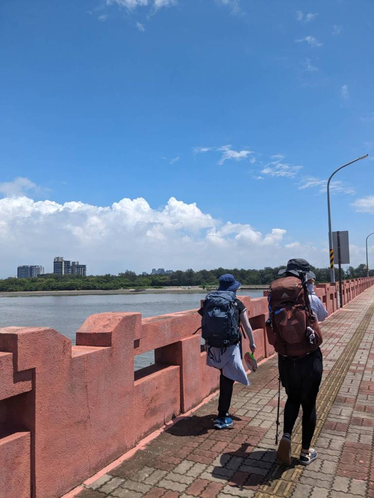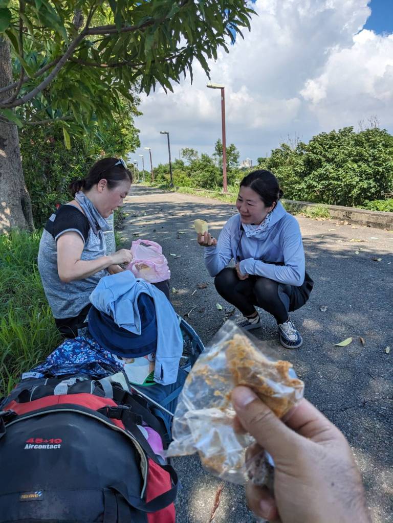 下午1:50分,我們越過「大港觀海橋」後,在河堤旁找到一處陰涼處吃早上在「水仙宮市場」旁買的花生與芝麻麻吉,一顆15元但餡料飽滿,我吃兩顆就有些飽了。