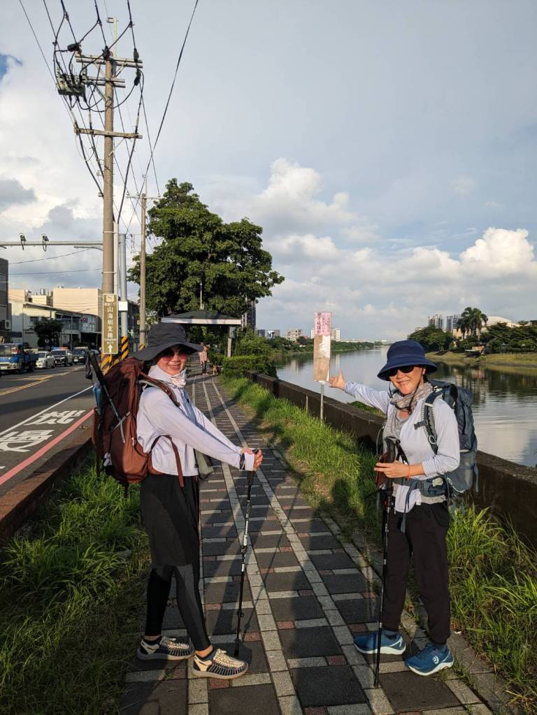 走了4公里後,看到第一個「山海圳」的指標,即使熱也要爬上堤防拍一張留念。