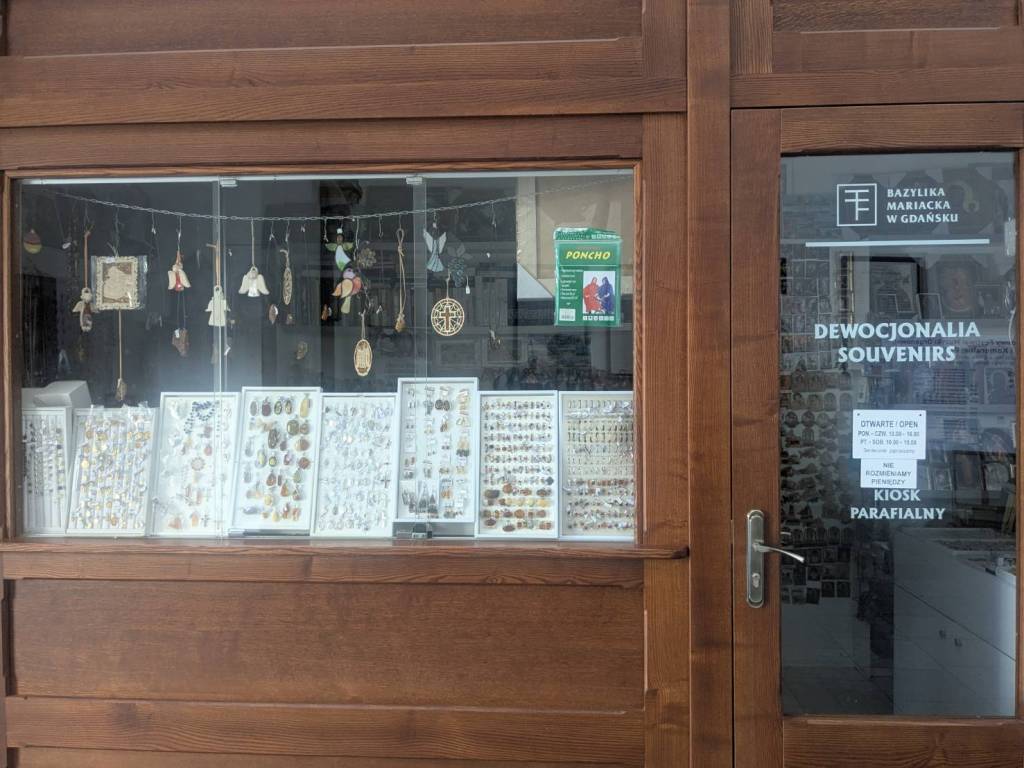 在10點開放登頂塔樓前,先參觀教堂的內部。進入前廳,發現有紀念品店,展示櫥窗擺滿了各式各樣的琥珀飾品,看一看價格跟外面的琥珀店家賣得差不多,但相信在神聖教堂裡販賣的琥珀肯定是真貨。
