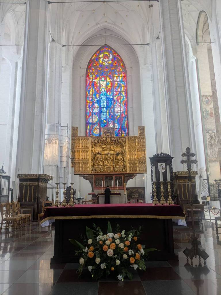 教堂內部中央為1517年製作的橡木主祭壇,屬於晚期「哥德」式風格,呈現聖母加冕場景,而一道彩虹的橫樑也繪製於1517年。