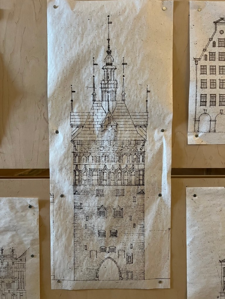 至於「囚犯塔」(Wieża Więzienna),正如其名,是用來羈押囚犯、進行審訊與執行刑罰的重要場所,建於14世紀末,起初也是舊城防禦體系的一環,連接「刑訊樓」(Katownia)及「金門」(Golden Gate)形成類似「甕城」(前門防禦系統)的角色。「囚犯塔」以紅磚砌成,呈現典型的「波羅的海哥德」式建築風格,塔身高聳厚實,下半部牆體幾乎沒有裝飾,只留下狹小的窗孔,顯現其防禦與囚禁功能;上半部則逐漸出現白色灰泥勾勒的幾何圖案與拱形窗飾,而中央的尖塔直指天空,使整體輪廓在城市天際線中格外醒目。