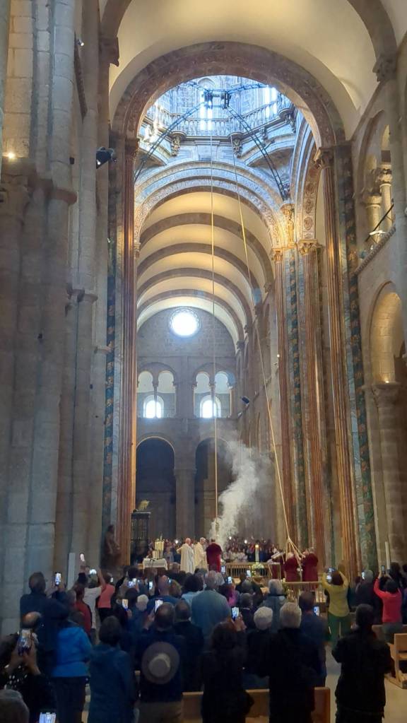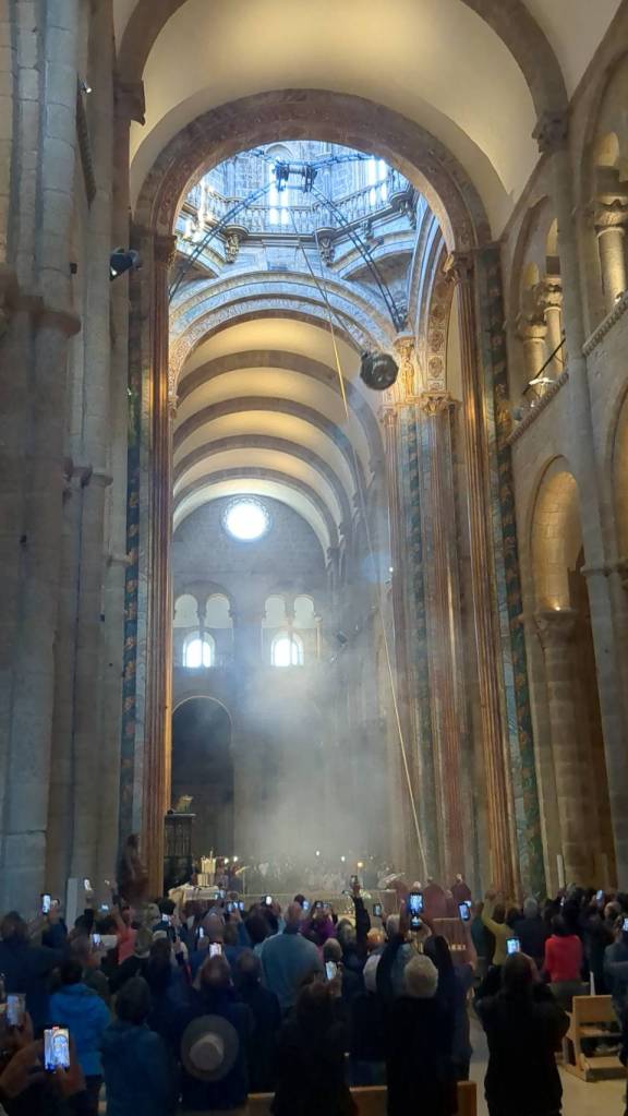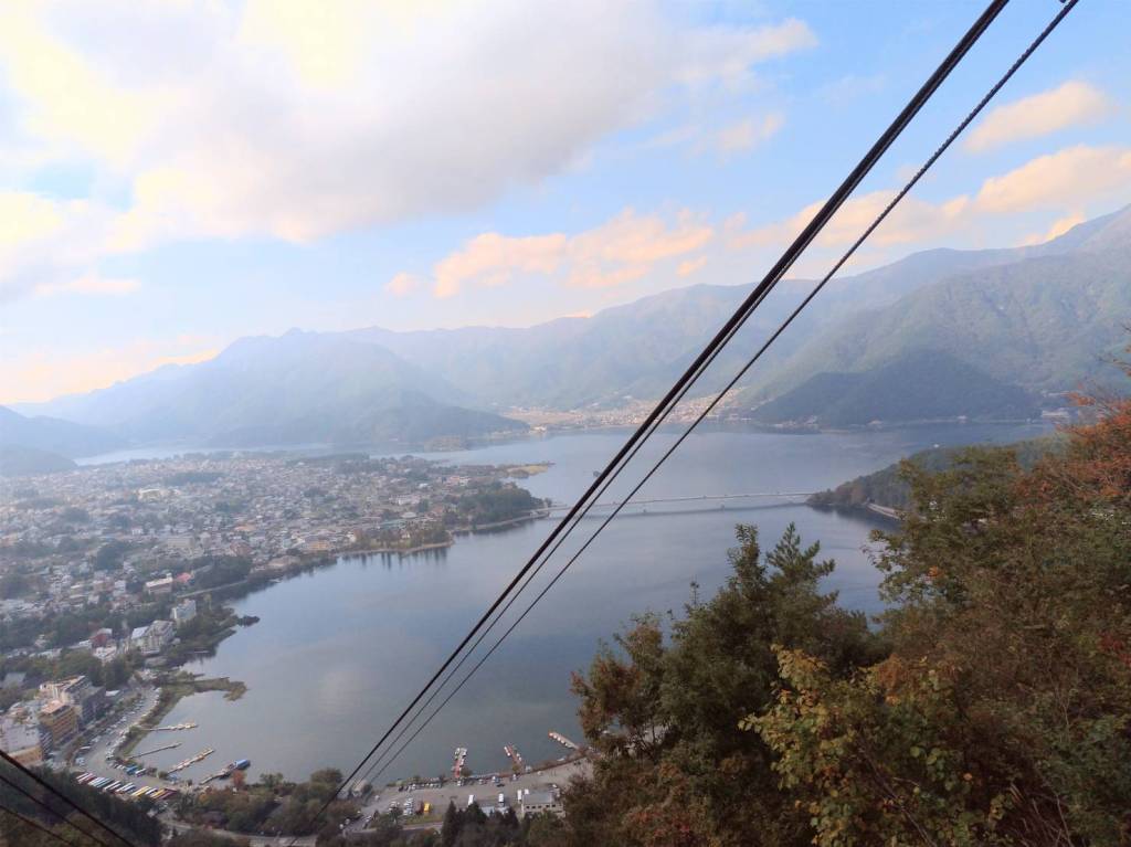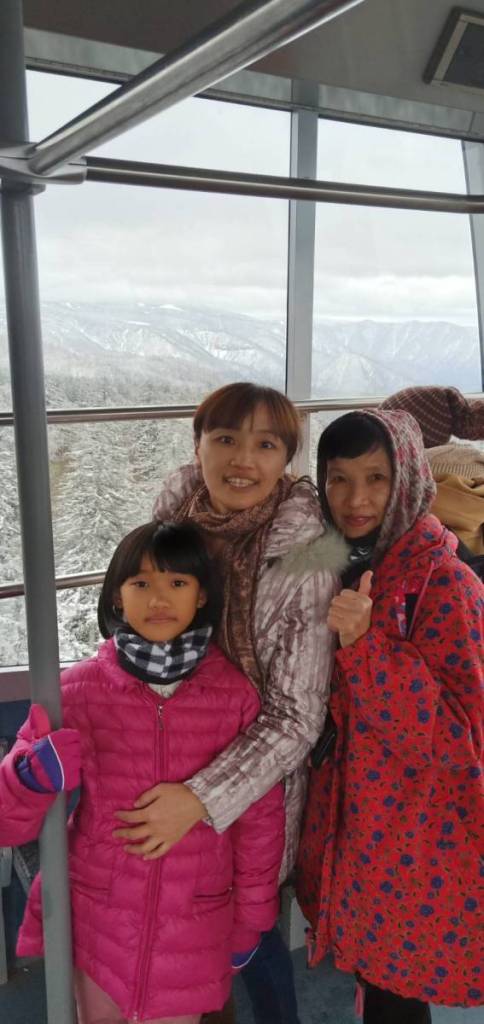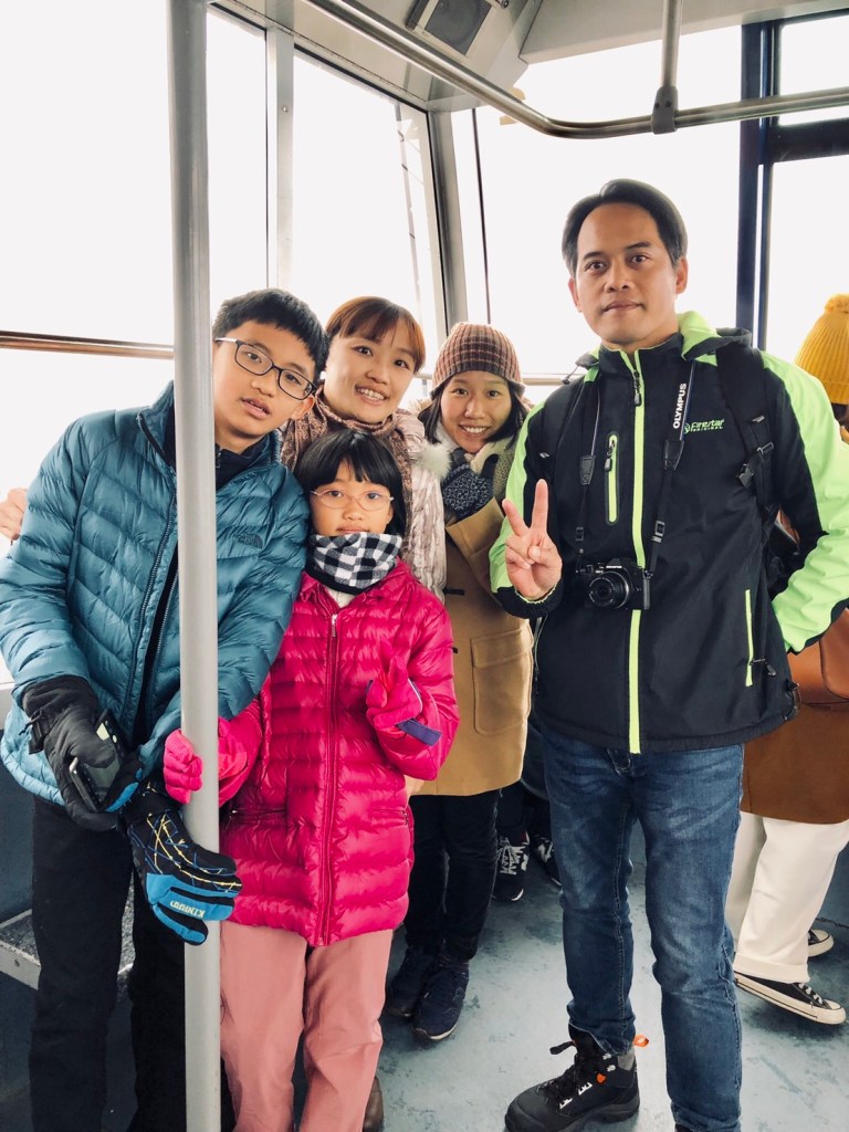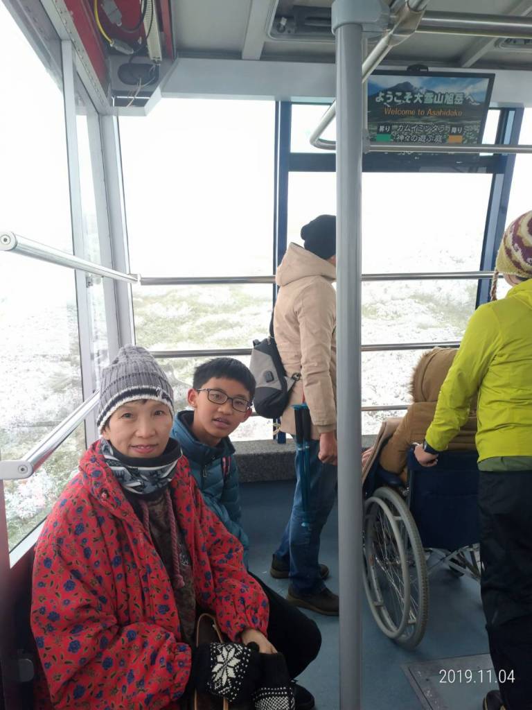 與逆向上山的纜車交會,他們三個人包了整輛車廂。