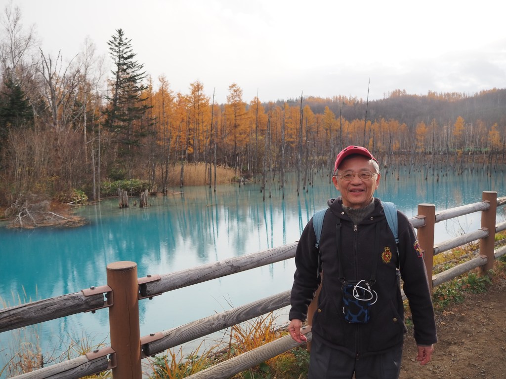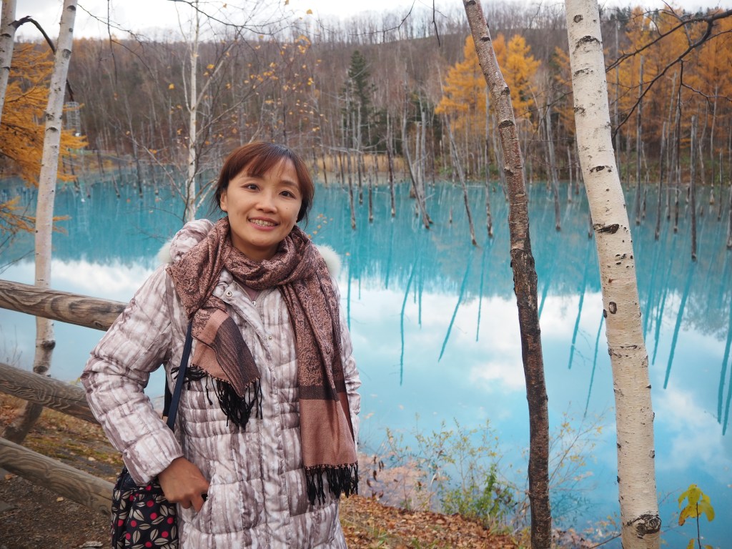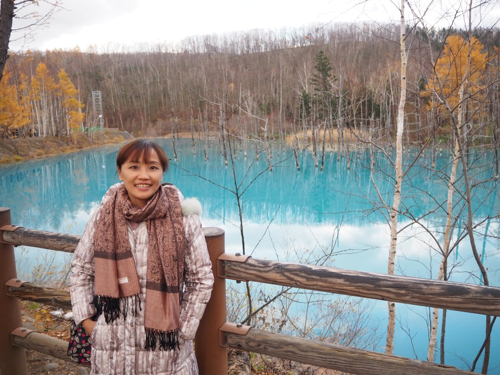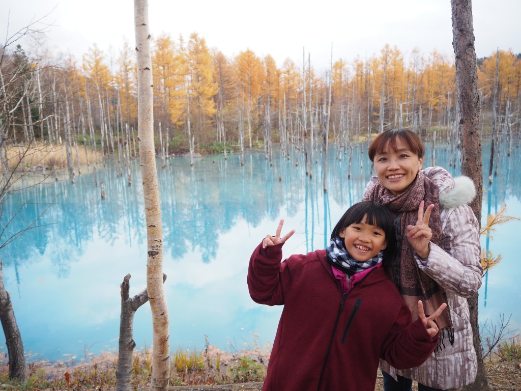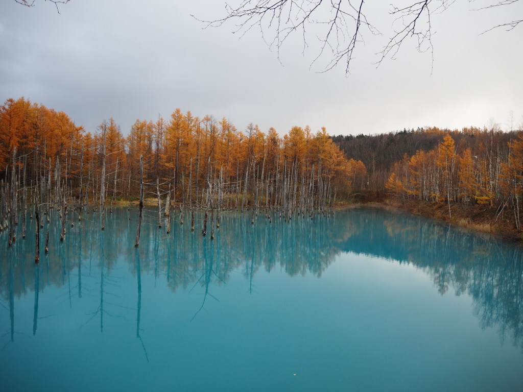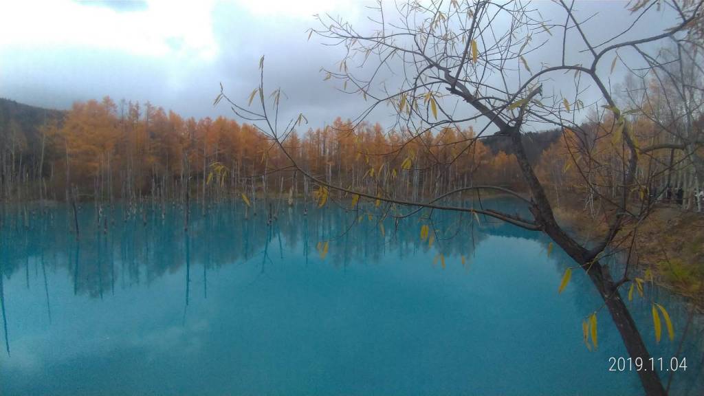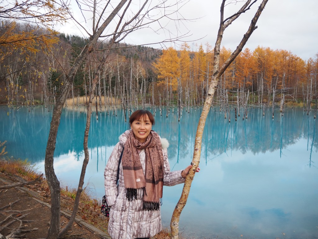 又開車40分鐘後,抵達「美瑛町」的熱門景點–「青池」,這是一座由攔河堤所形成的人工水池,其以湛藍且寧靜的落羽松景色聞名,吸引著不少的大自然愛好者,從停車場只需短程步行就可以到達。