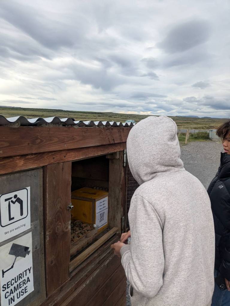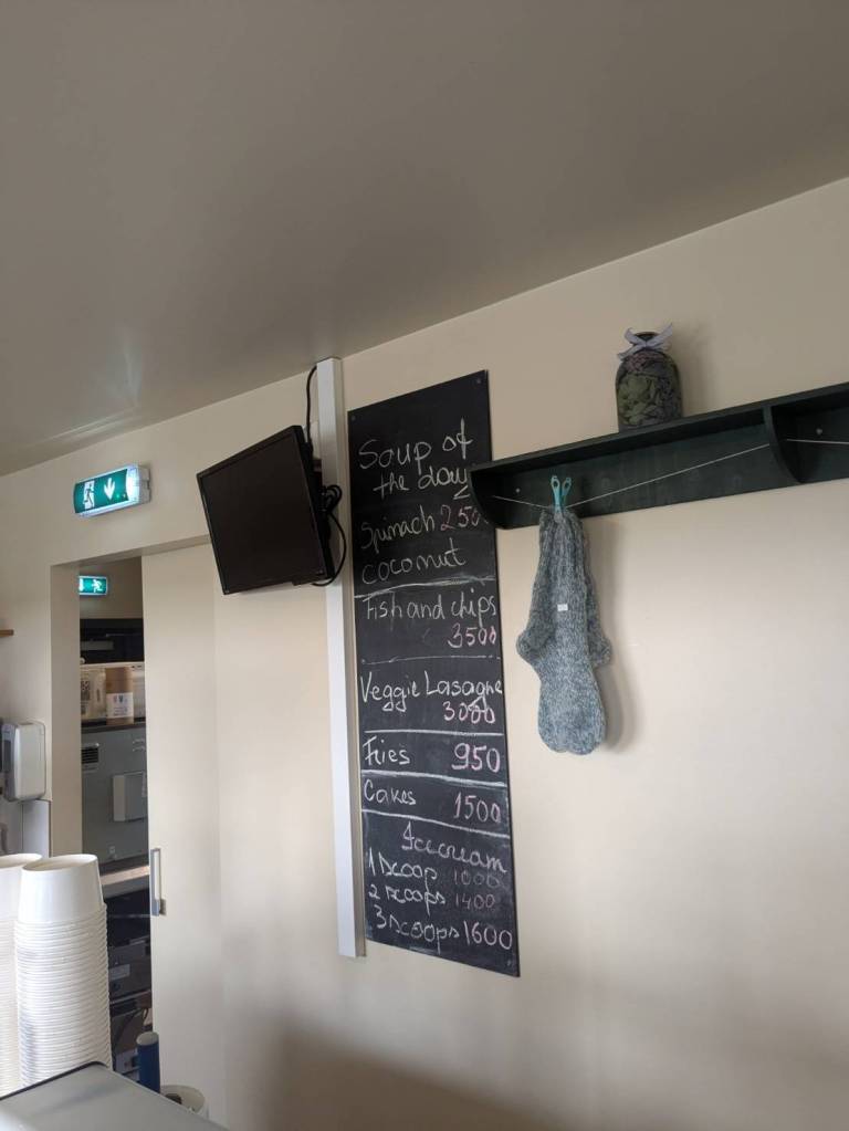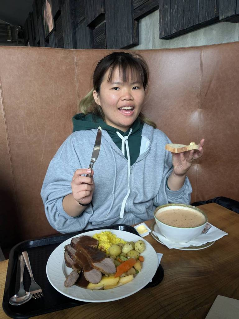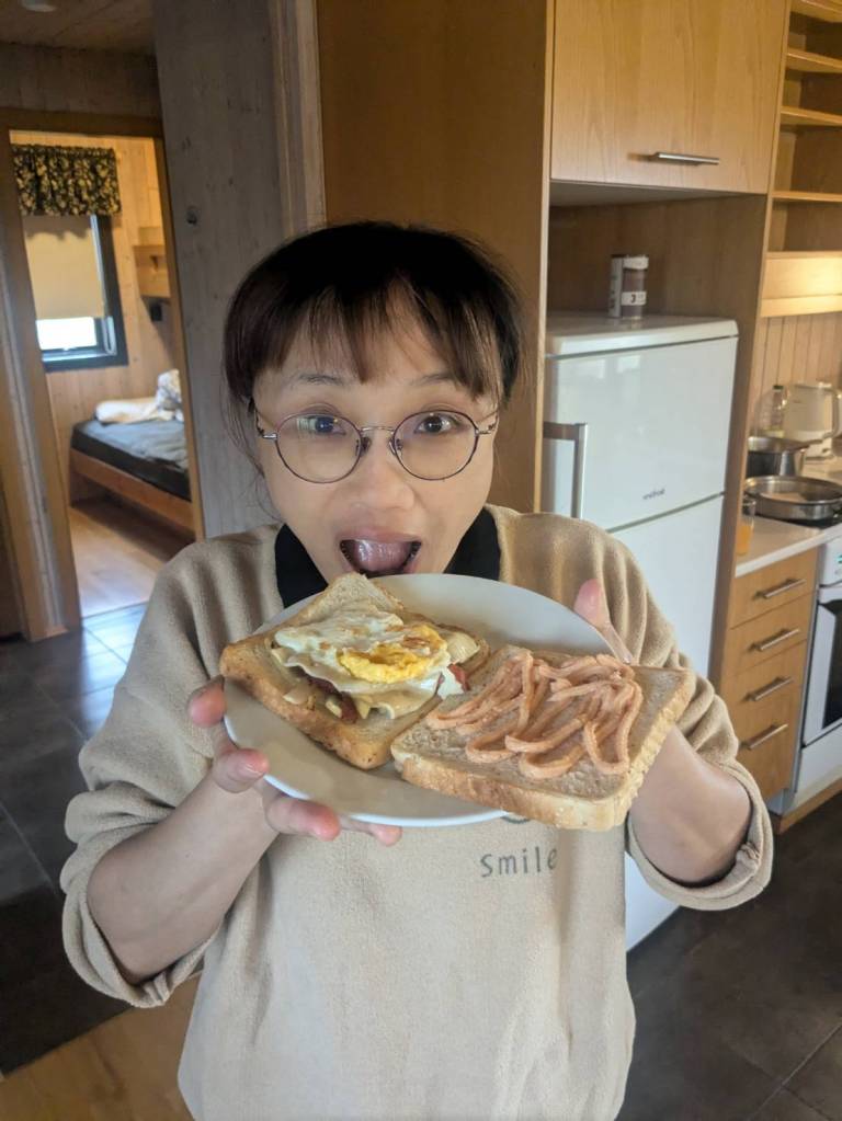 早上6點半起床後,趕快整理睡袋及背包、盥洗,準備趕赴7點的早餐,一到餐廳就有很多人在排隊點早餐了;奇怪的是,每個人手上都拿著一個小圓幣,我跟Takeshi在猜測那是什麼時,已經輪到我們了。我們很高興點完餐後,店員在跟我們索取小圓幣,原來那是預約早餐的証明,所以我們就眼睜睜地看著果汁跟咖啡被收回,原來這裏凡事都得預約的…