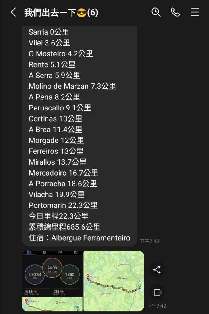 關心我們家的Genie姐一下,她在下午6點時已經安全抵達「阿爾蘇阿」(Arzúa)了,距離朝聖終點「聖地亞哥德孔波斯特拉」(Santiago de Compostela)也才33公里而已。