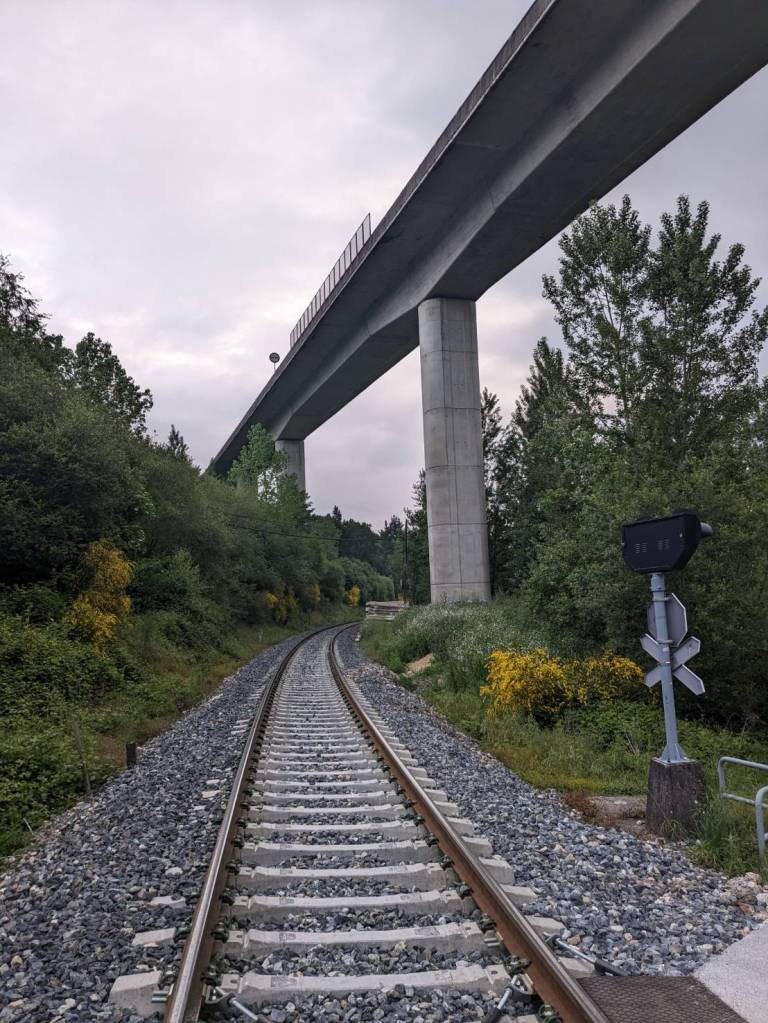 接下來沒有要越過「貝萊薩爾水壩橋」了,下階梯後就右轉,然後再左轉跨過一座水泥橋。