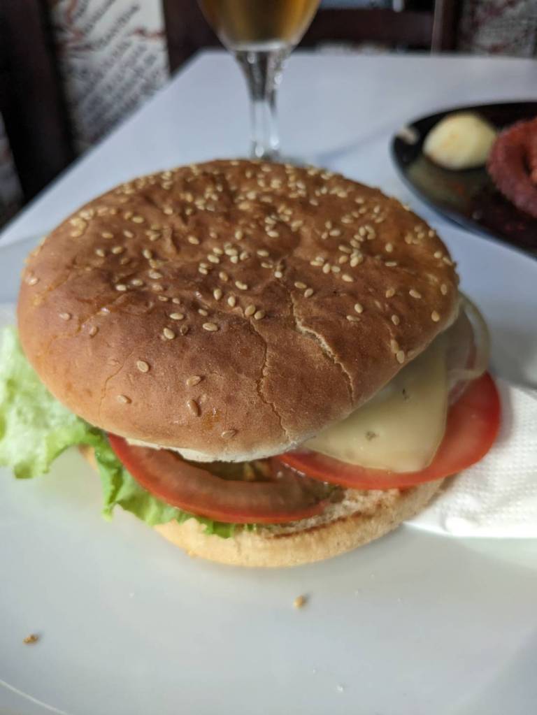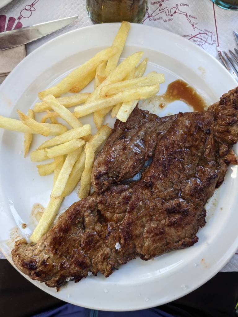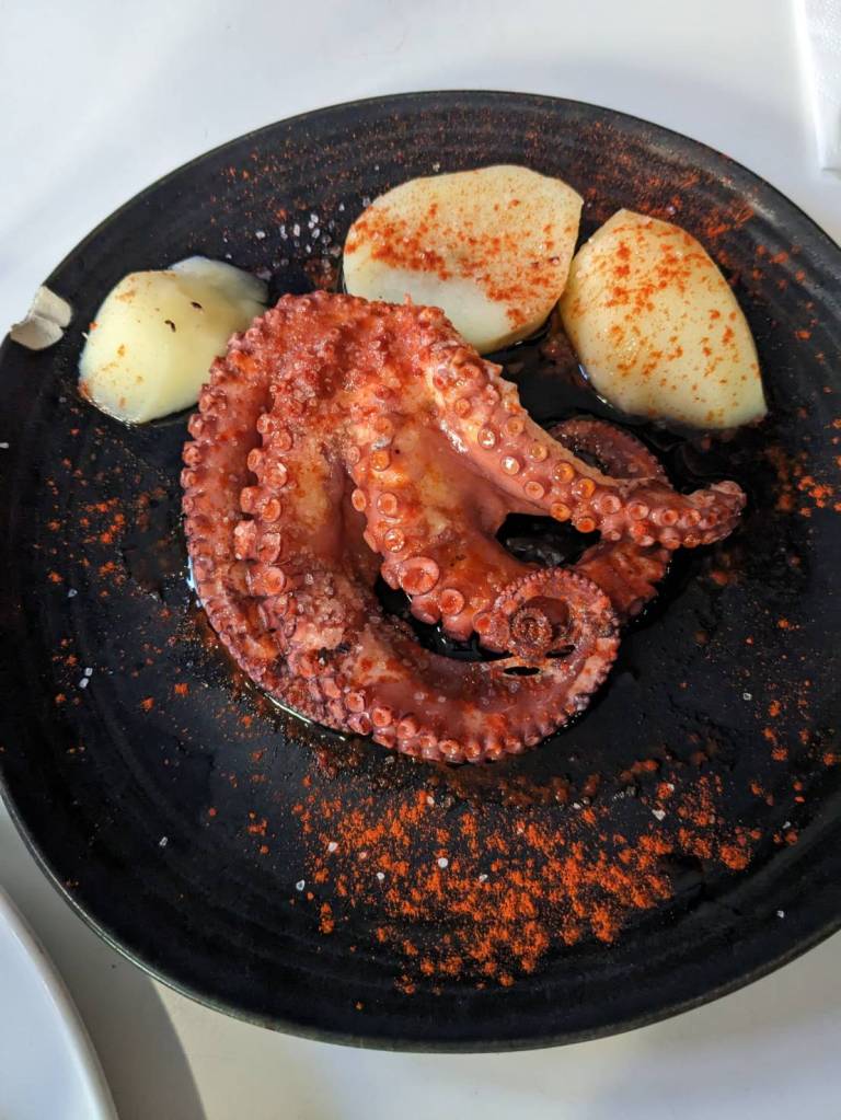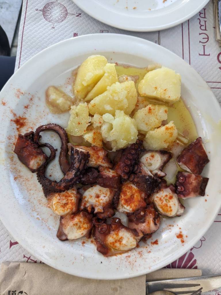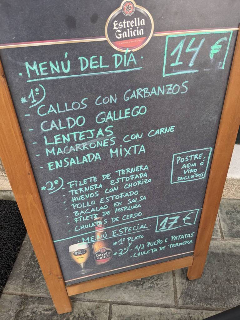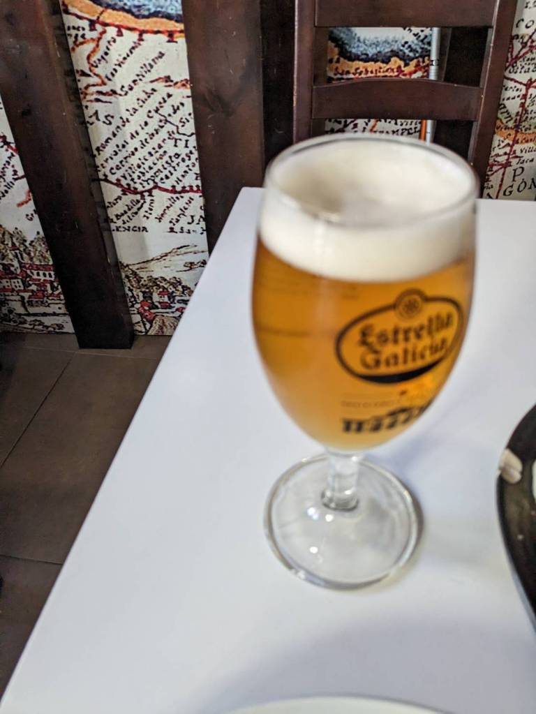 由於已經到了「西班牙」的晚餐時間,想去的餐廳也已經客滿,所以Amy就先回飯店,我們三人就在旅館的一樓簡餐廳單點來吃;雖然沒有機會吃到的13歐元的每日特餐,但我為了犒賞自己走路的辛勞,點了「加利西亞」章魚及牛肉漢堡外加一杯Beer來享用,也珍惜這僅剩一週的朝聖之旅。