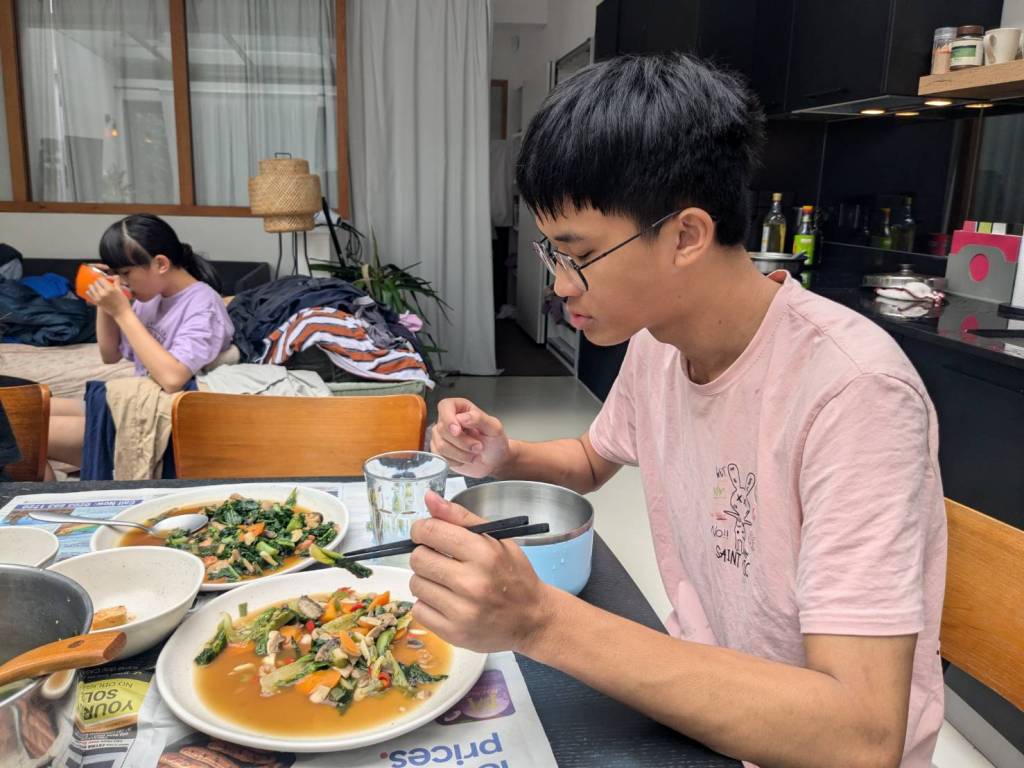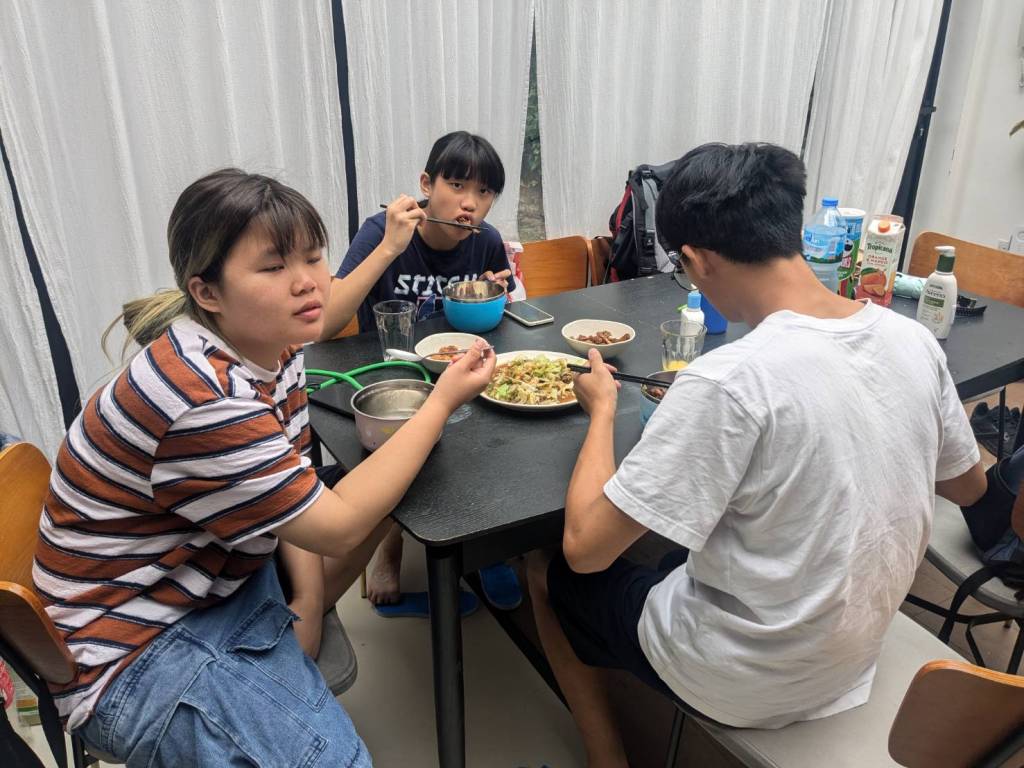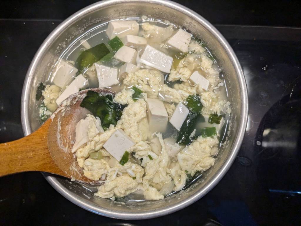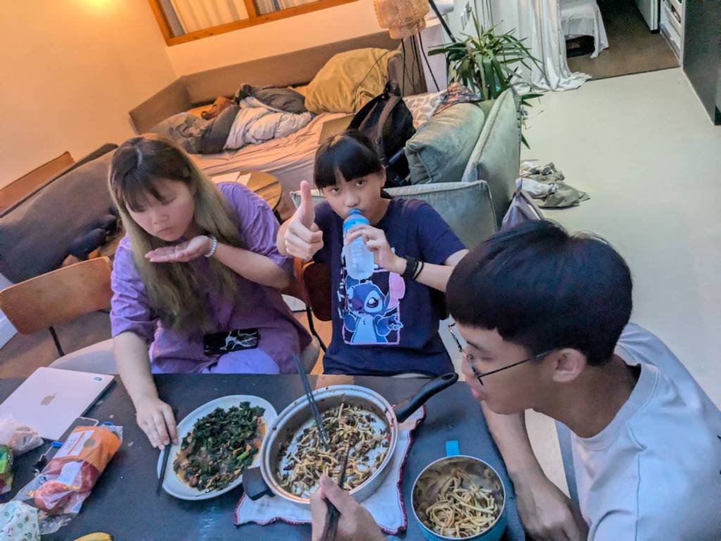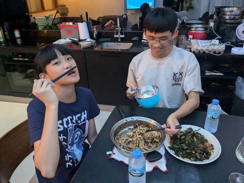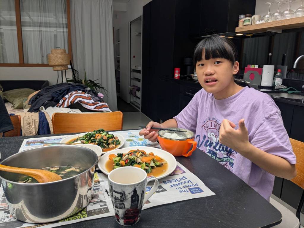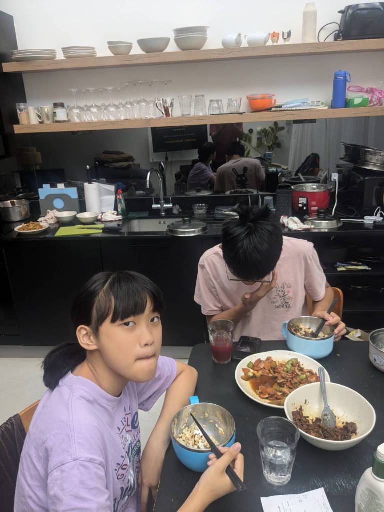 因為小孩子們昨晚吃了很豐盛的火鍋,所以今早只準備了肉燥飯、炒家常菜及海帶芽湯孝敬他們。
