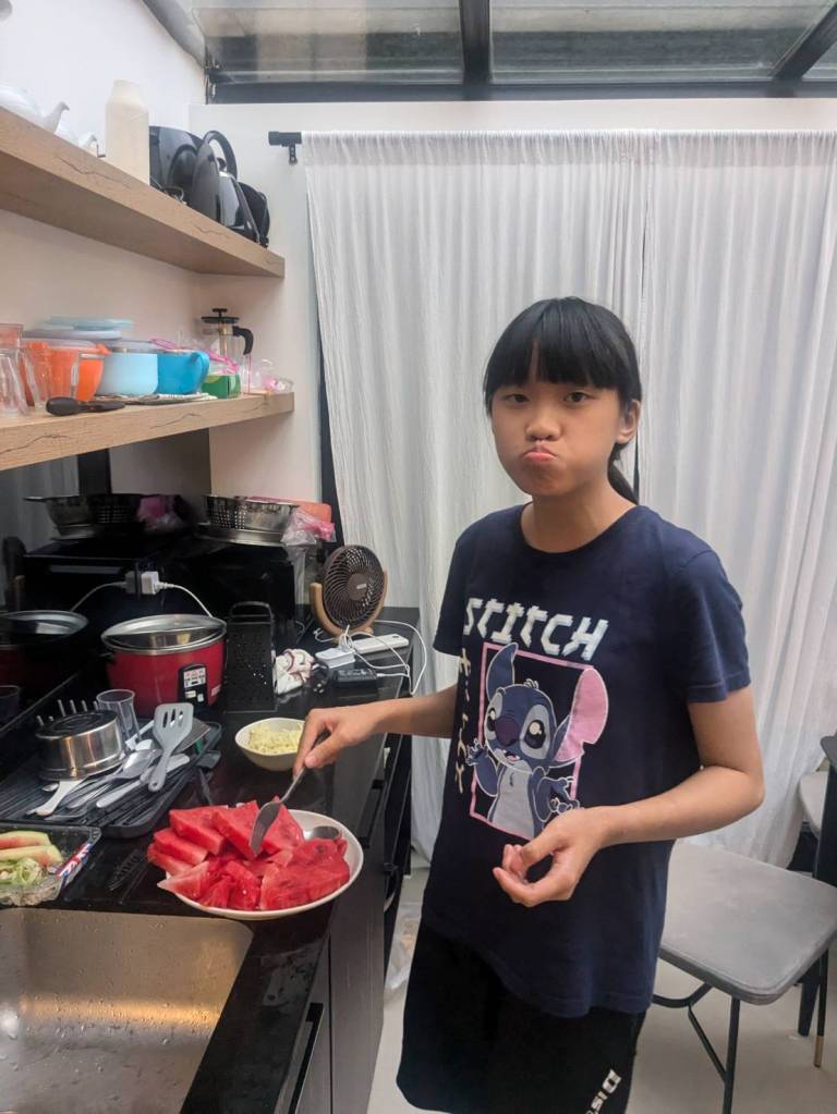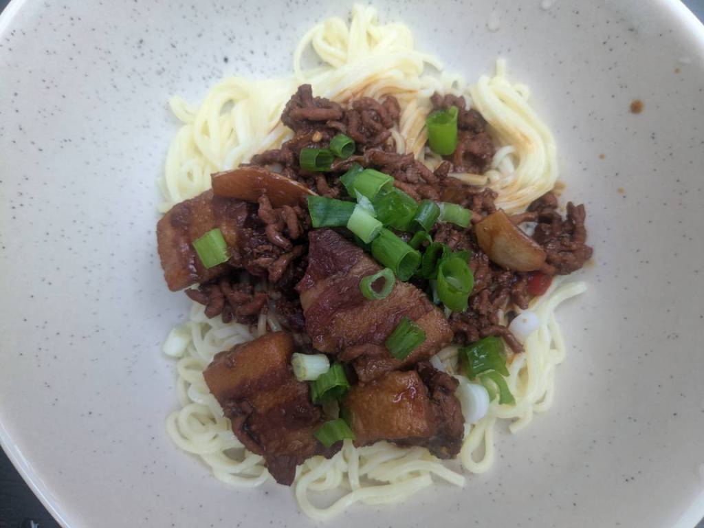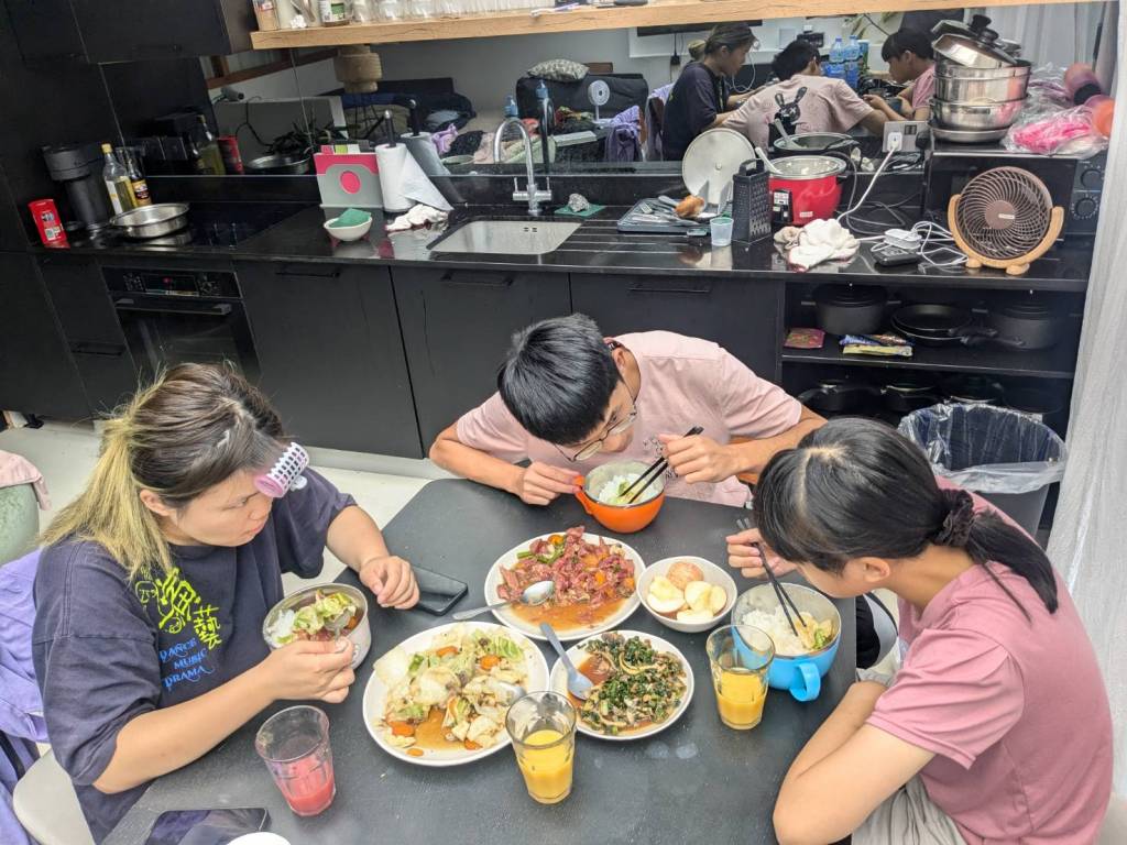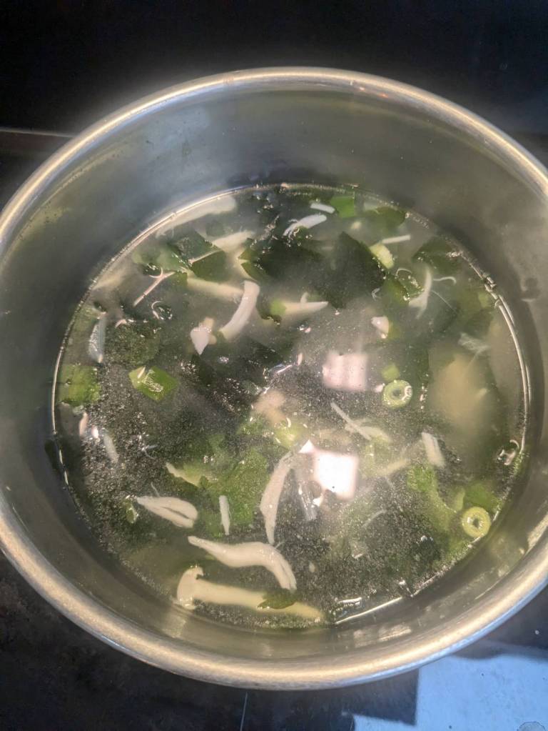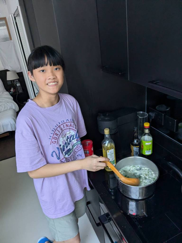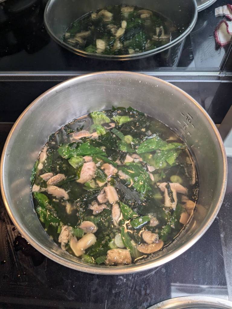 因為小孩子們昨晚吃了很豐盛的火鍋,所以今早只準備了肉燥飯、炒家常菜及海帶芽湯孝敬他們。