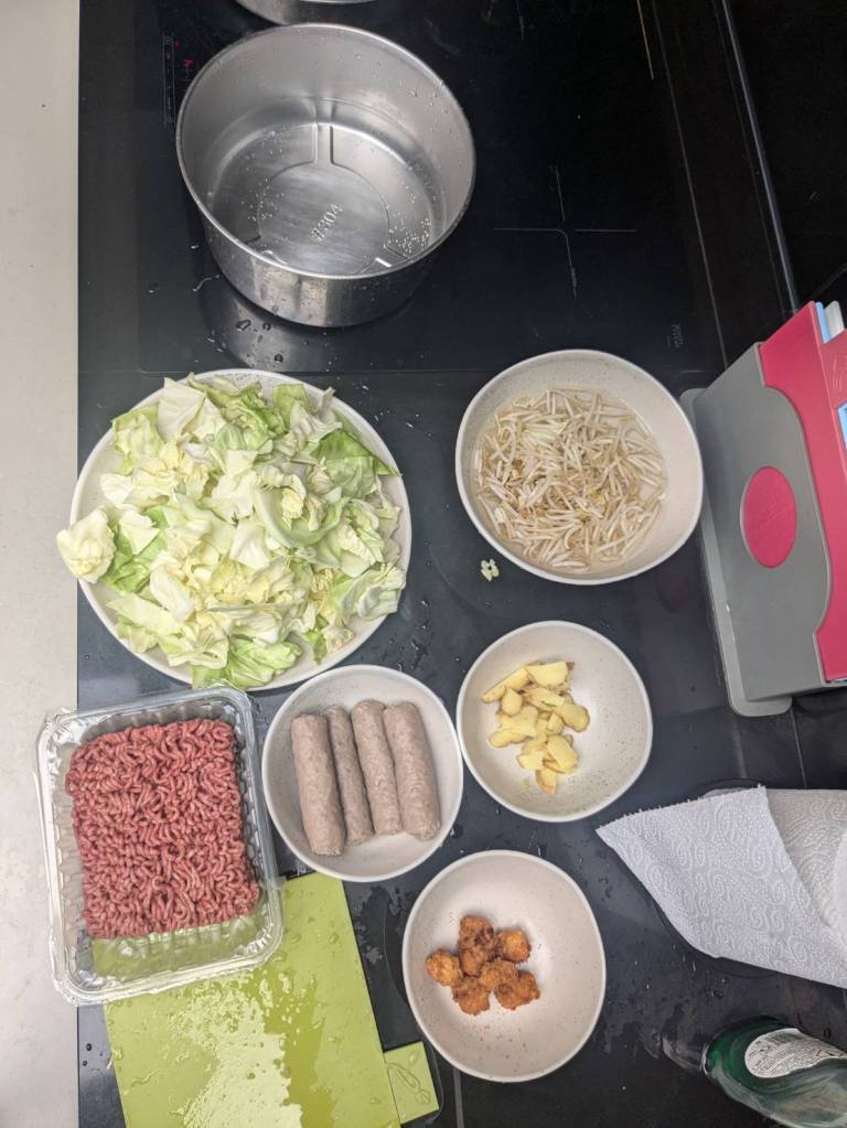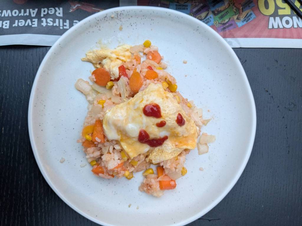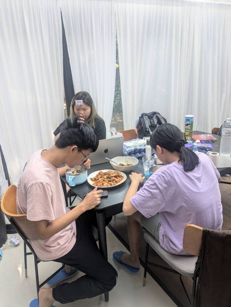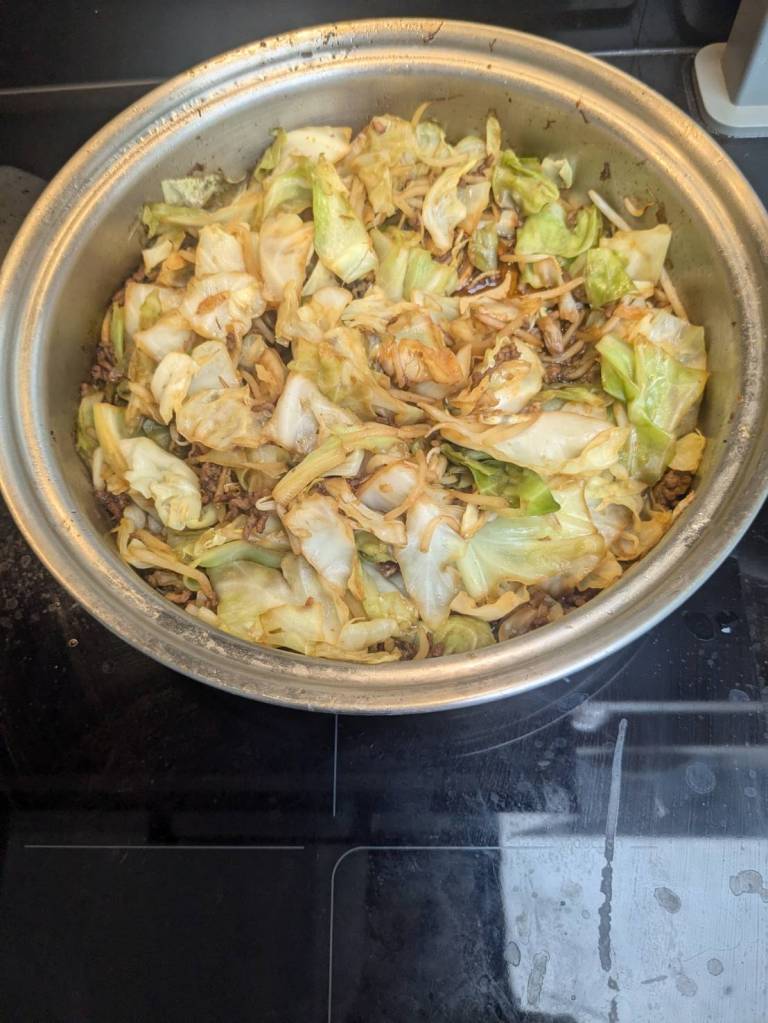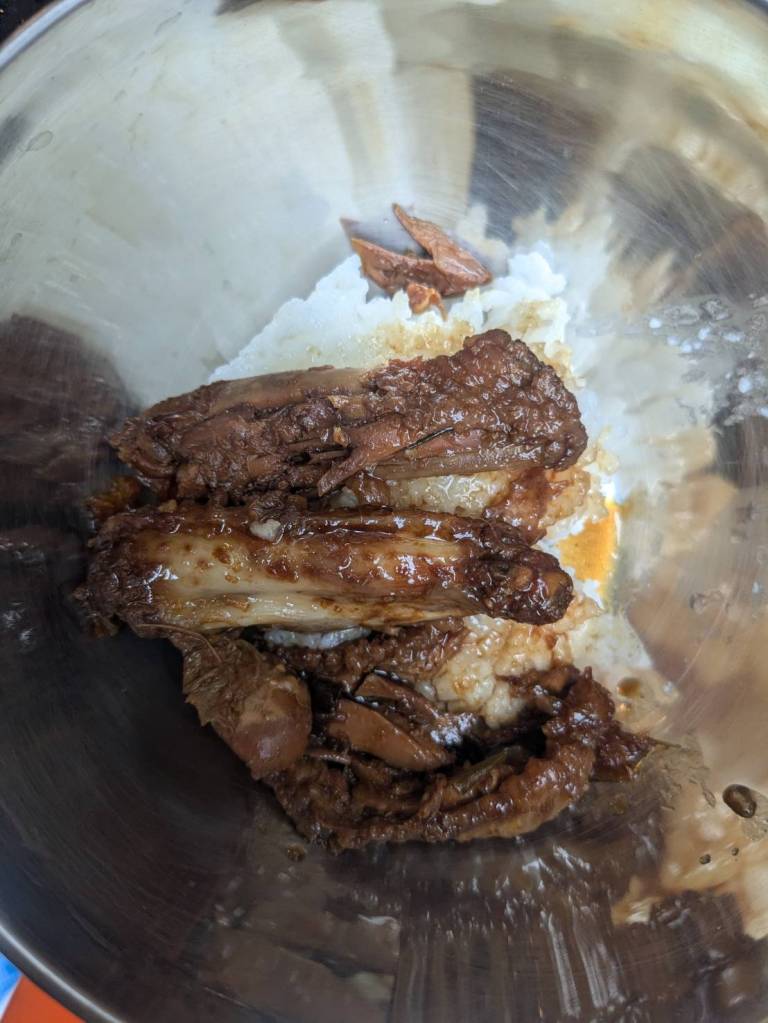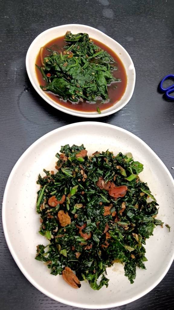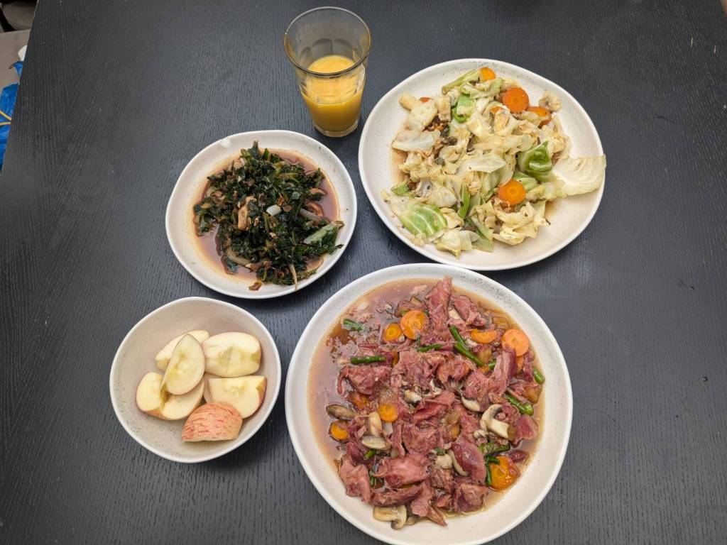 因為小孩子們昨晚吃了很豐盛的火鍋,所以今早只準備了肉燥飯、炒家常菜及海帶芽湯孝敬他們。