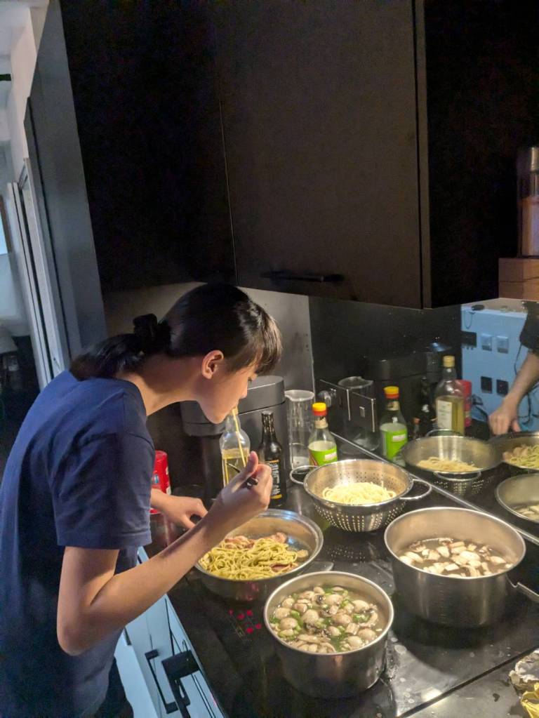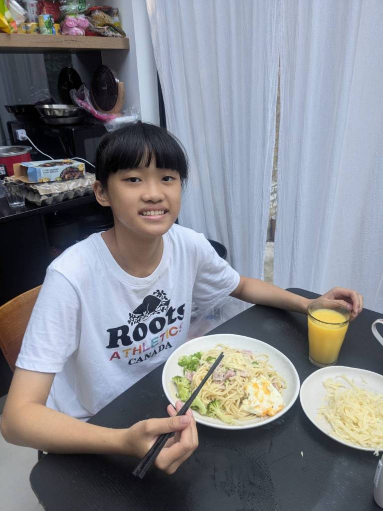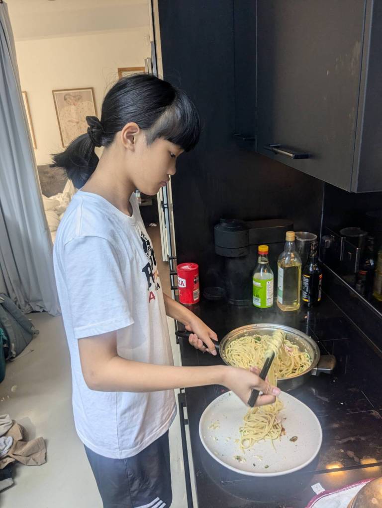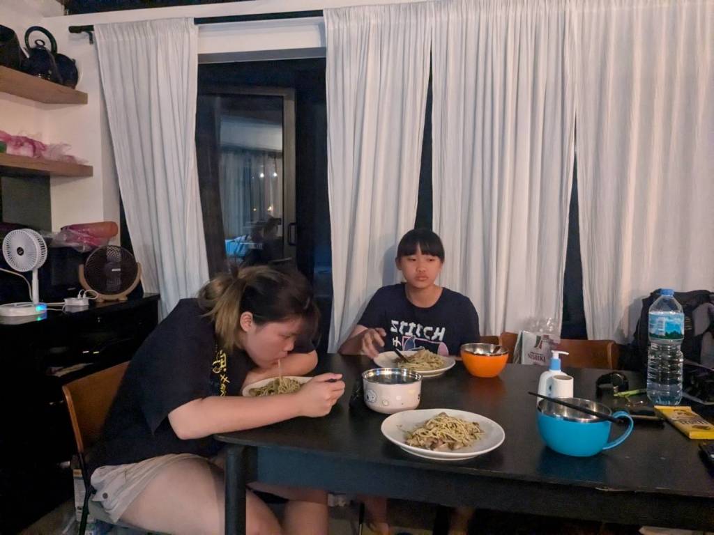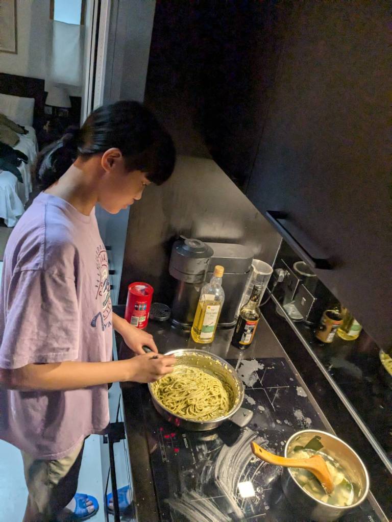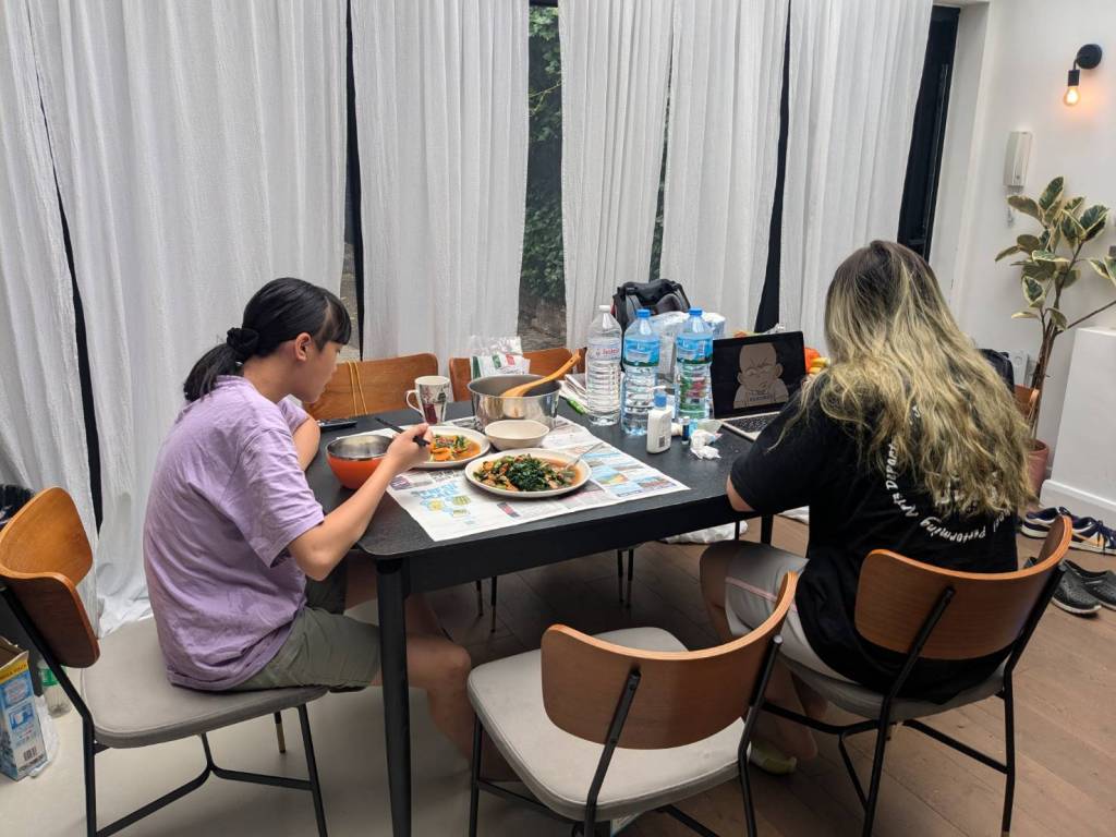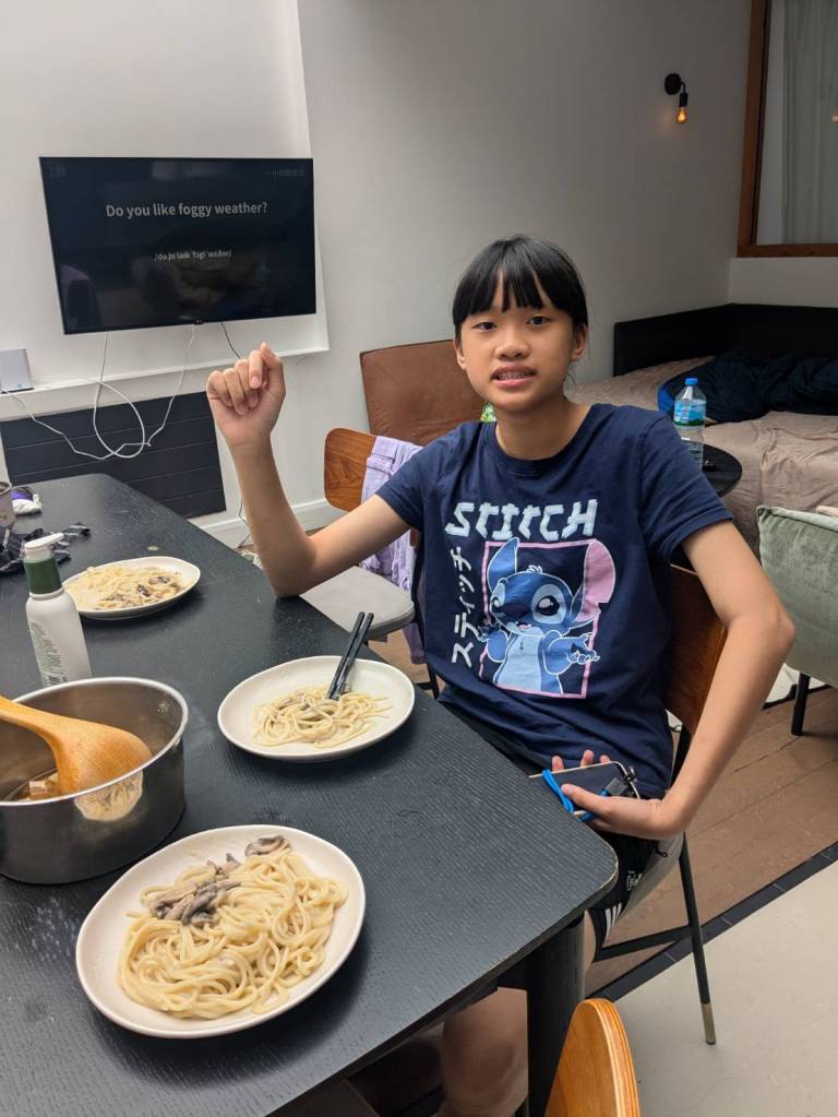 晚上9點回到家,輪到古妹主廚,主菜是青醬義大利麵,我又煮了吃剩的海帶芽湯加豆腐,Amber則料理了一大碗的蒸蛋,又一週的課程結束了。