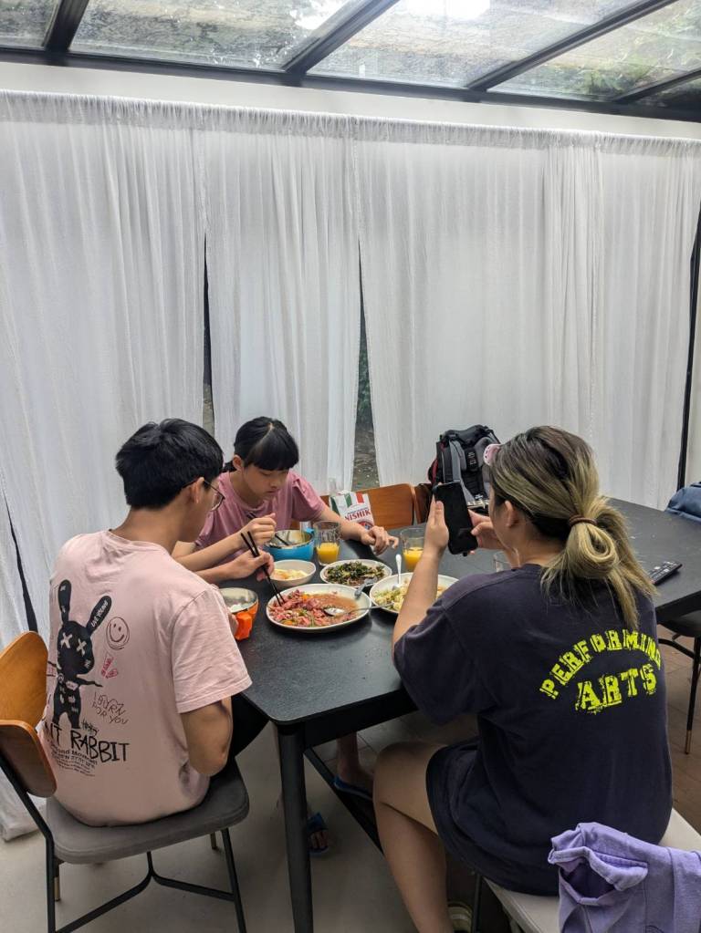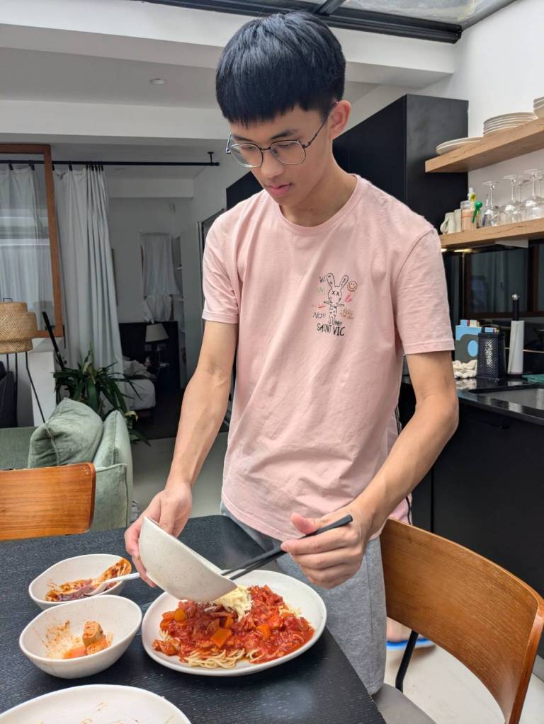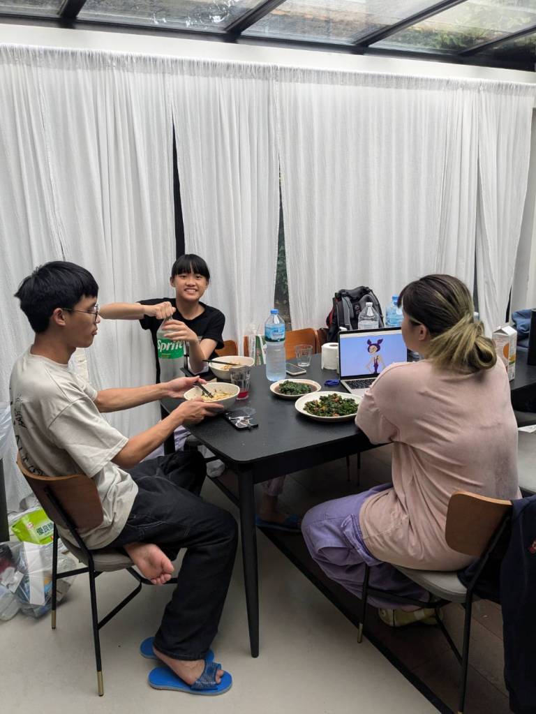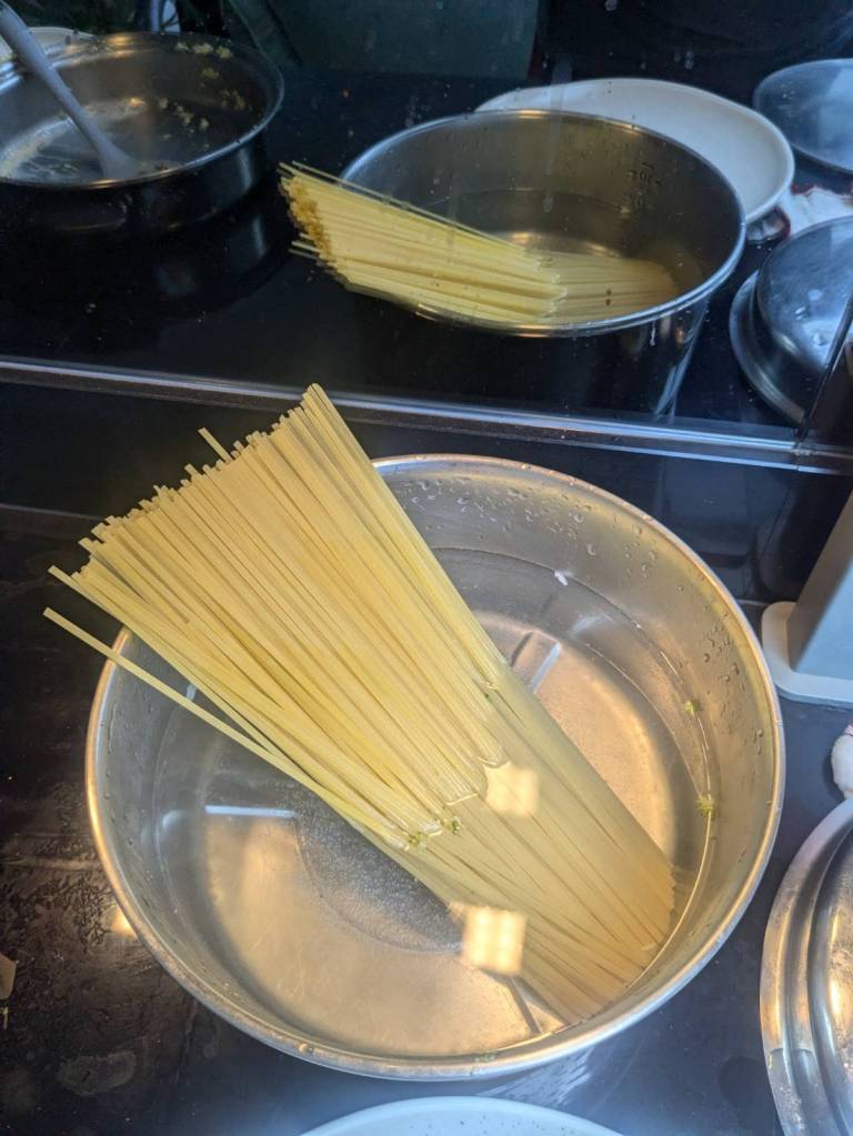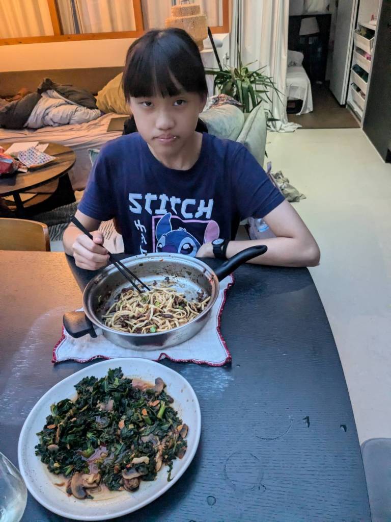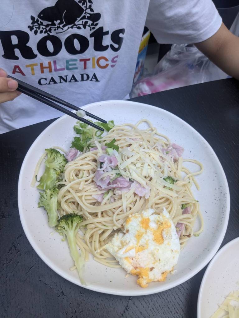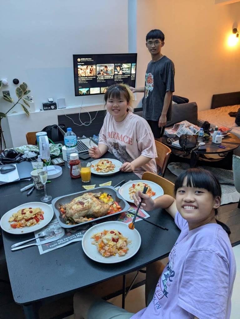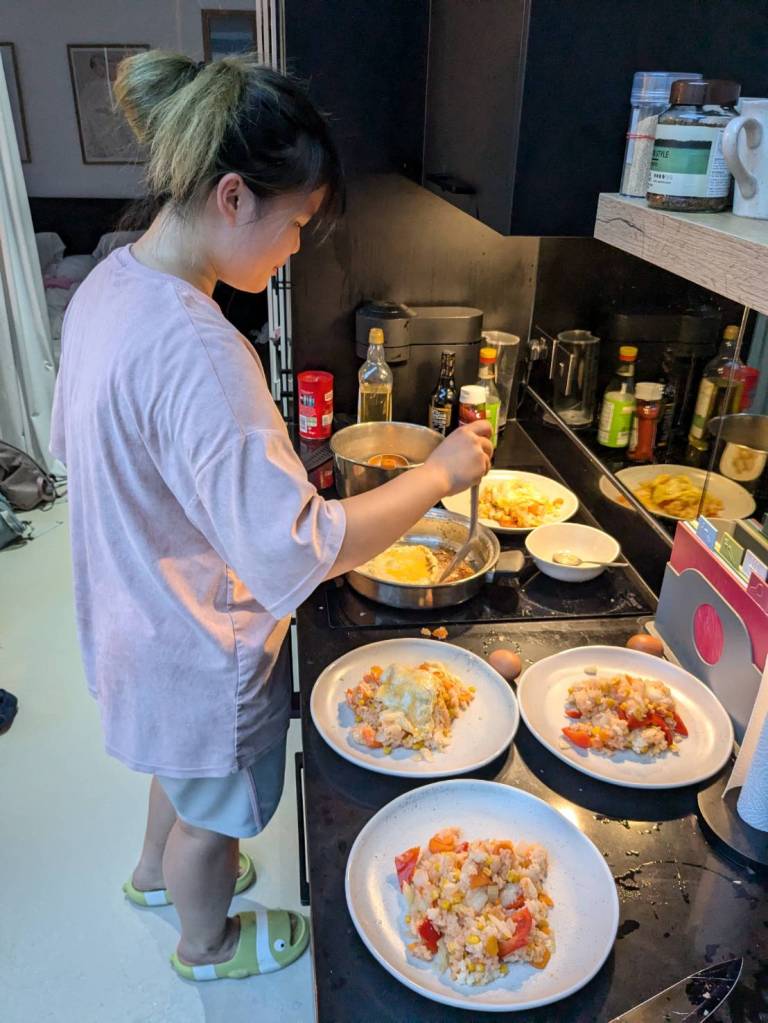 晚上9點回到家,輪到古妹主廚,主菜是青醬義大利麵,我又煮了吃剩的海帶芽湯加豆腐,Amber則料理了一大碗的蒸蛋,又一週的課程結束了。