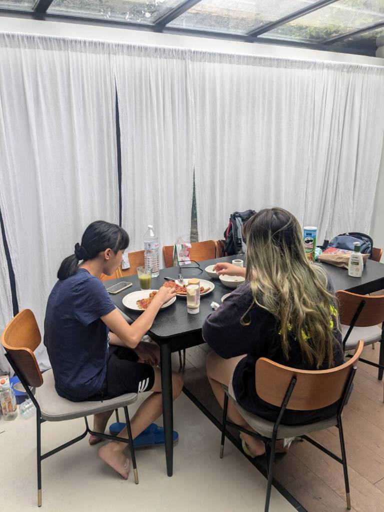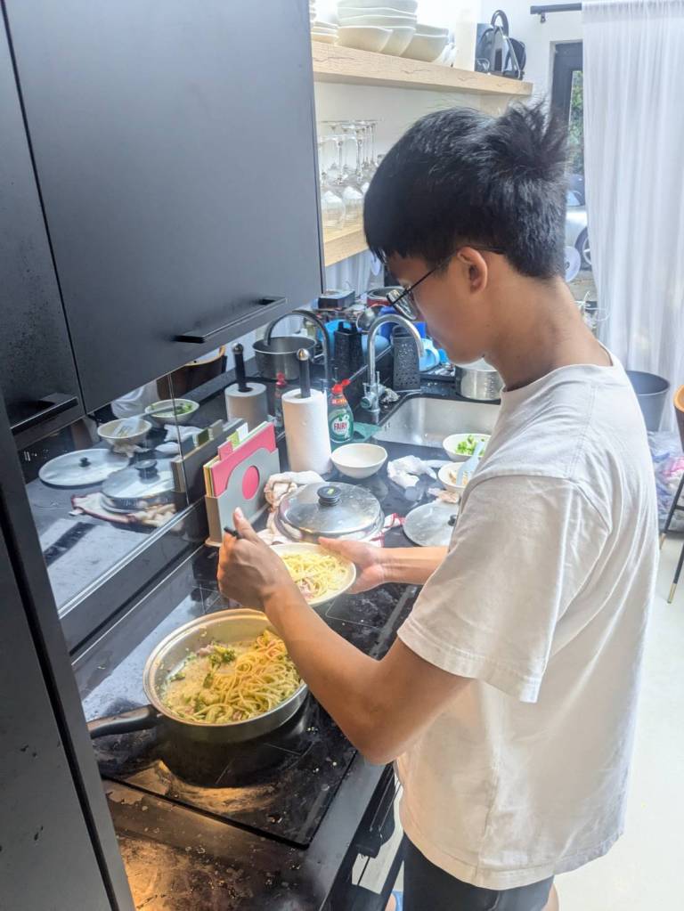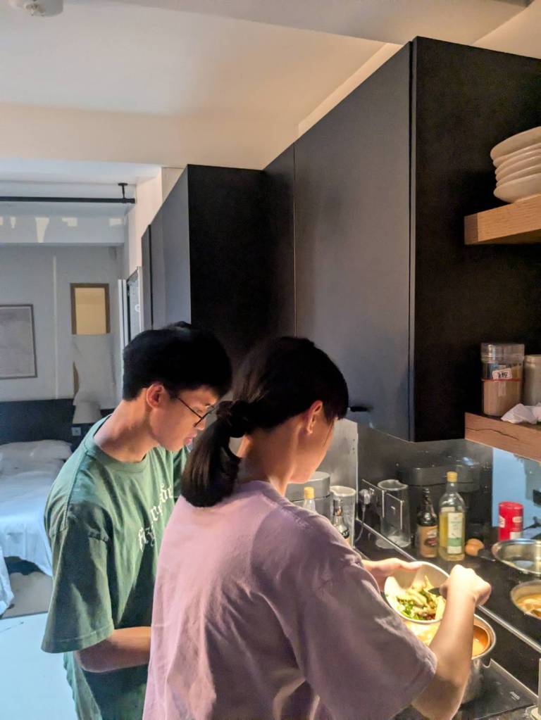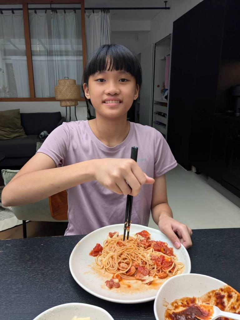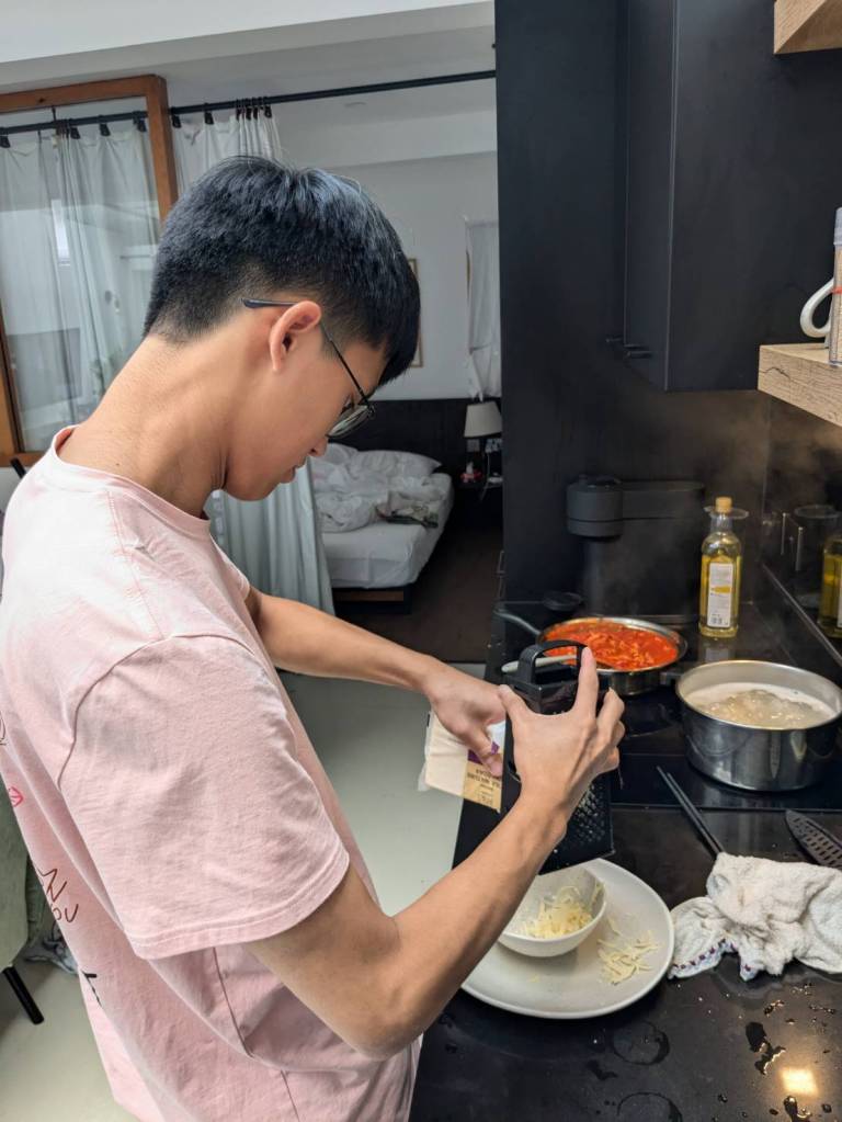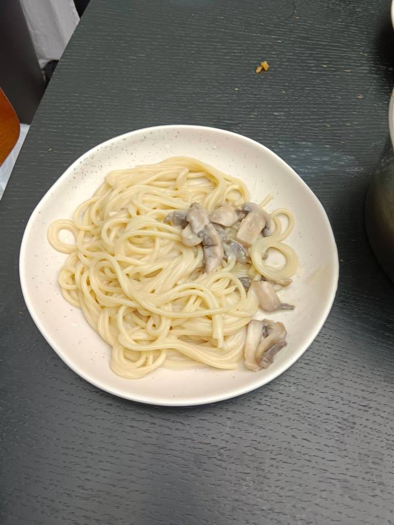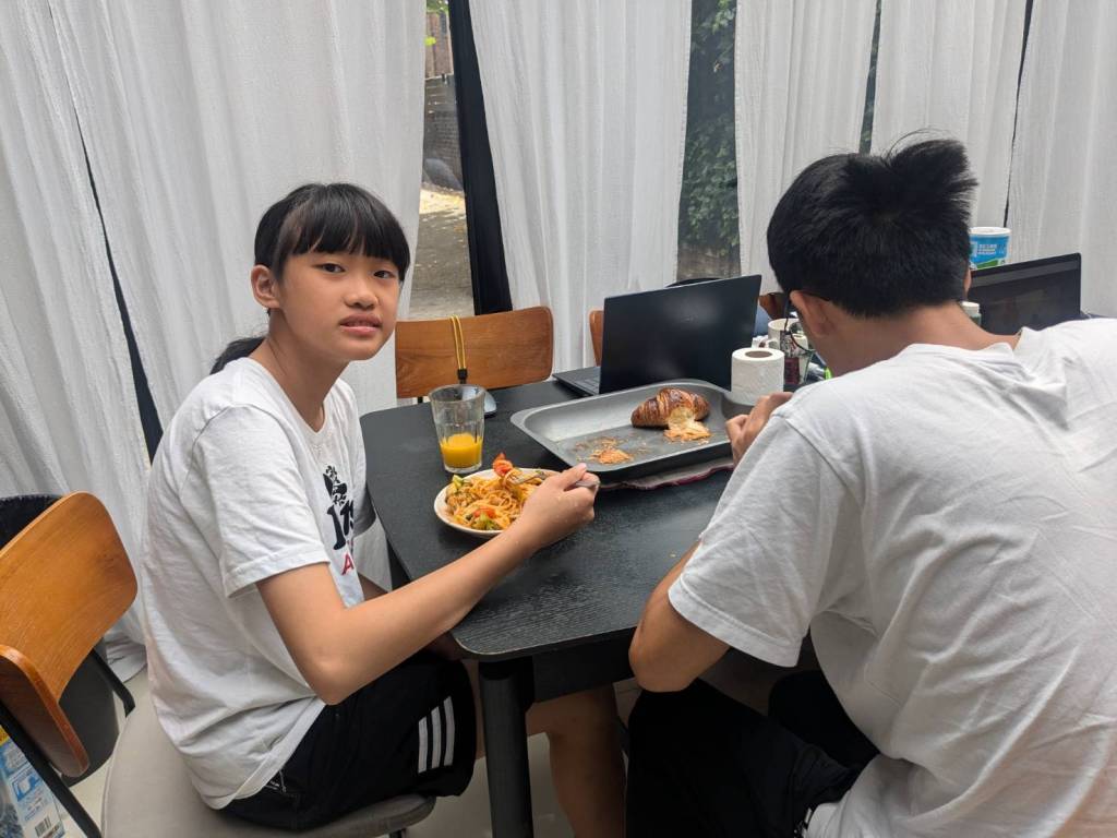 晚上9點回到家,輪到古妹主廚,主菜是青醬義大利麵,我又煮了吃剩的海帶芽湯加豆腐,Amber則料理了一大碗的蒸蛋,又一週的課程結束了。