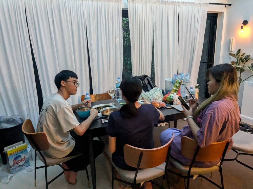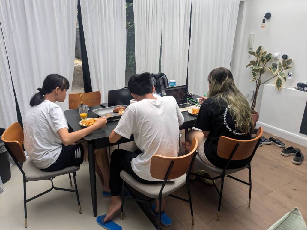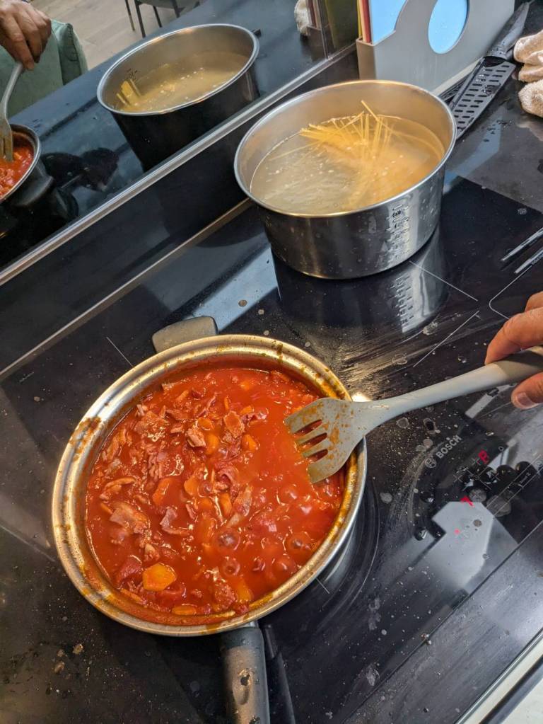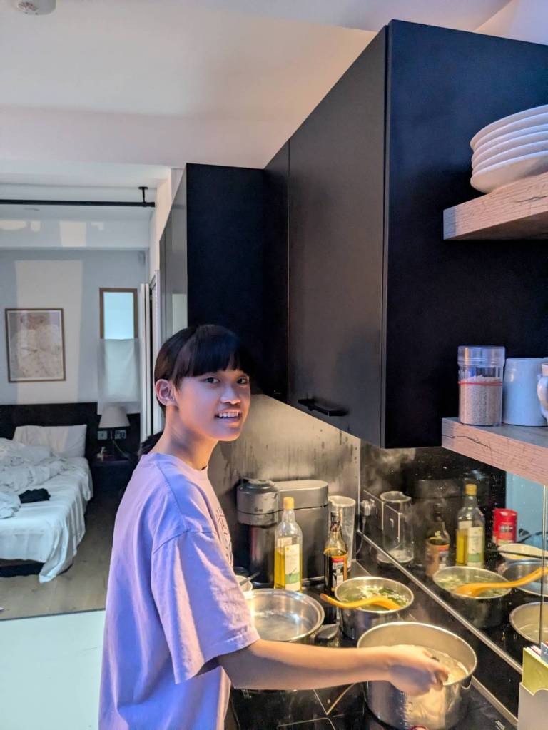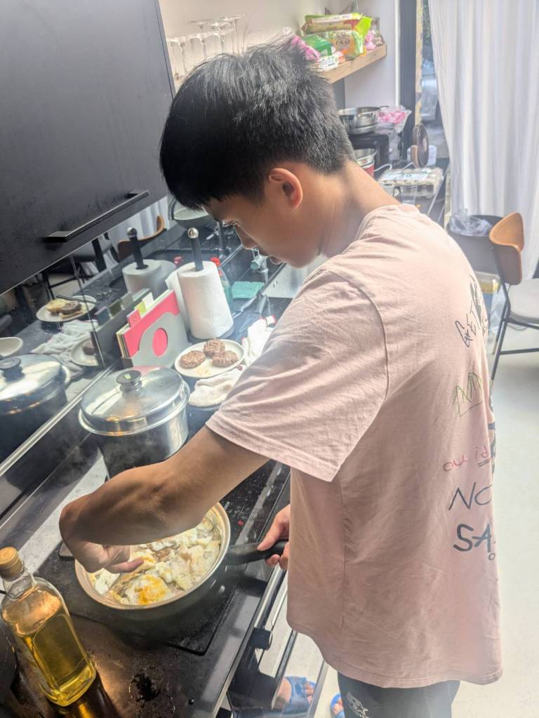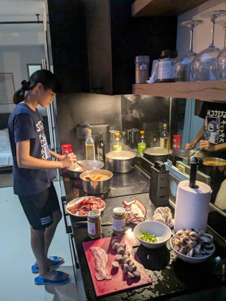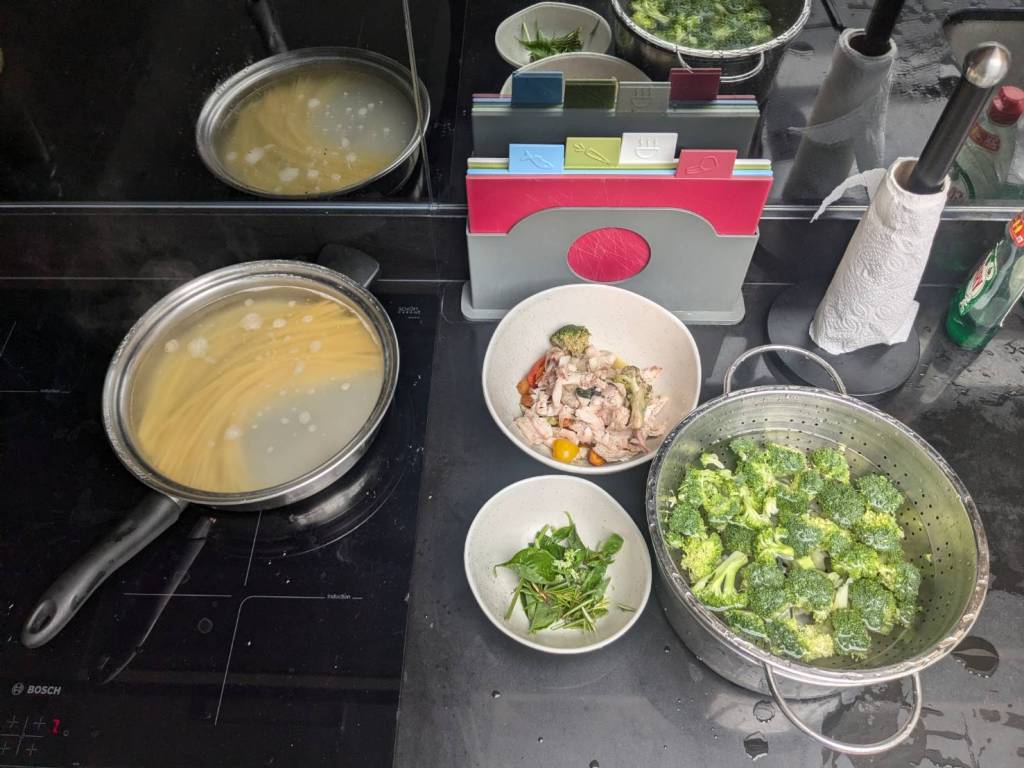晚上9點回到家,輪到古妹主廚,主菜是青醬義大利麵,我又煮了吃剩的海帶芽湯加豆腐,Amber則料理了一大碗的蒸蛋,又一週的課程結束了。