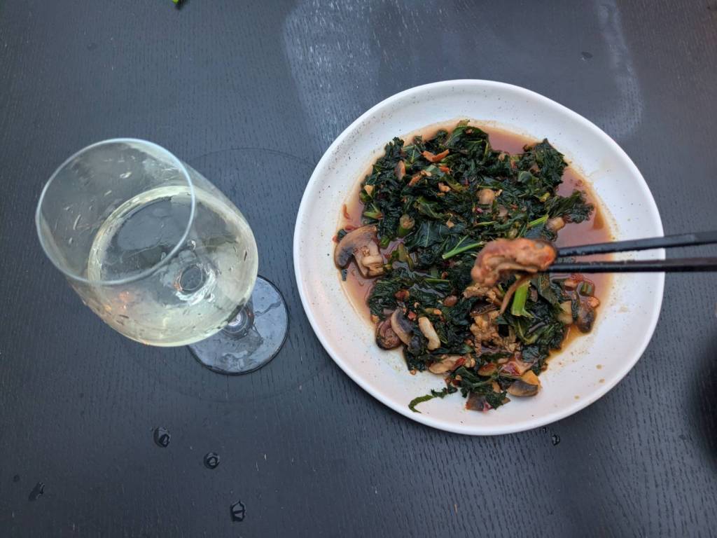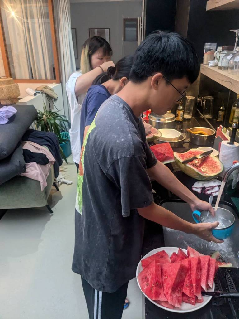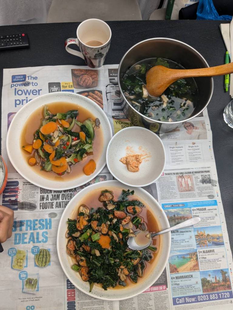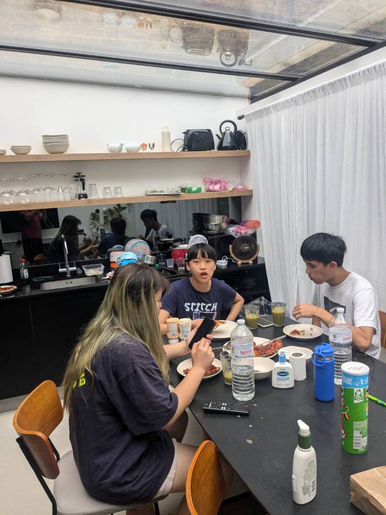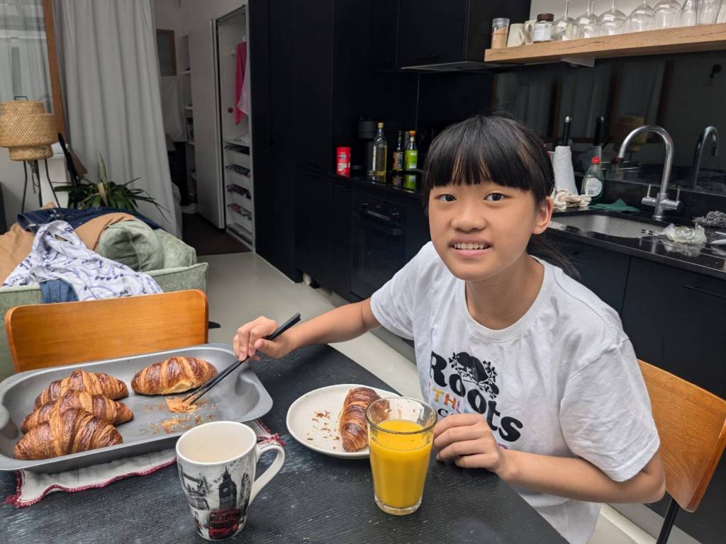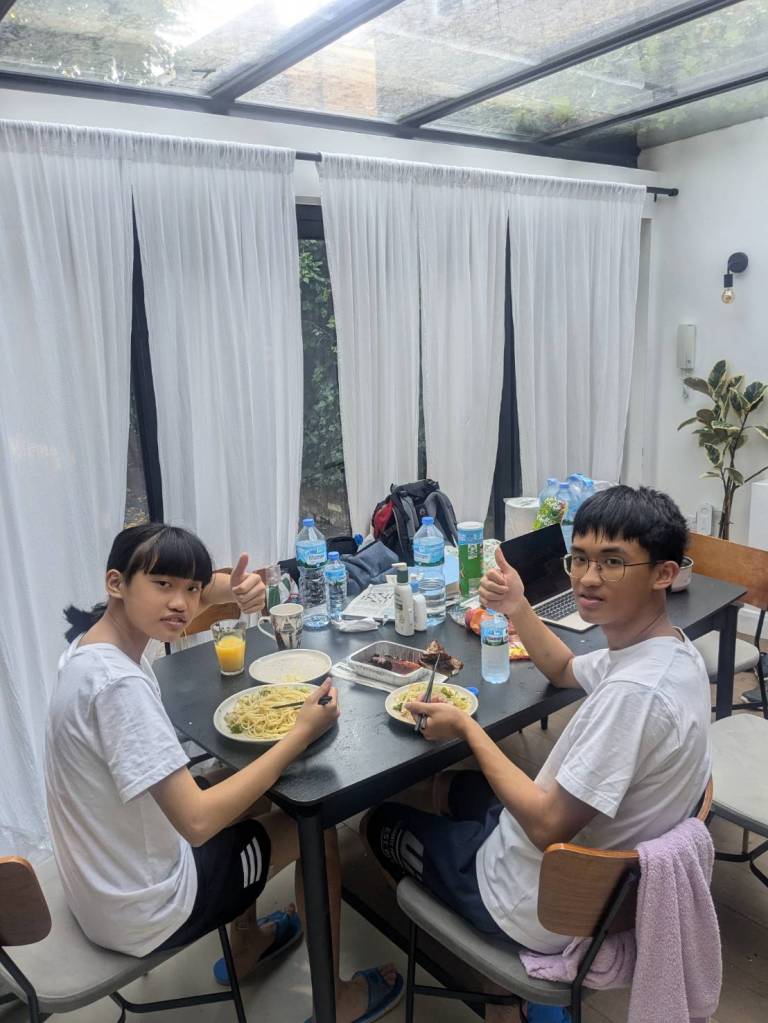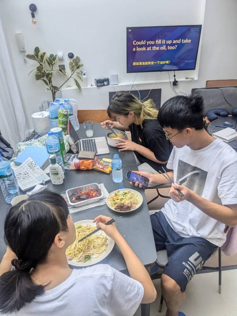 晚上9點回到家,輪到古妹主廚,主菜是青醬義大利麵,我又煮了吃剩的海帶芽湯加豆腐,Amber則料理了一大碗的蒸蛋,又一週的課程結束了。