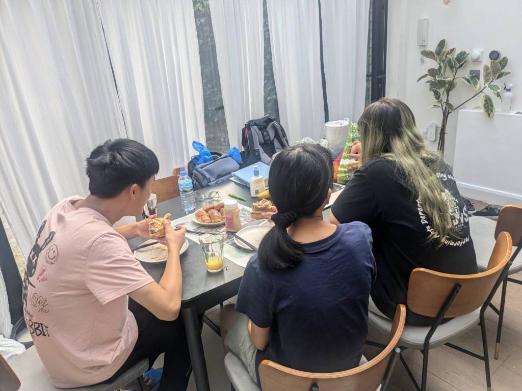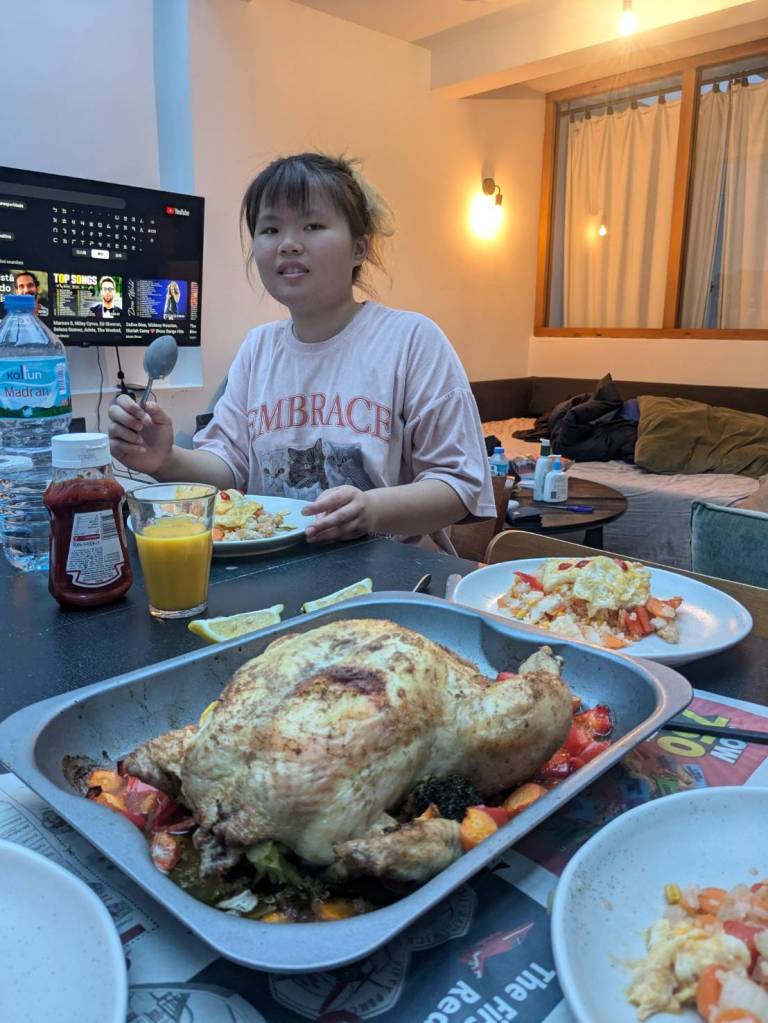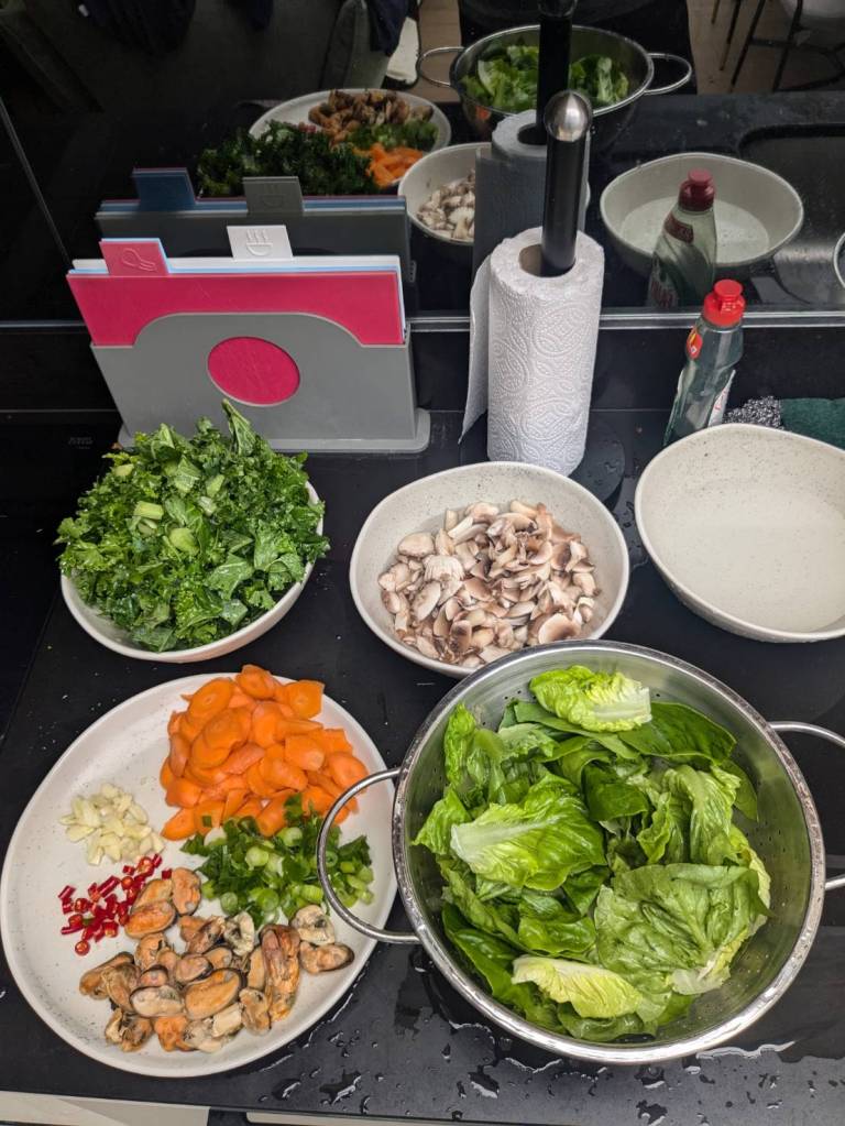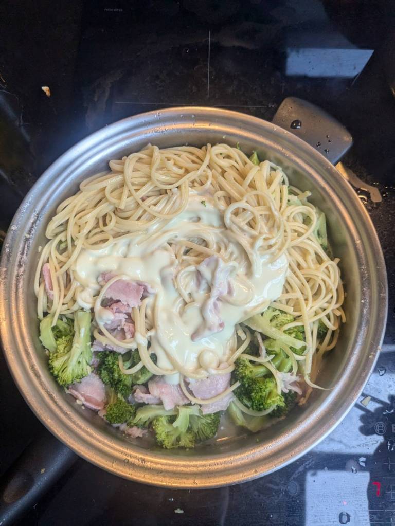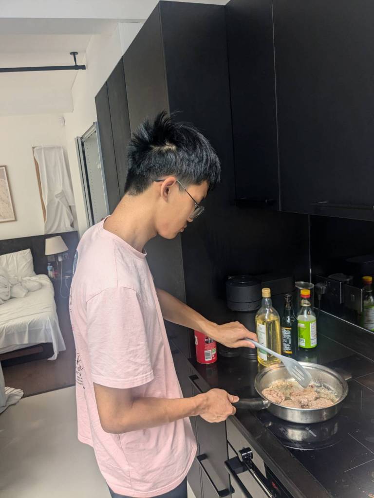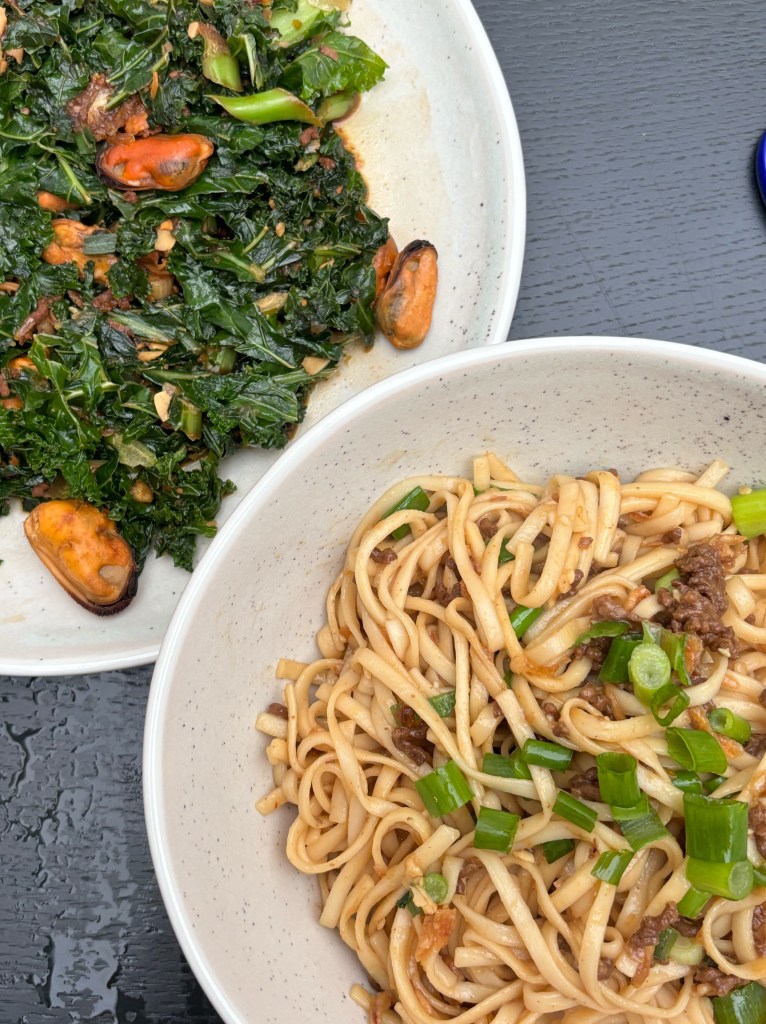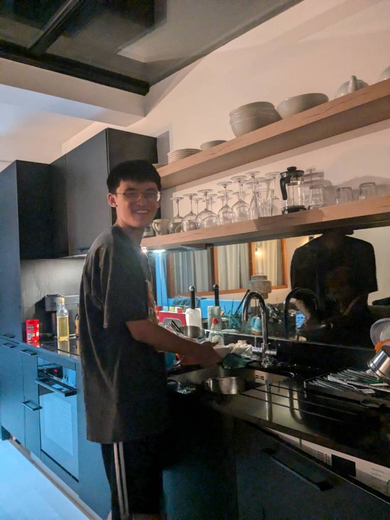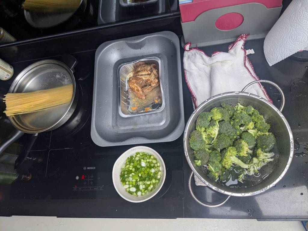 晚上9點回到家,輪到古妹主廚,主菜是青醬義大利麵,我又煮了吃剩的海帶芽湯加豆腐,Amber則料理了一大碗的蒸蛋,又一週的課程結束了。