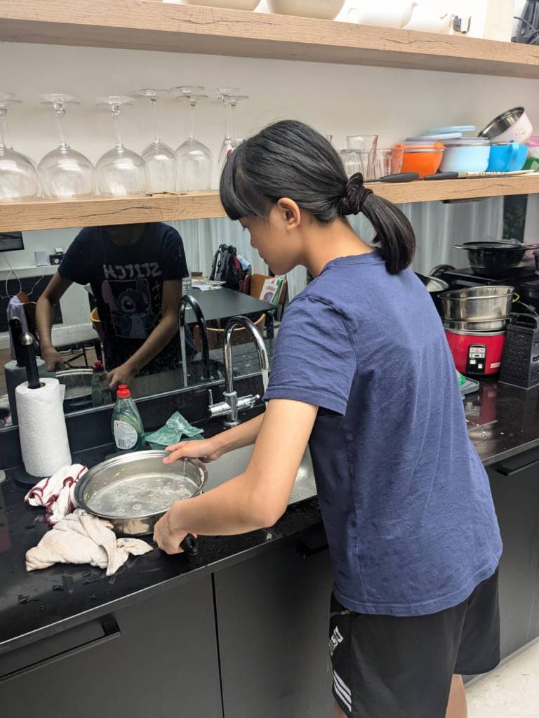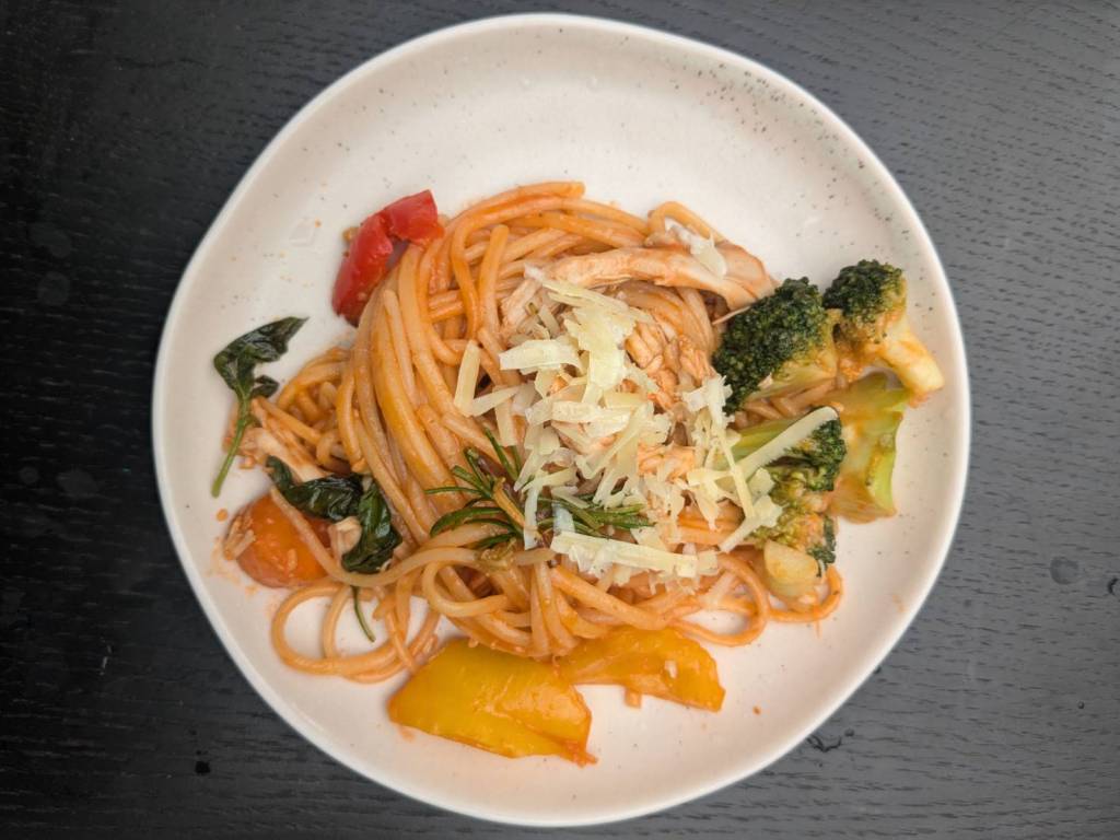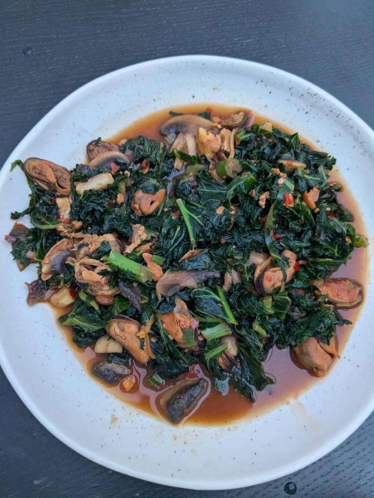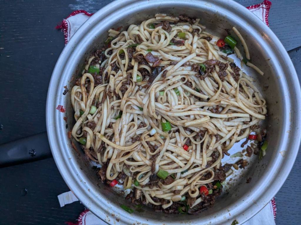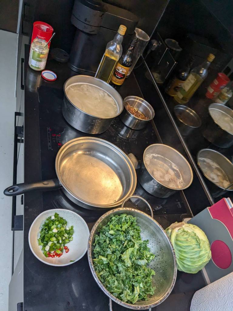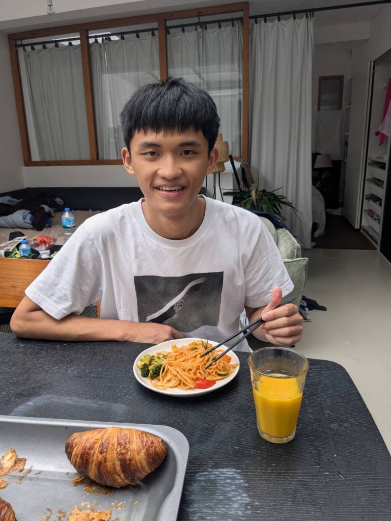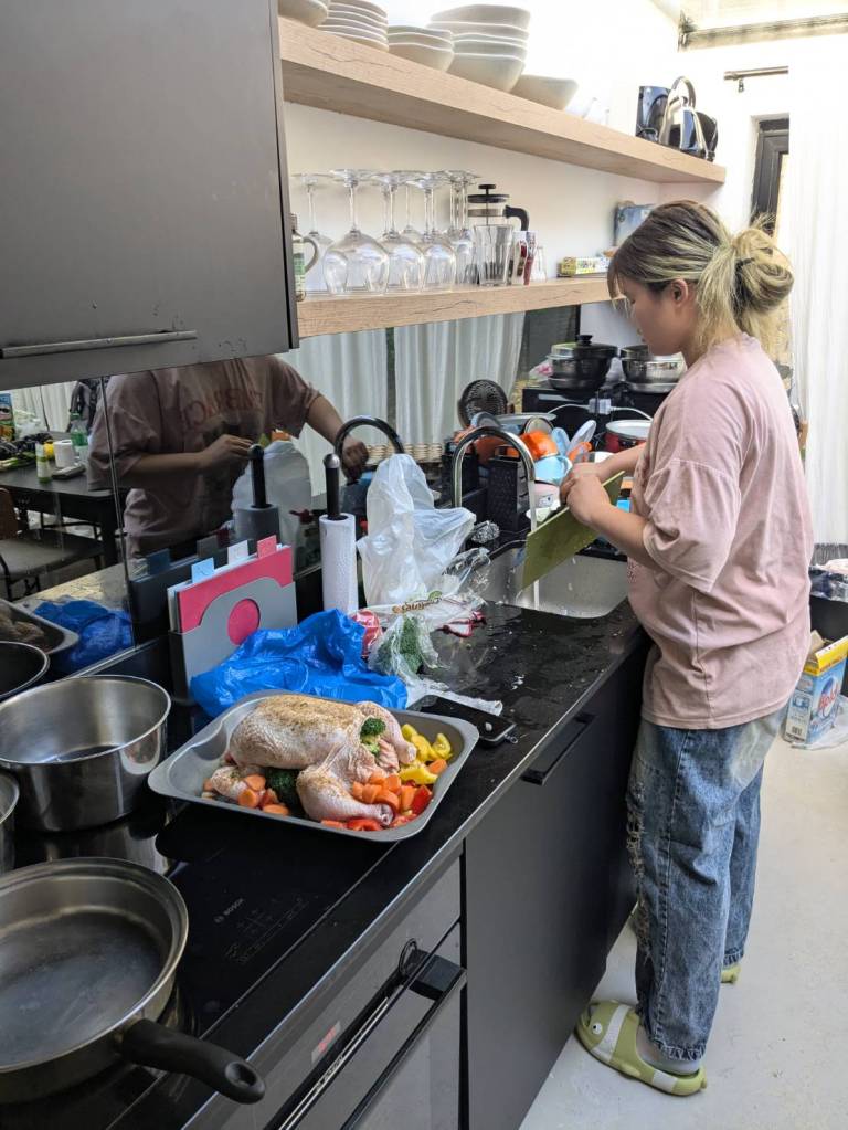 晚上9點回到家,輪到古妹主廚,主菜是青醬義大利麵,我又煮了吃剩的海帶芽湯加豆腐,Amber則料理了一大碗的蒸蛋,又一週的課程結束了。