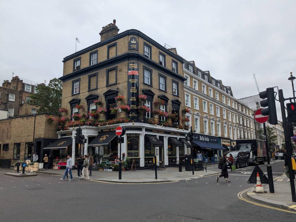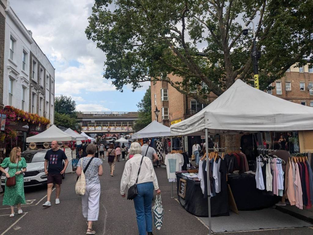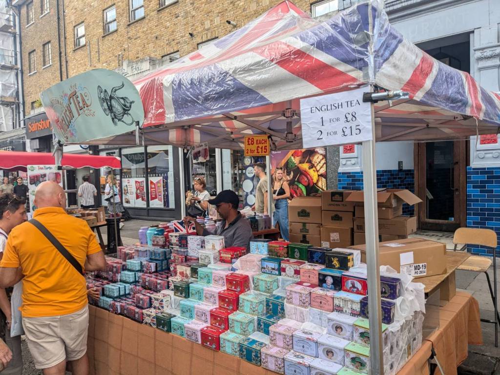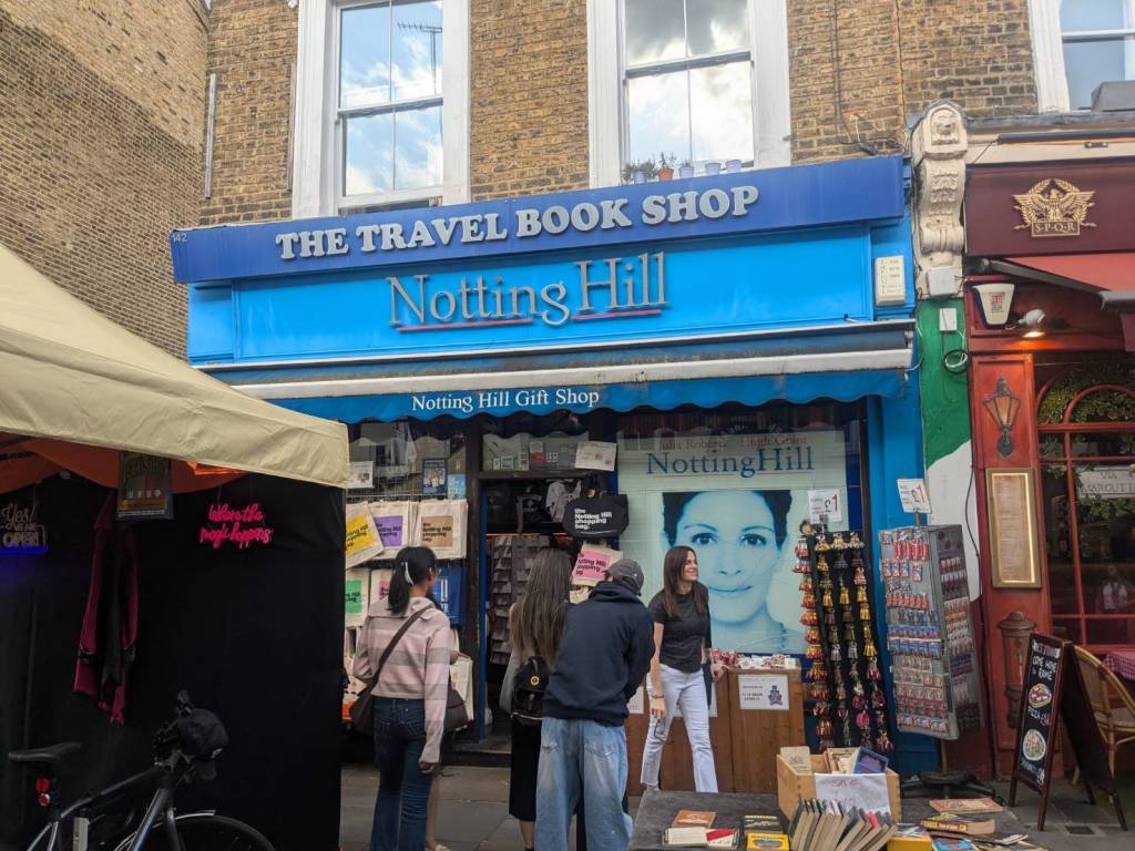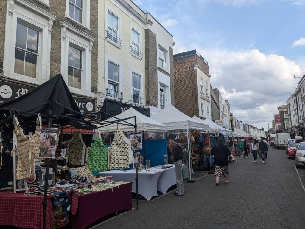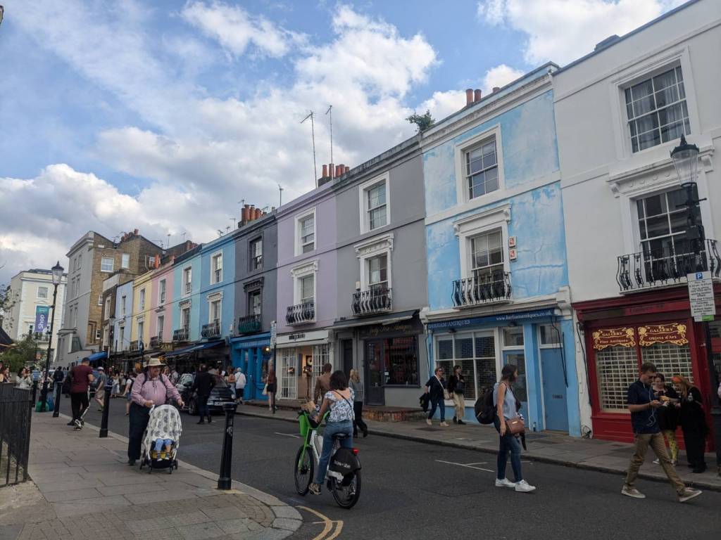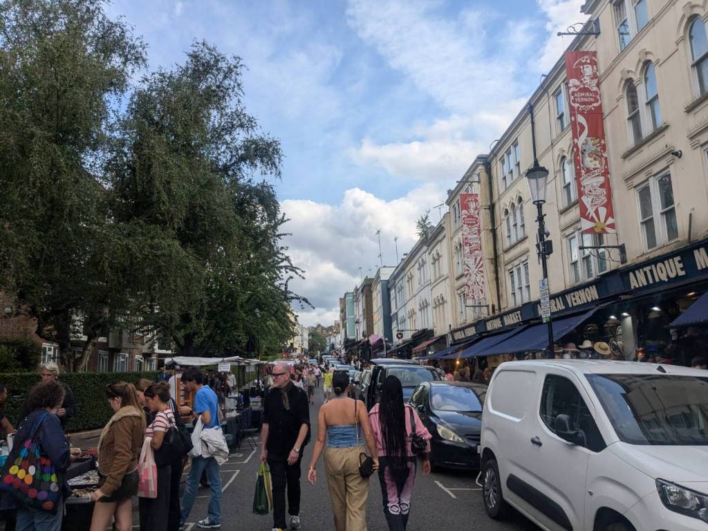 穿越「波多貝羅市集」(Portobello Road Market),在這條熱鬧的在地多元市集,販售各式復古商品、街頭小吃、紀念品及琳瑯滿目的商品,主要是開在週六,但今天週五也有蠻多商家與人潮的。