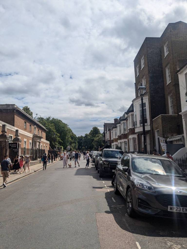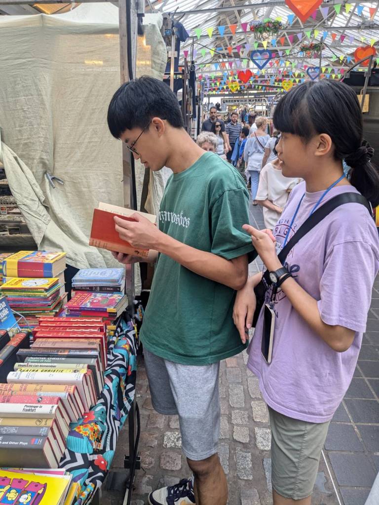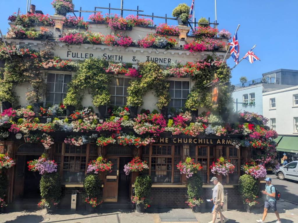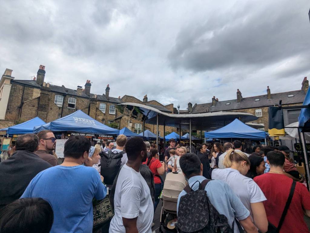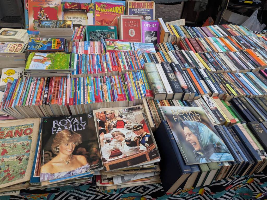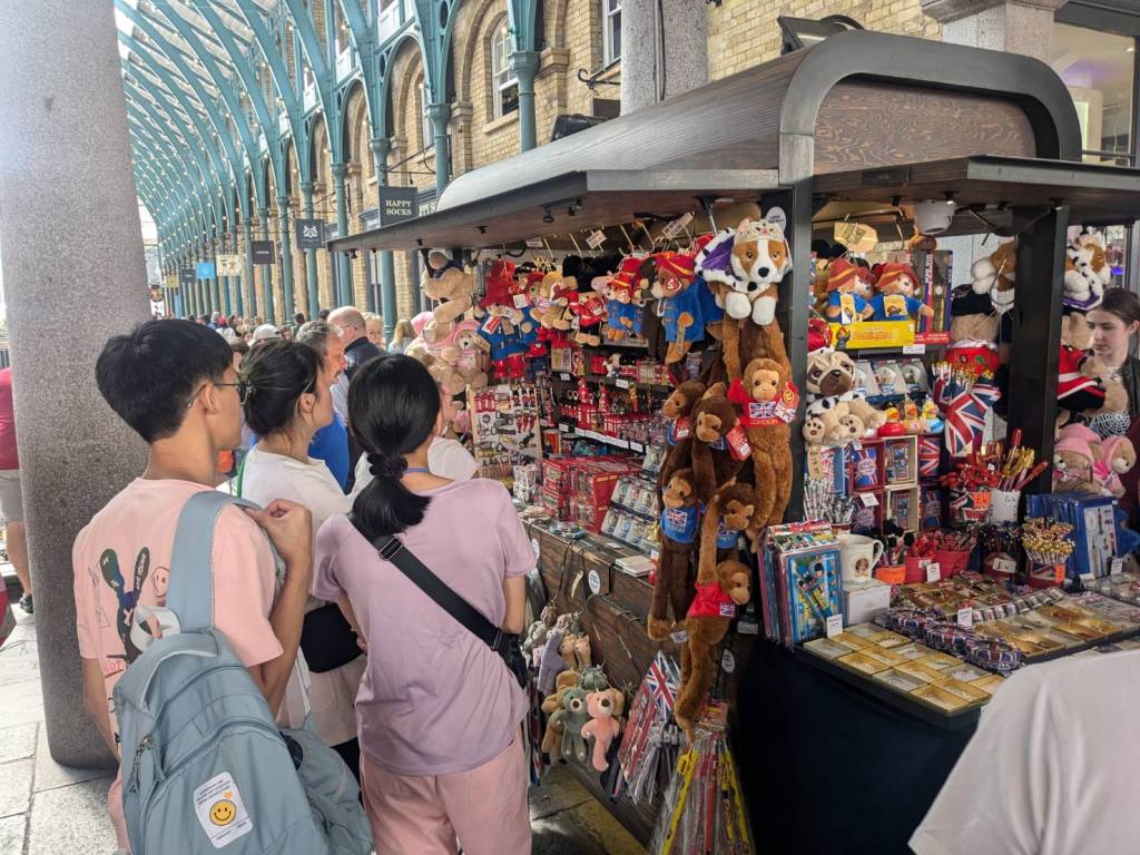 穿越「波多貝羅市集」(Portobello Road Market),在這條熱鬧的在地多元市集,販售各式復古商品、街頭小吃、紀念品及琳瑯滿目的商品,主要是開在週六,但今天週五也有蠻多商家與人潮的。