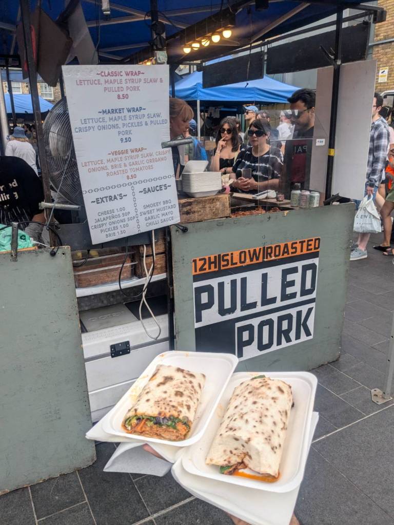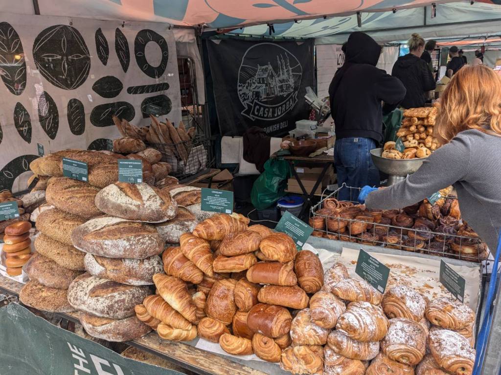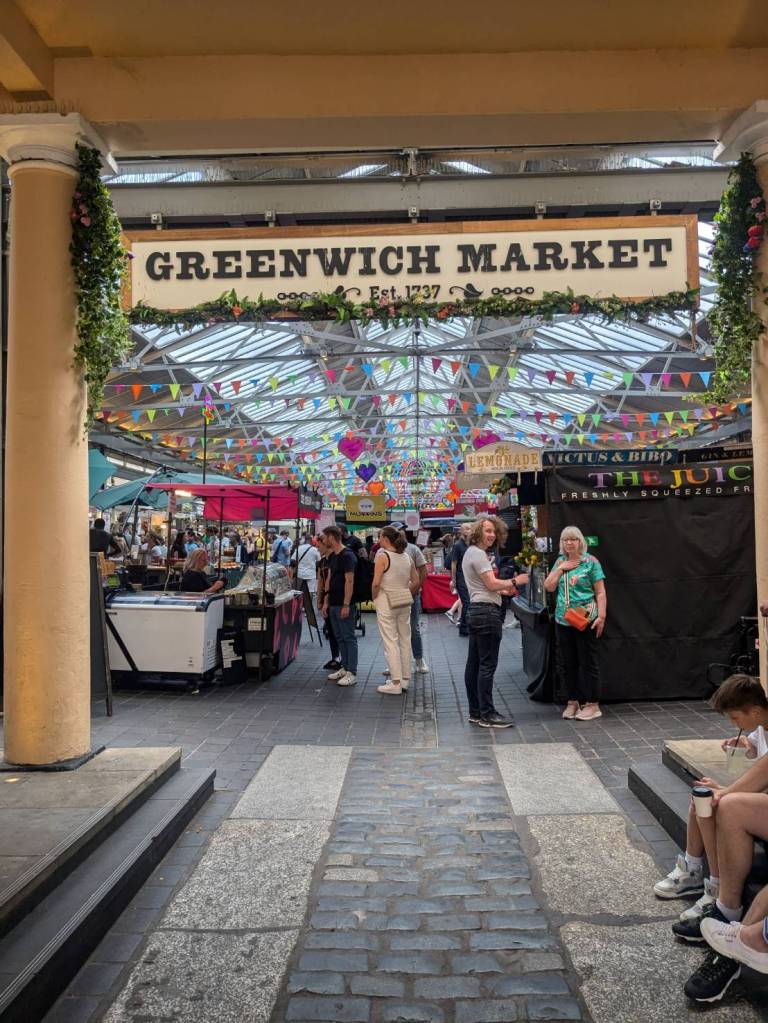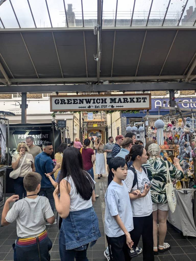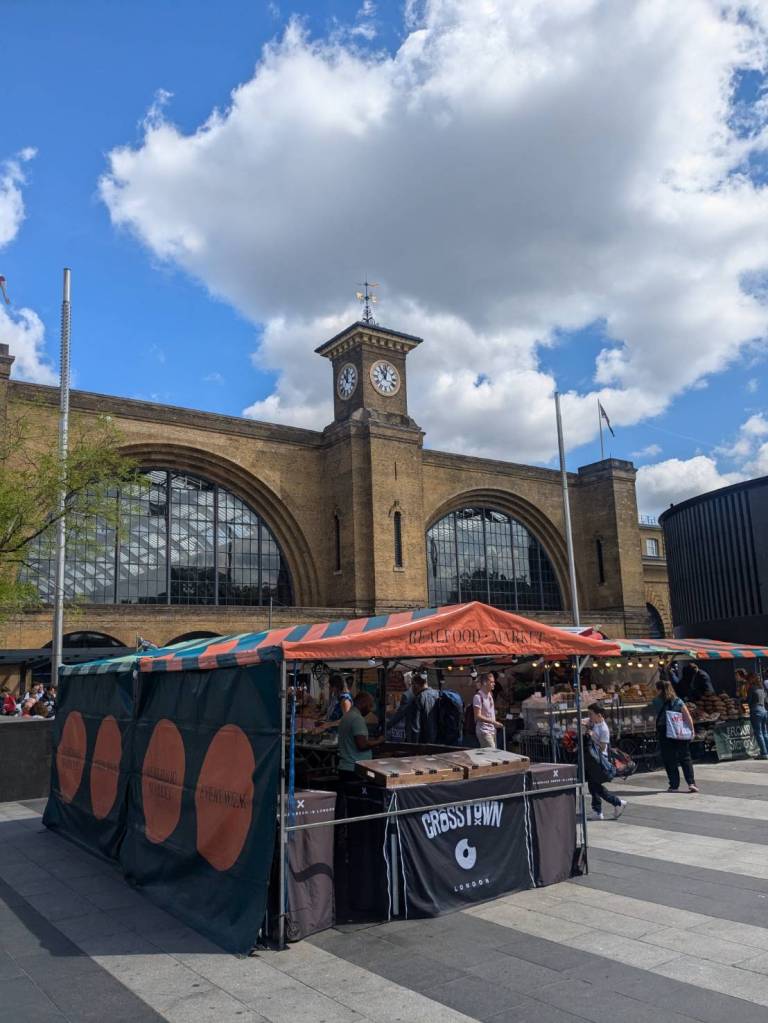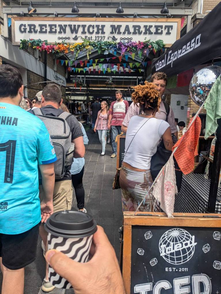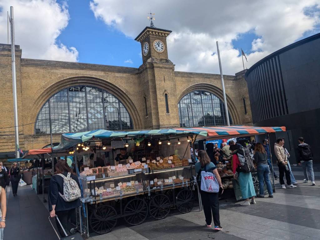 穿越「波多貝羅市集」(Portobello Road Market),在這條熱鬧的在地多元市集,販售各式復古商品、街頭小吃、紀念品及琳瑯滿目的商品,主要是開在週六,但今天週五也有蠻多商家與人潮的。