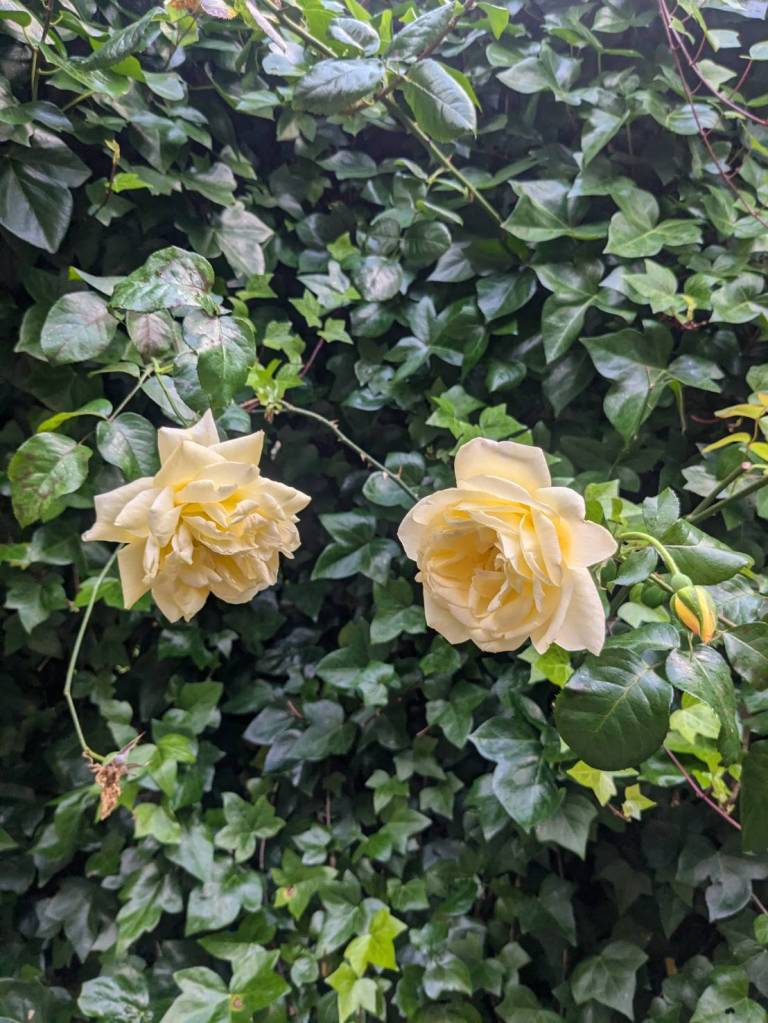 上午悠閒地在家渡過,週五都是2點開始的課程,我們發現門外藤蔓牆的黃色「木香花」(Rosa banksiae Ait.)開了2朵,綻放燦爛如錦秀,花香濃郁,其他朵也在含苞待放中。