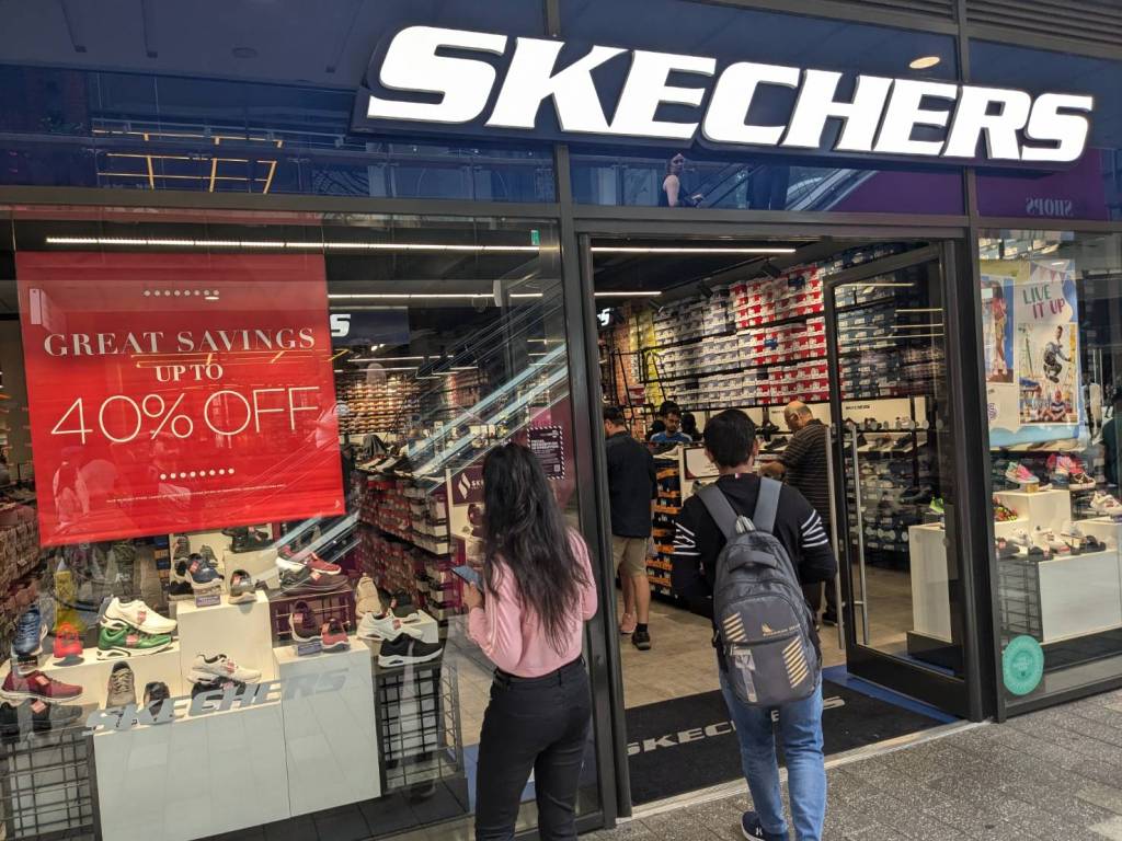 小孩子們喜歡看鞋子,他們看了「Adidas」、「Skechers」,現在過馬路要去看「Nike」。