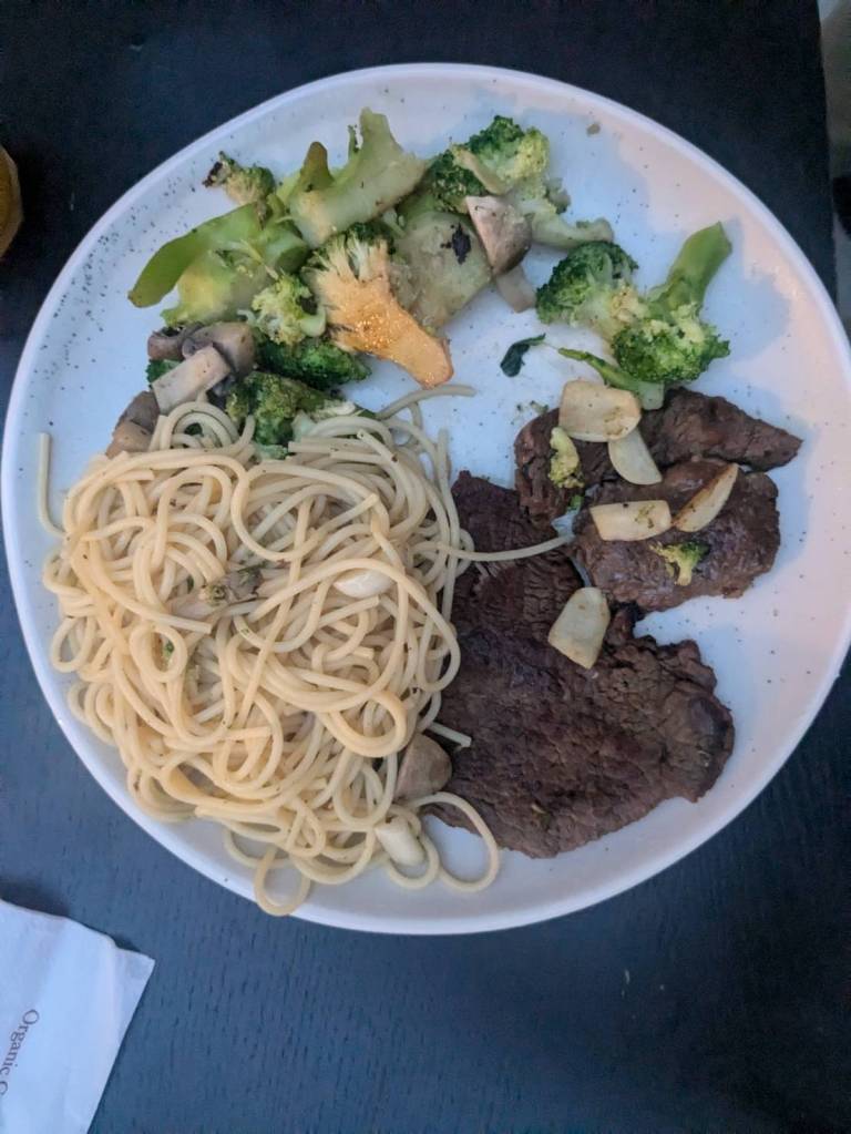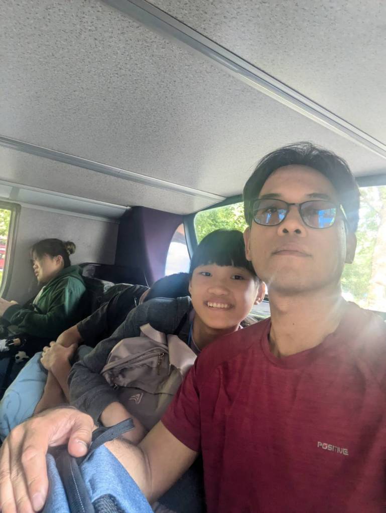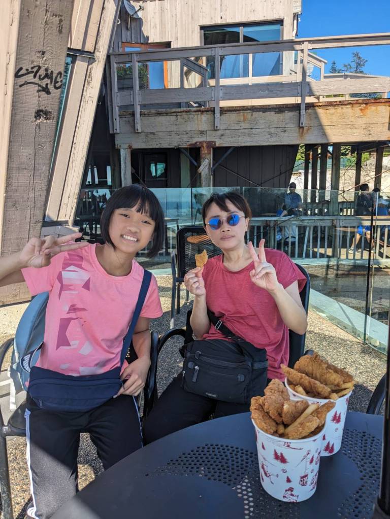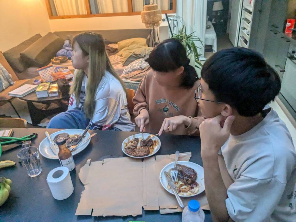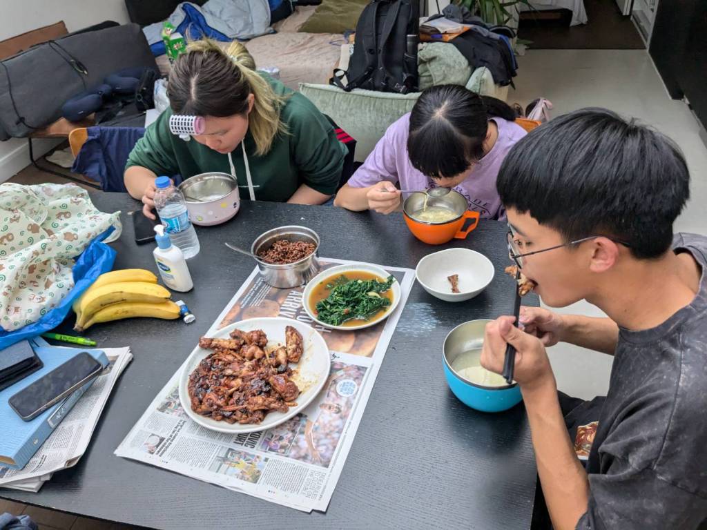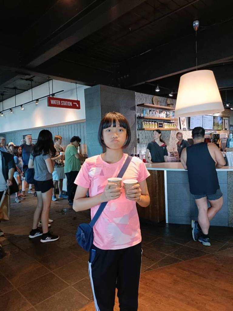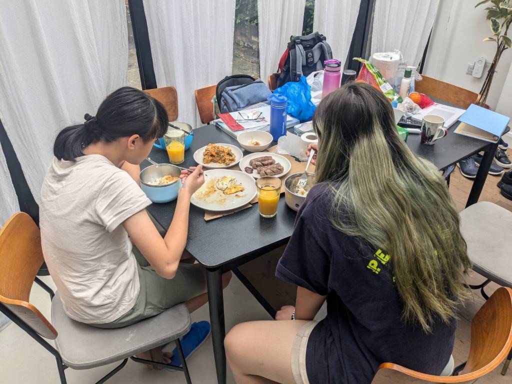 還好今早早餐在昨天有先準備好,基本上是超市的麵包、牛奶穀片,還有沾醬炸薯條雞塊,好像熱量都有些兒高。。。