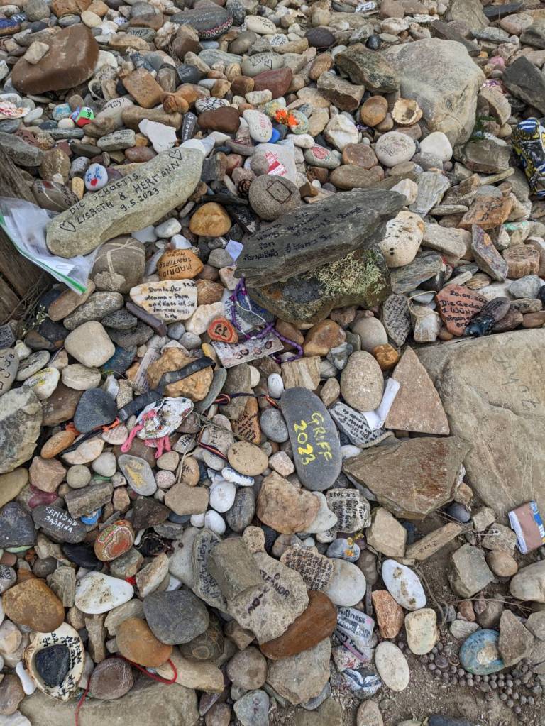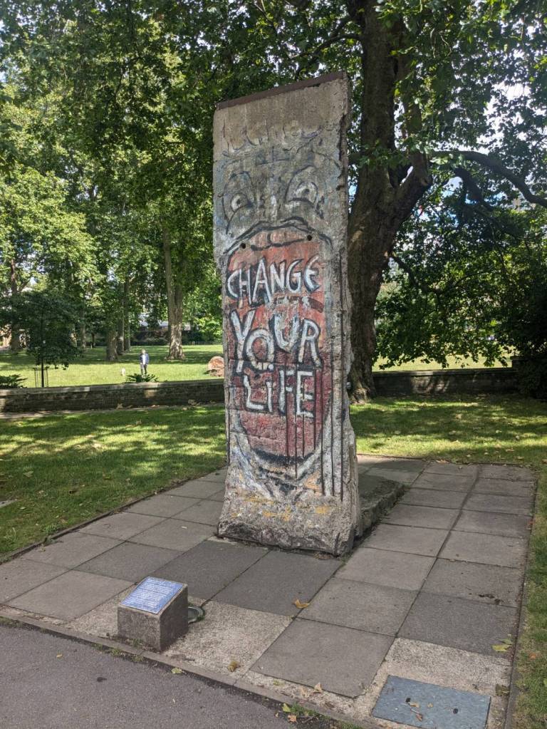 下午3點,我們心滿意足地離開博物館,無意發現一面牆面斑駁、塗鴉特別的「紀念品」,近看才知道原來是「柏林圍牆」(Berlin Wall)的遺物,這樣也能載到這裡展示,真是佩服「英國」對於歷史價值的重視。