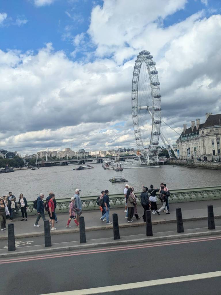 人潮擁擠地穿梭,12;10分踏上「西敏橋」(Westminster Bridge)。