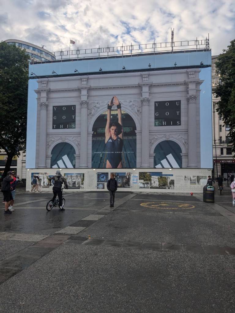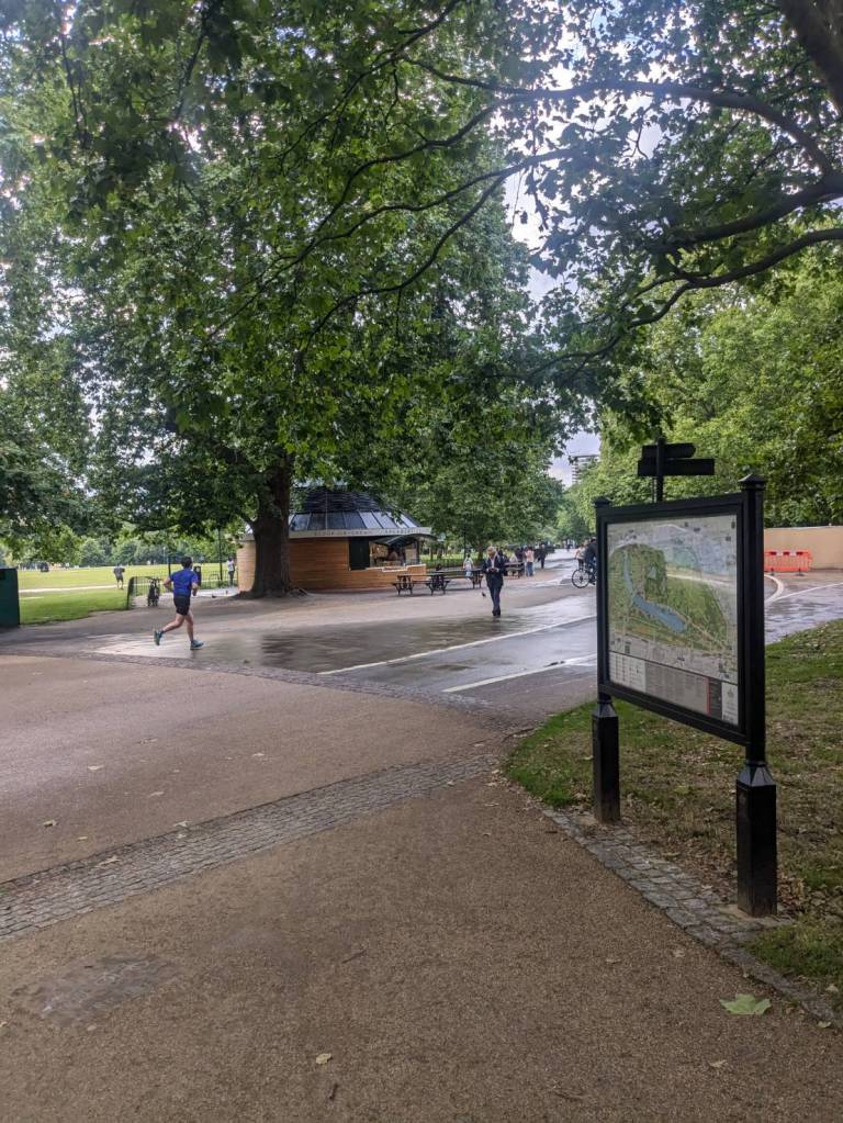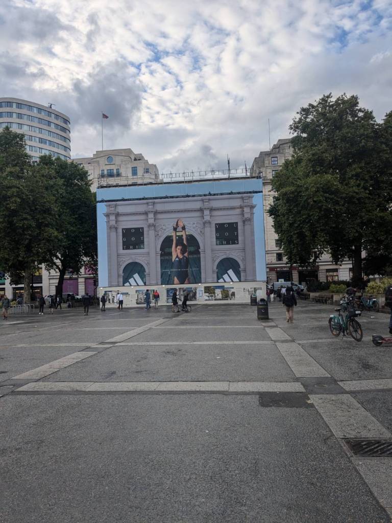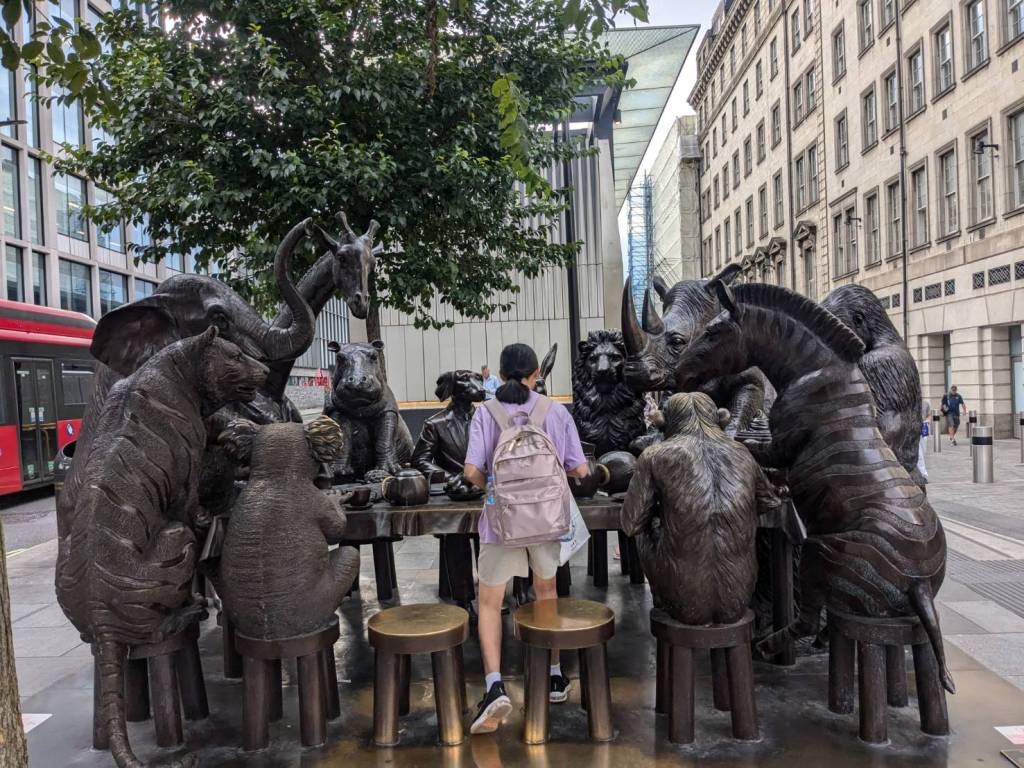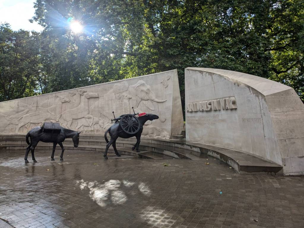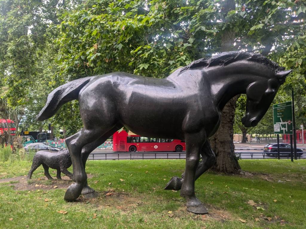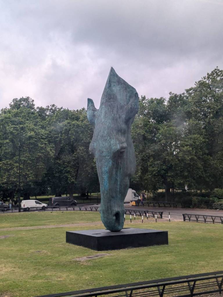 已經繞過了「海德公園」,看到了青銅雕塑–「馬臉」(Horse Head Statue),她豎立於「海德公園」的東南角,這是一位有名「英國雕塑家「尼克·菲迪安·格林」(Nic Fiddian-Green)的作品,高度10公尺,是座寧靜雄偉的馬頭,靈感來自「菲迪安·格林」對於古典馬術雕像與古希臘藝術的迷戀。