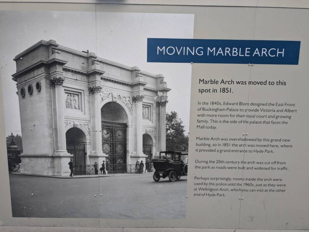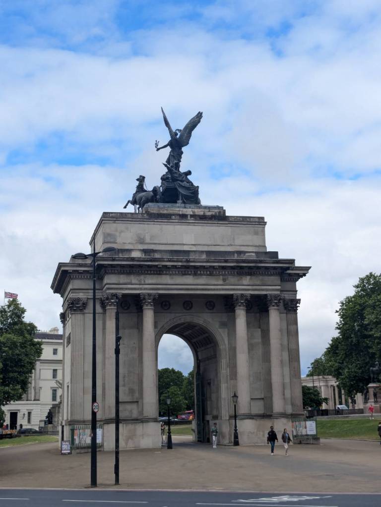 「威靈頓拱門」(Wellington Arch),從車窗看去,她是座既宏偉又巨大的雕塑,周遭的公園安靜又愜意。她本身的故事也是很豐富,最初被稱為「格林公園拱門」,由「戴西馬斯・柏頓」( Decimus Burton)於西元1825 年設計,本作為「白金漢宮」雄偉的入口,後來更名為「威靈頓拱門」,以紀念「威靈頓公爵」在「滑鐵盧戰役」中戰勝「拿破崙」。拱門高83英尺,擁有細緻精美的雕塑與浮雕,描繪了「拿破崙戰爭」的各種軍事勝利和場景,其頂部是一尊帶翼勝利者駕駛「四馬雙輪戰車」(Quadriga)的青銅雕像。因19世紀中葉交通擁堵之故,拱門略微移動至「海德公園」東南角的現址,一度被作為警察局與王室住所,20 世紀又曾是「倫敦警察博物館」的所在地。