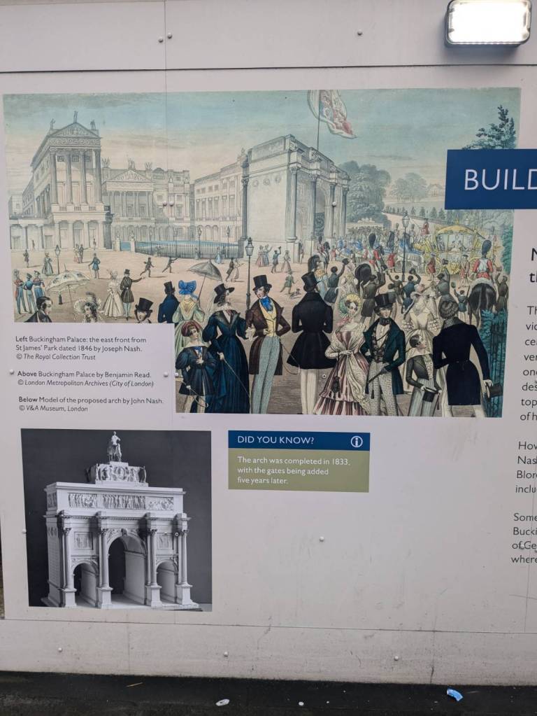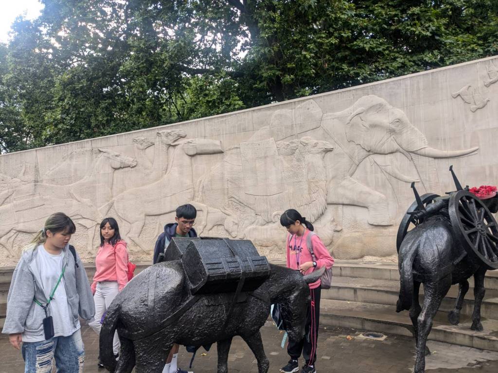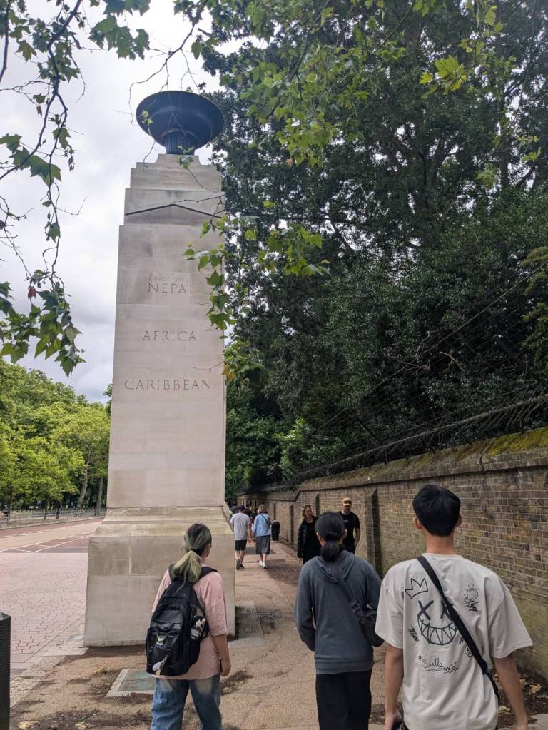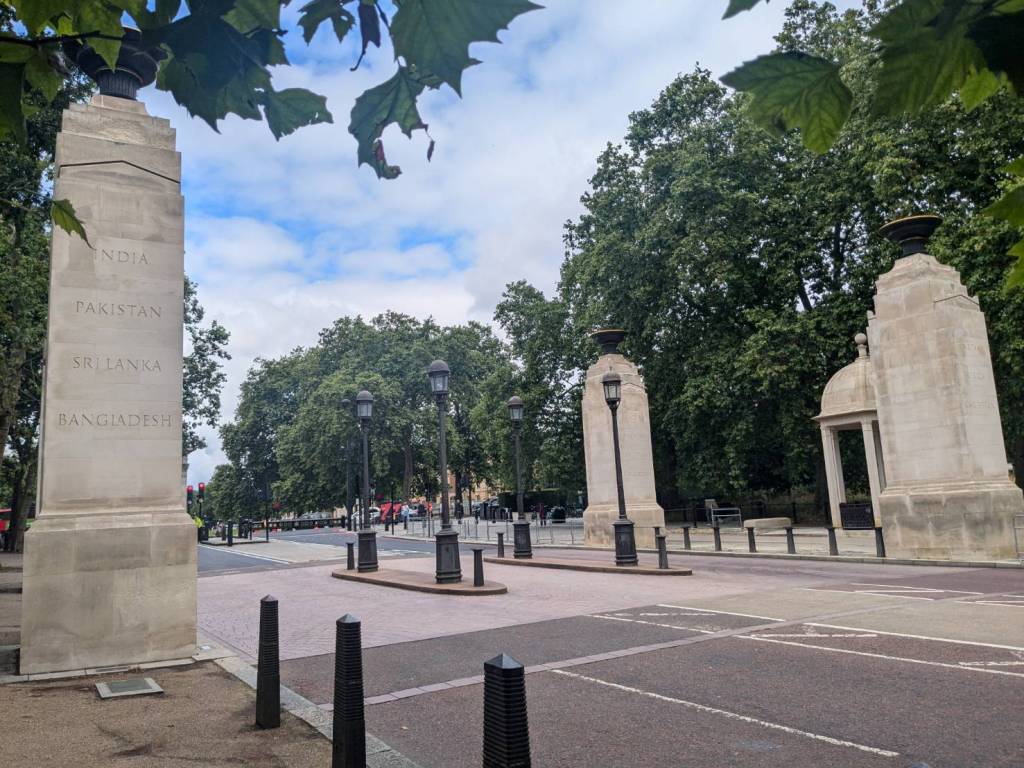 上午10點半下了公車,就隨著旅客人潮往「白金漢宮」前進,首先穿越「大英聯邦紀念門」(Commonwealth Memorial Gates),紀念碑是為了紀念來自南亞5個國家(印度、巴基斯坦、孟加拉、尼泊爾和斯里蘭卡)以及非洲、加勒比海地區的500萬參戰者於兩次世界大戰中與英國士兵併肩作戰的事蹟。