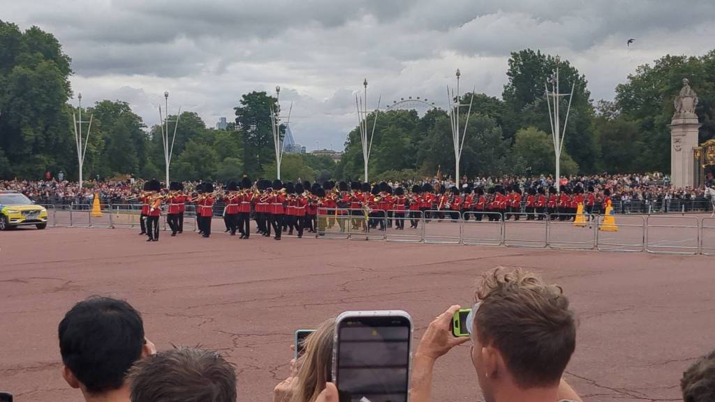 上午10點50分,衛兵隊伍出現,新的衛兵是從「威靈頓軍營」出發,而即將換崗的衛兵則與來自「聖詹姆斯宮」(St. James Palace)的衛兵會合。