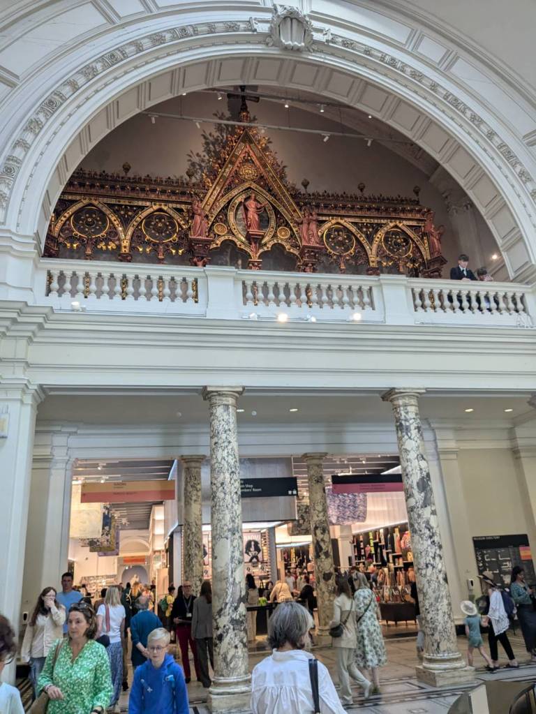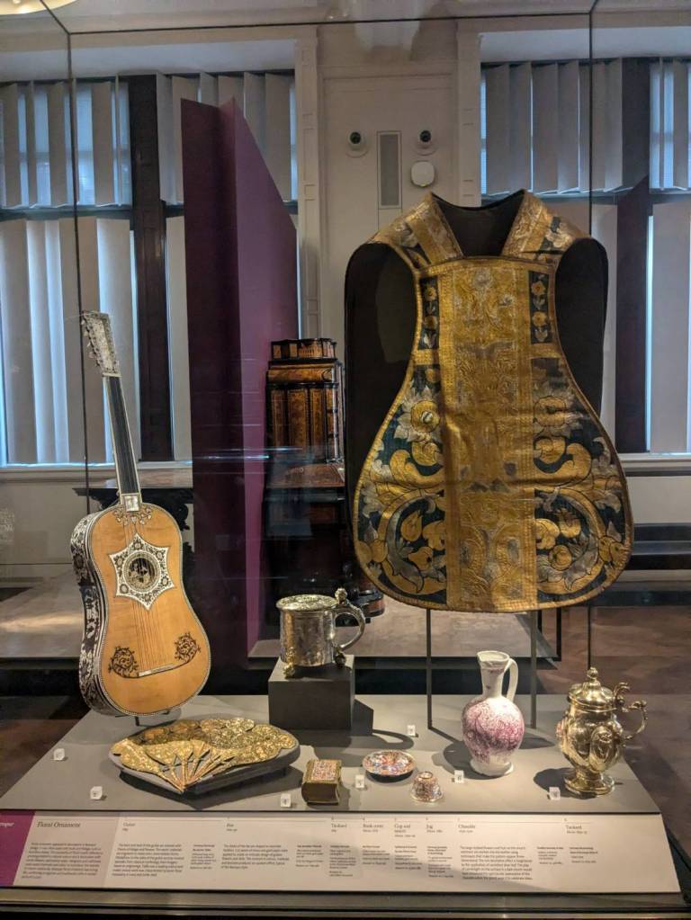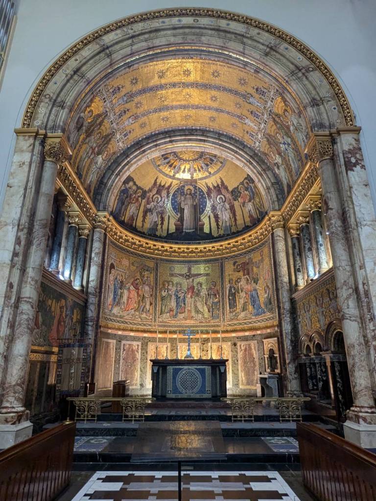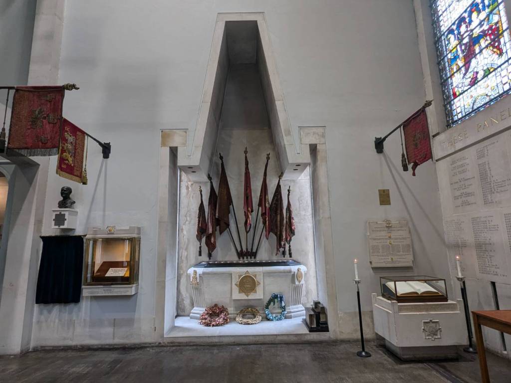 教堂的天花板非常高,各面牆上掛著非常古老、具有歷史意義的旗幟,這些旗幟來自各個軍團,而他們都是保護英國君主的「步兵衛隊」(foot guards)。