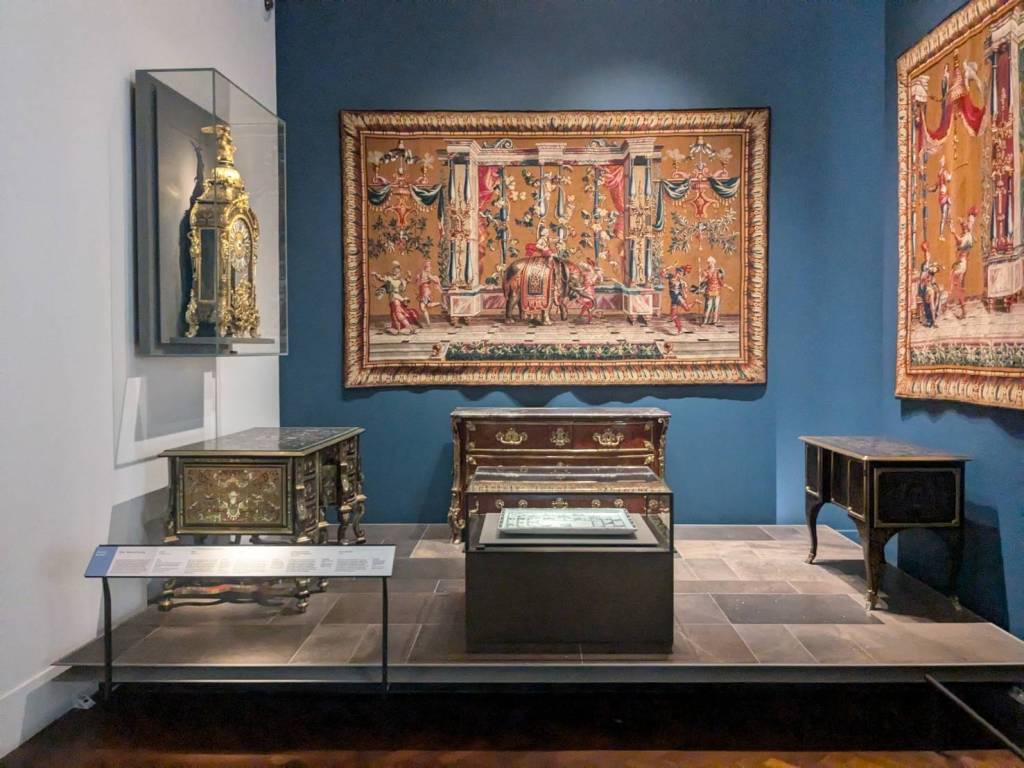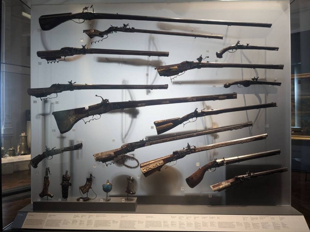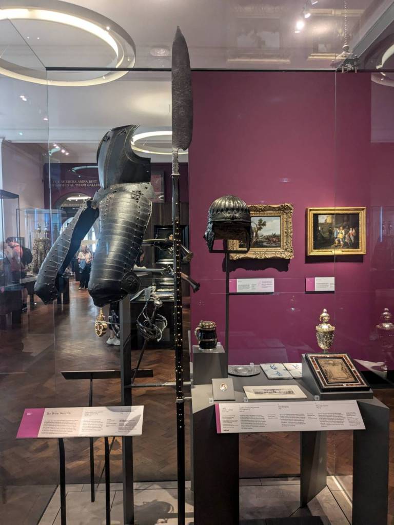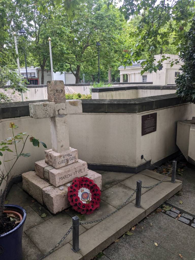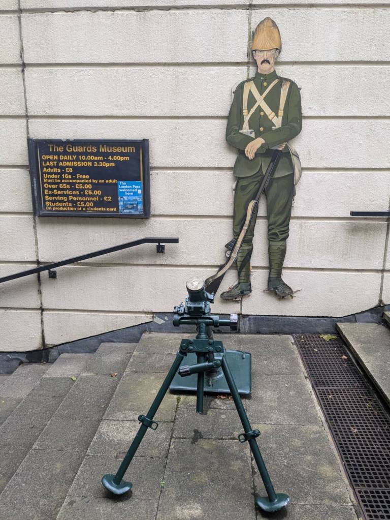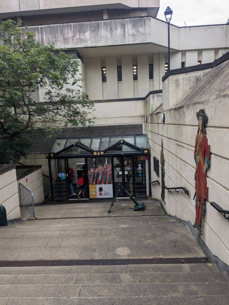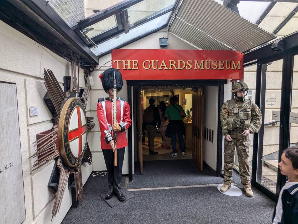 往裡面右邊走下階梯是「衛兵博物館」(The Guards Museum),有提供導覽與解說,訪客可透過詳細的展覽瞭解「步兵衛隊」及「皇家近衛騎兵」的歷史。這裡人潮比較少,裡面禁止拍照,所以只能拍些外部展示。裡面詳細介紹了五個團的地位與制服差異。「冷溪近衛軍」(the Coldstream guards)是最古老的軍團(成立於1650年),而「擲彈兵近衛軍」(the Grenadier guard)則成立於1656年,是資歷最高的,因為他們是第一支為皇家服役的軍團。第三高級的是「蘇格蘭衛兵」(the Scots Guards),其次是「愛爾蘭衛兵」(t the Irish Guards),最後是「威爾斯衛兵」(the Welsh guards)。您也可以透過制服上紐扣的配置來辨別哪個團,例如,「蘇格蘭衛隊」的紐扣三顆為一組,所以是排第三。本博物館說明了「近衛軍」在「滑鐵盧」及「福克蘭」等各場戰爭與戰鬥中的作用。