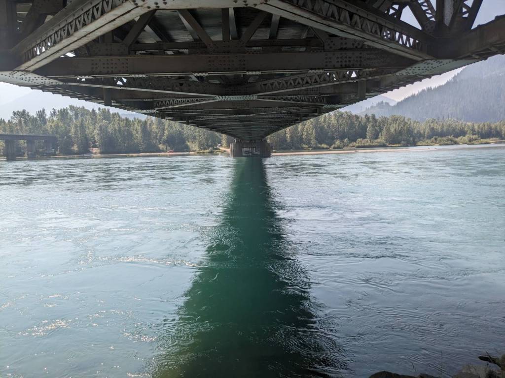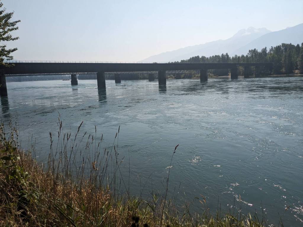 近處那一座是「鐵路橋」(Revelstoke Railroad Bridge),後面那一座是散步與單車使用的「大艾迪橋」(Big Eddy Bridge),從這角度望去交疊在一起。遠方的「貝格比山」(Mount Begbie)上存在有久年未融的冰河。